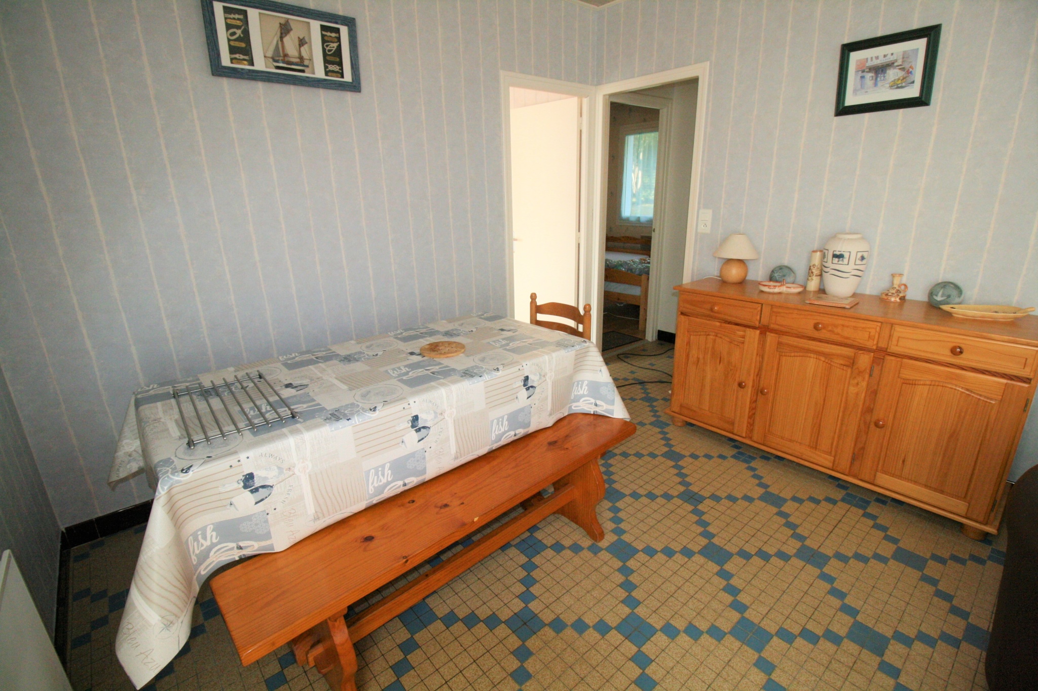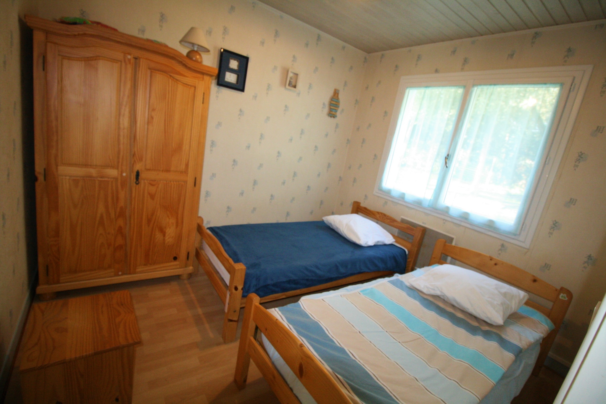 1 cuisine, 1 salle à manger, 1 chambre avec 1 lit de 140, 1 chambre avec 2 lits de 80, salle d'eau (douche, lavabo), wc. Stationnement voiture sur le terrain.