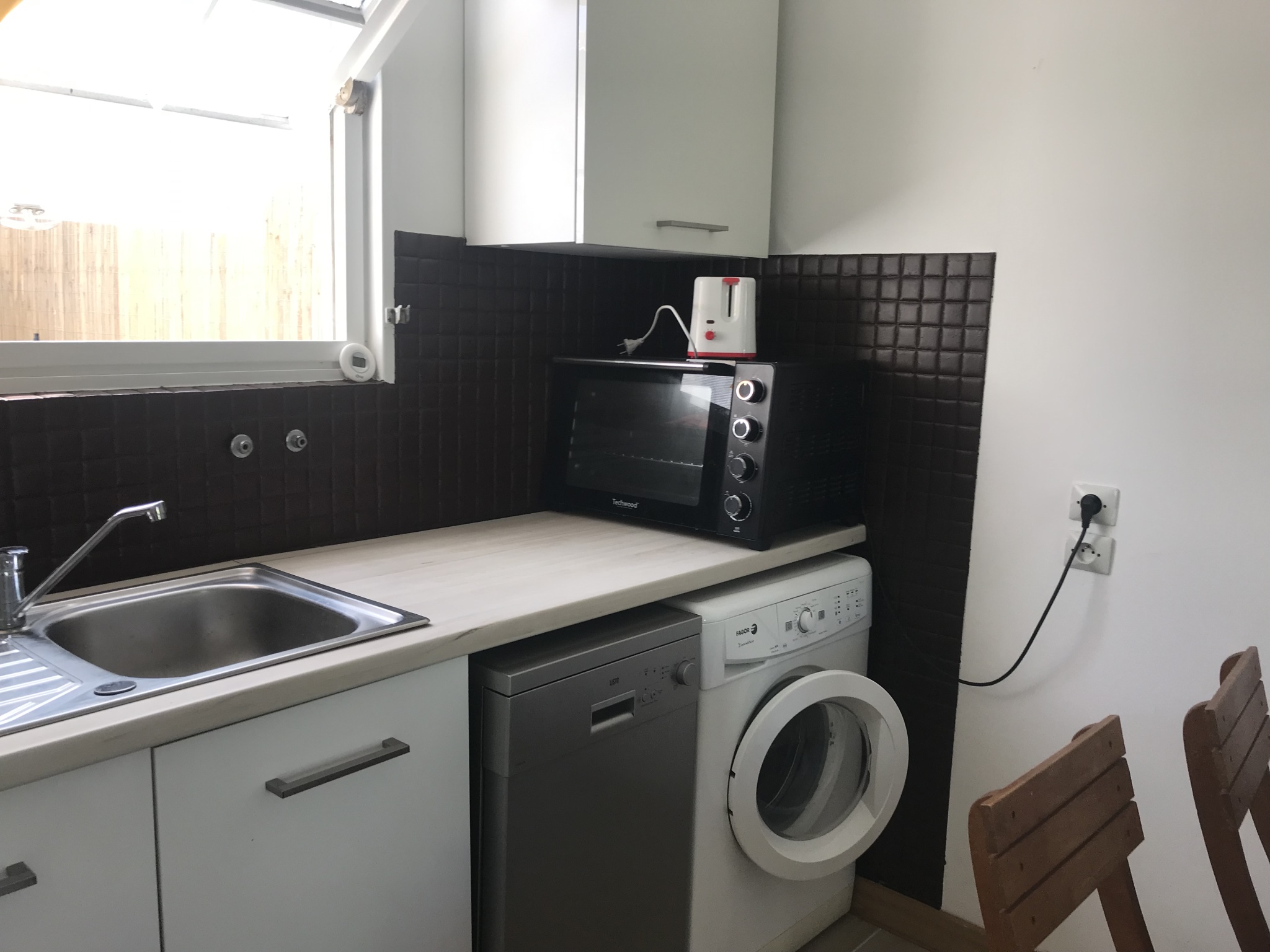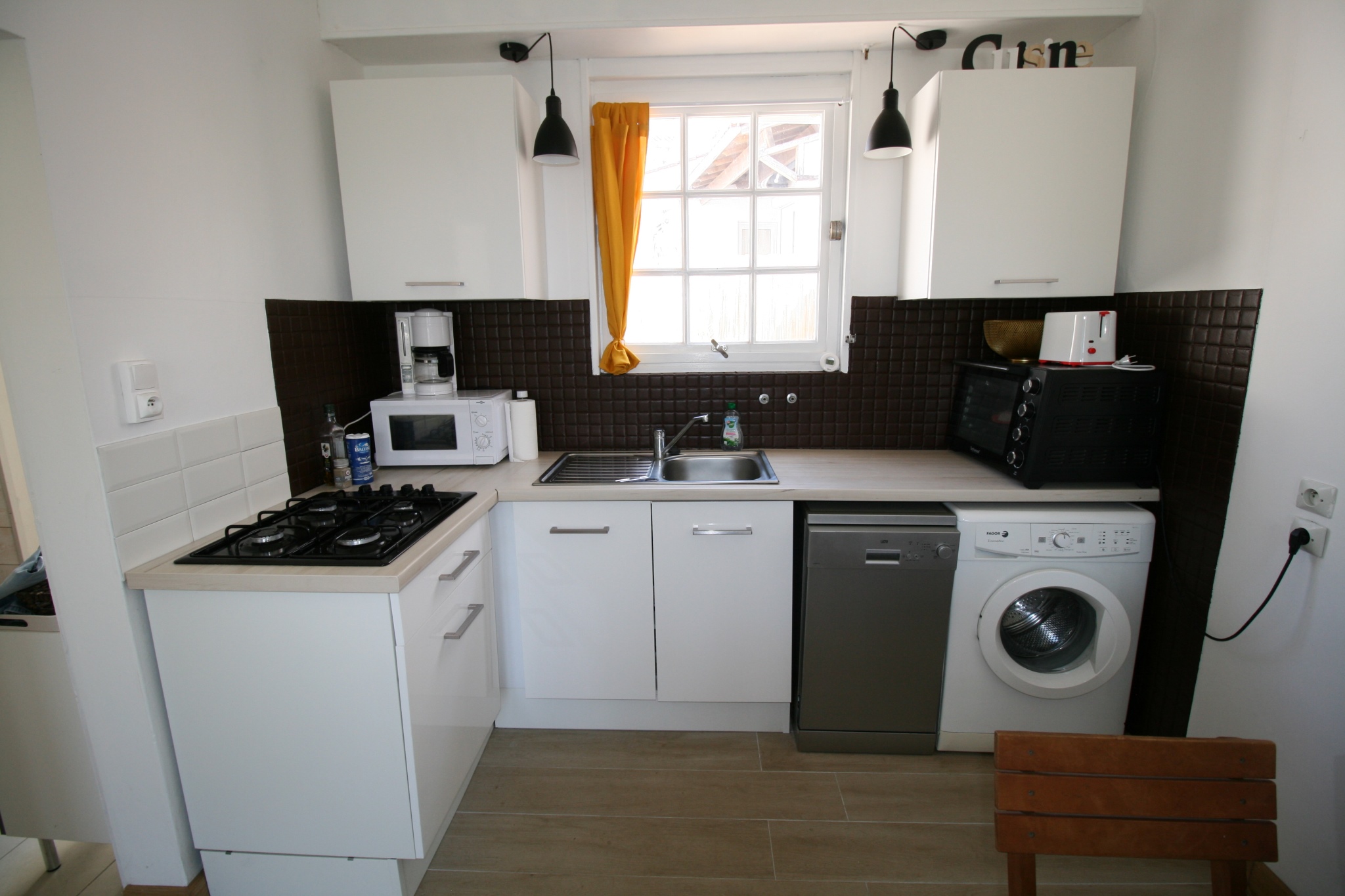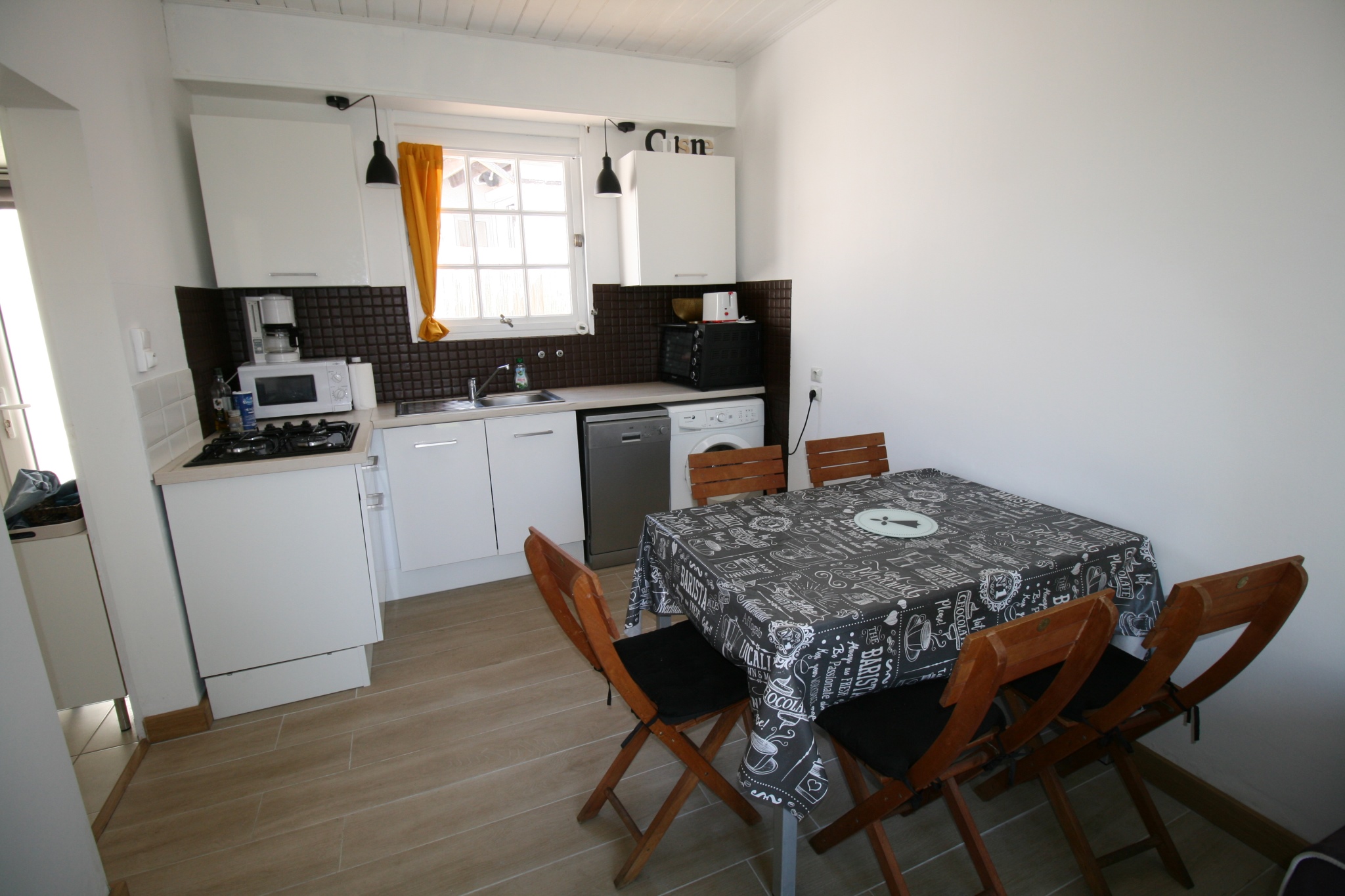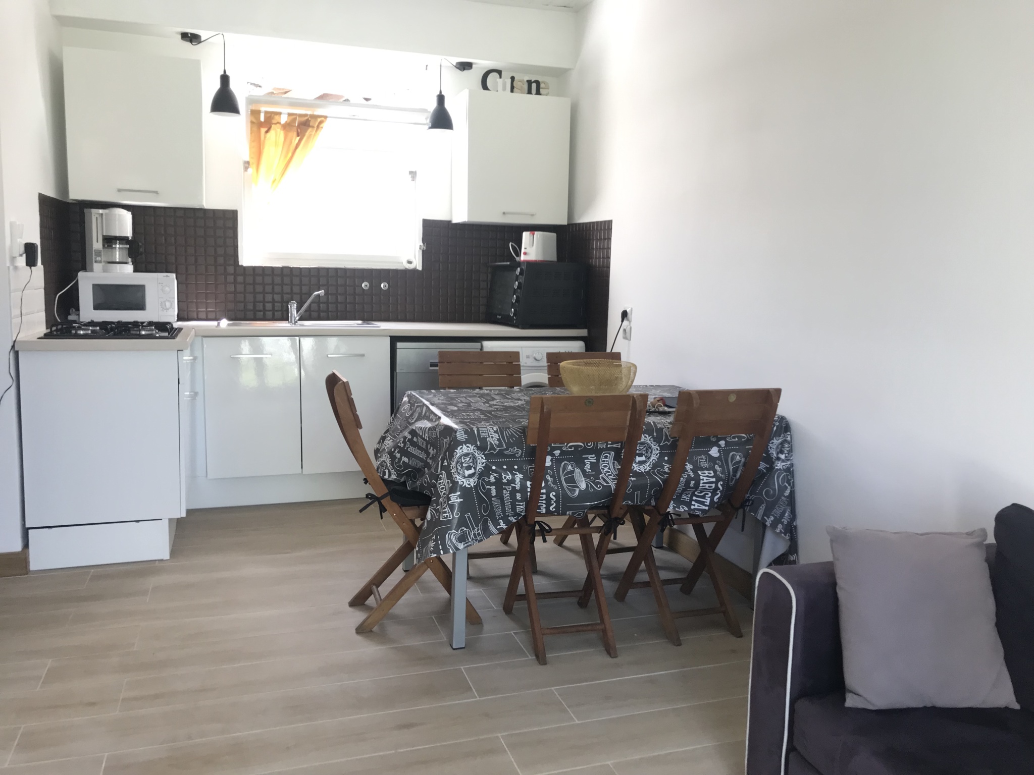 Equipements : lave linge, lave vaisselle, 1 four ordinaire, 1 micro ondes, caf. électrique, 1 bouilloire, grille pains, 1 réfrigérateur-congélateur, 1 aspirateur, 4 feux gaz, télévision, 1 lit parapluie pour bébé. 1 siège bébé qui s'adapte sur la chaise.