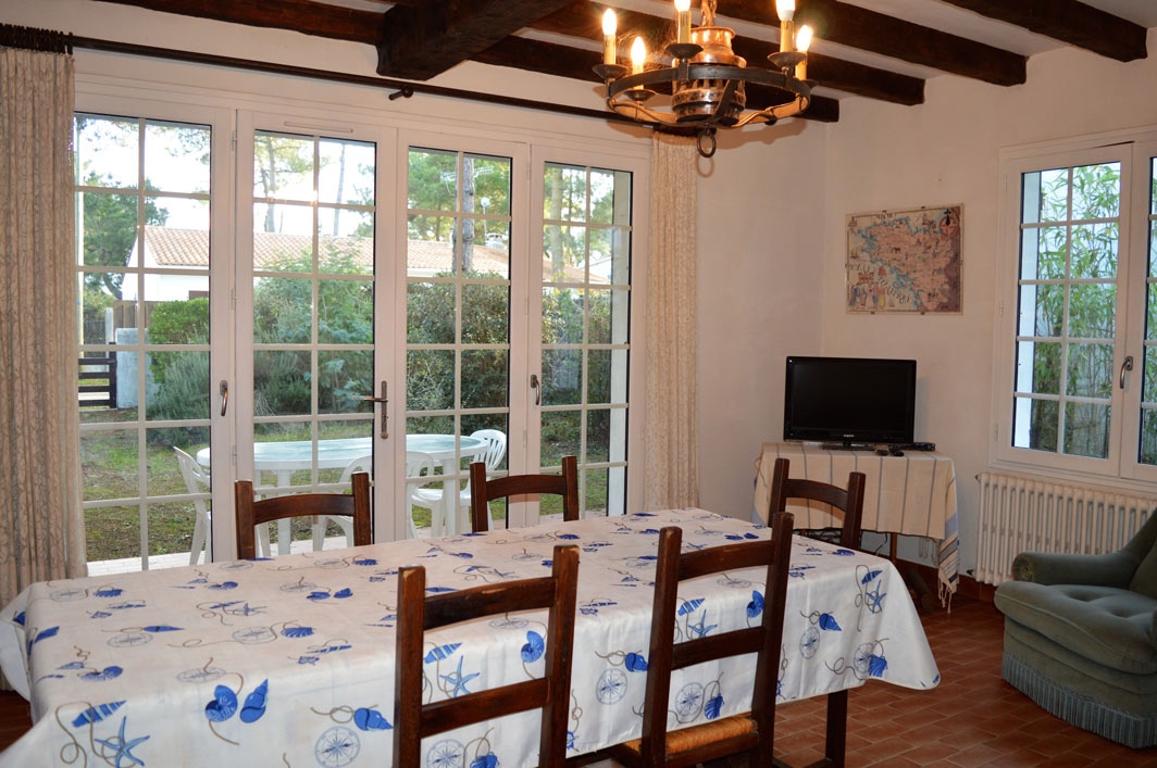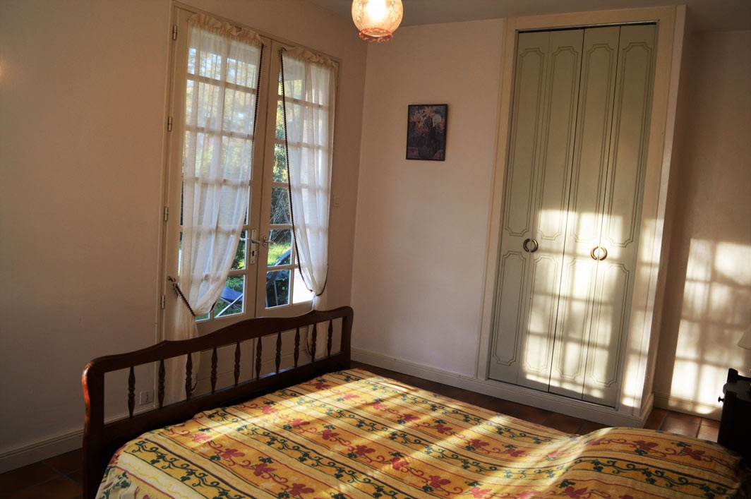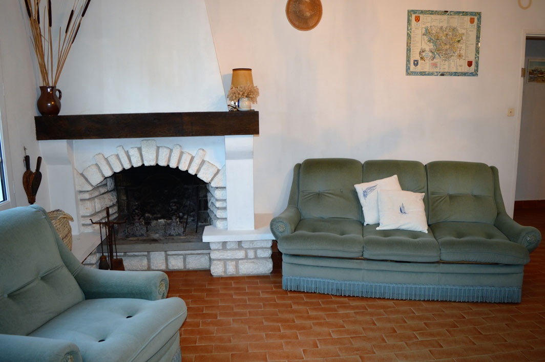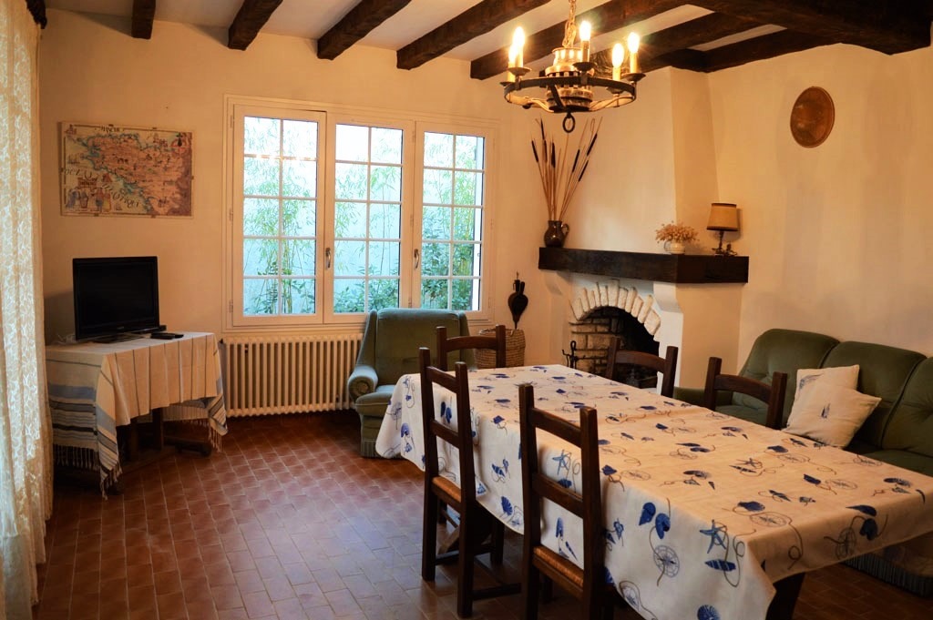 Agencement : 1 grand séjour-salon, avec cheminée (uniquement décorative) et TV écran plat (TNT) ouvrant sur la terrasse, à l'avant de la maison - 1 cuisine équipée (cuisinière à 4 plaques : 3 gaz et 1 électrique, four, micro-ondes, réfrigérateur-conservateur, lave-vaisselle et lave-linge) - 1 couloir desservant 3 chambres : 2 avec 1 lit 2 pers. (140) et 1 avec 1 lit 1 pers. (+ 1 lit pliant d'appoint 1 pers.), 1 salle d'eau avec WC, 1 salle de bains (bidet, baignoire, lavabo) et 1 WC séparé - 1 garage servant de rangement.
