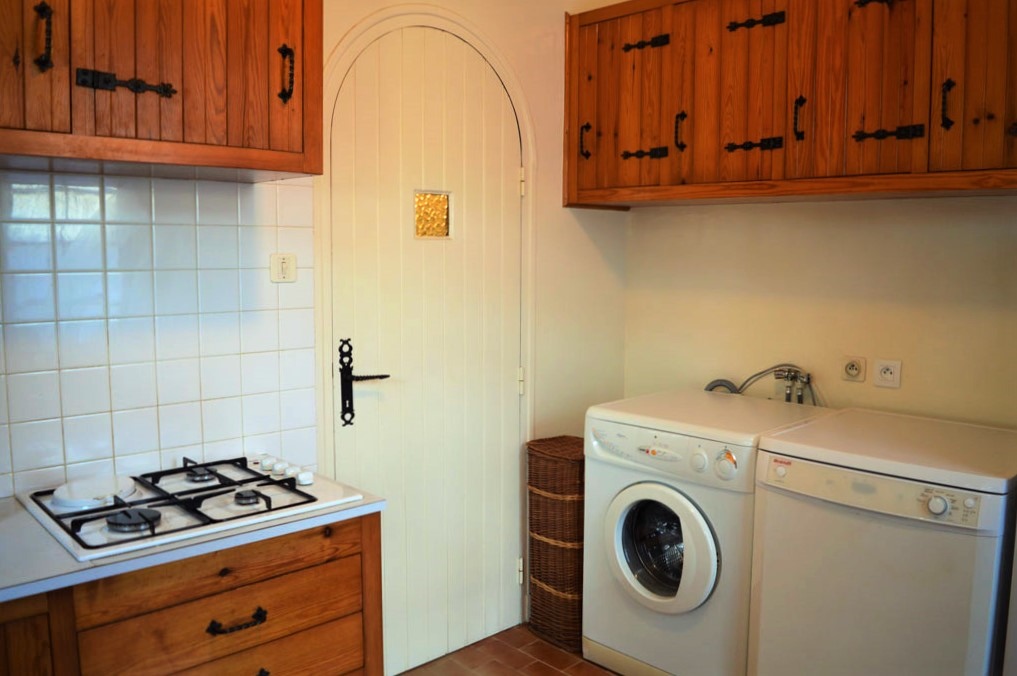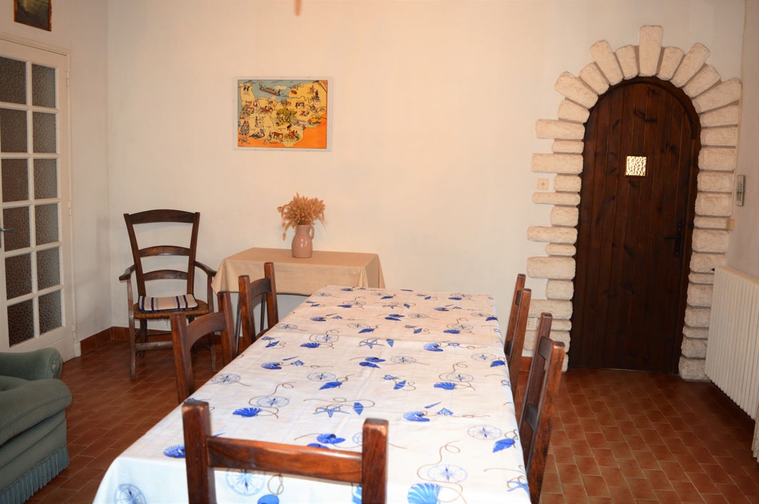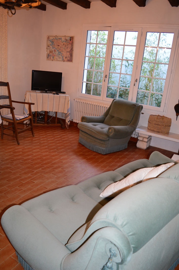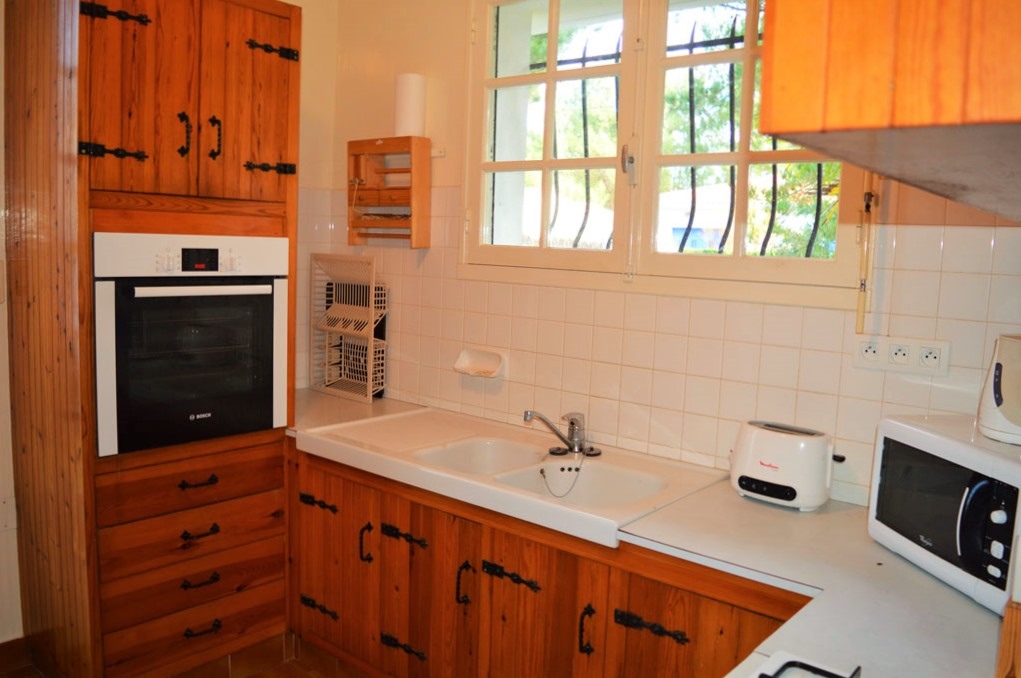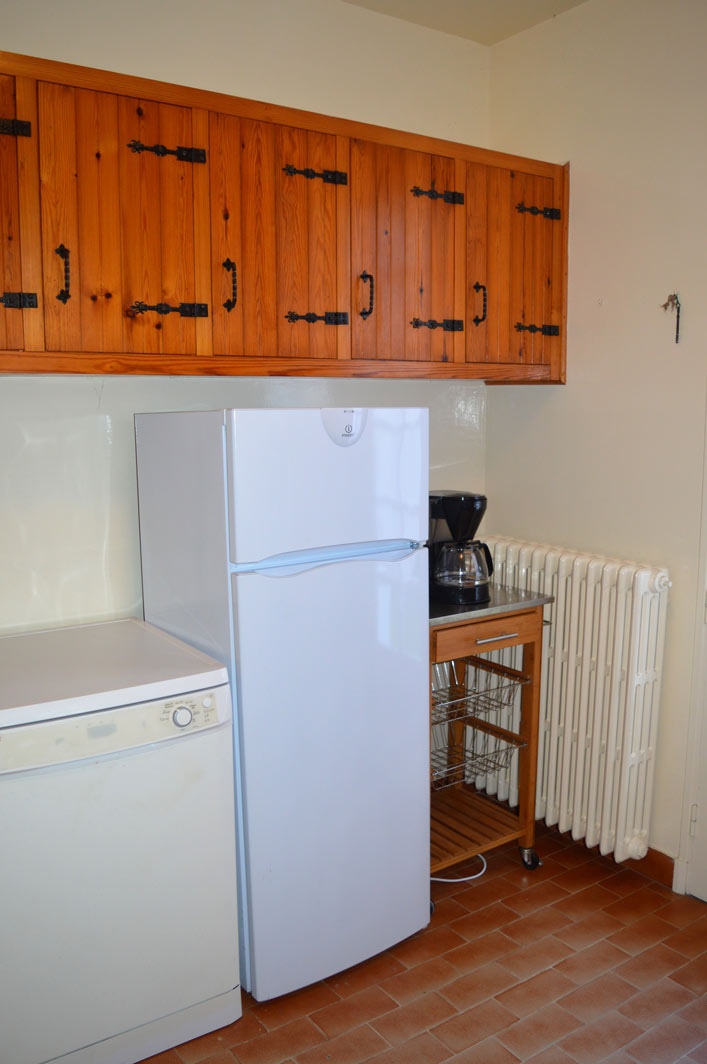 Agencement : 1 grand séjour-salon, avec cheminée (uniquement décorative) et TV écran plat (TNT) ouvrant sur la terrasse, à l'avant de la maison - 1 cuisine équipée (cuisinière à 4 plaques : 3 gaz et 1 électrique, four, micro-ondes, réfrigérateur-conservateur, lave-vaisselle et lave-linge) - 1 couloir desservant 3 chambres : 2 avec 1 lit 2 pers. (140) et 1 avec 1 lit 1 pers. (+ 1 lit pliant d'appoint 1 pers.), 1 salle d'eau avec WC, 1 salle de bains (bidet, baignoire, lavabo) et 1 WC séparé - 1 garage servant de rangement.
