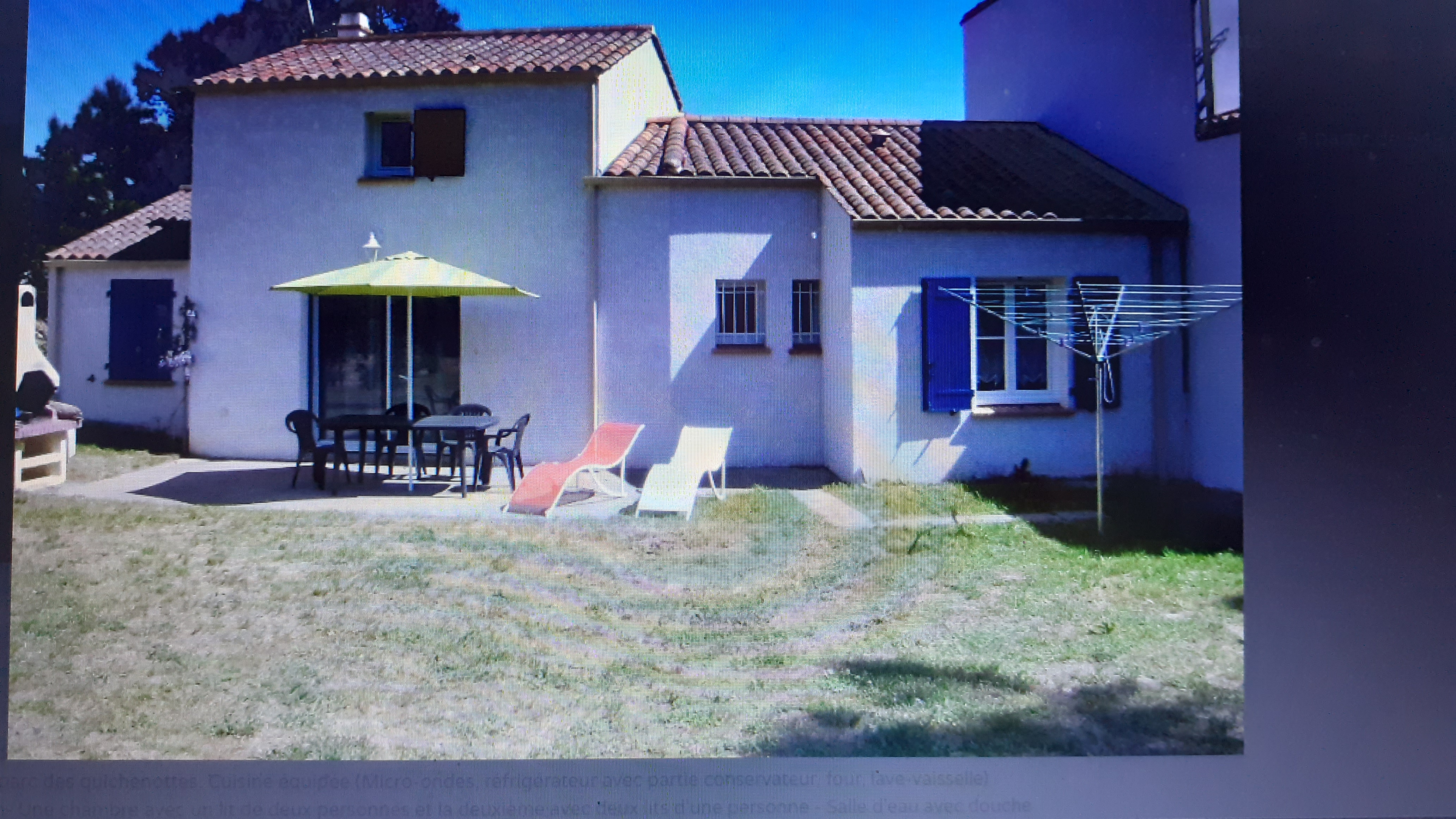 Equipements : télévision, lave vaisselle, cuisinière avec plaque gaz, four électrique, micro ondes, réfrigérateur-congélateur, cafetière, table et fer à repasser, lave linge, barbecue, vaisselle couverts...salon de jardin, emplacement voiture.