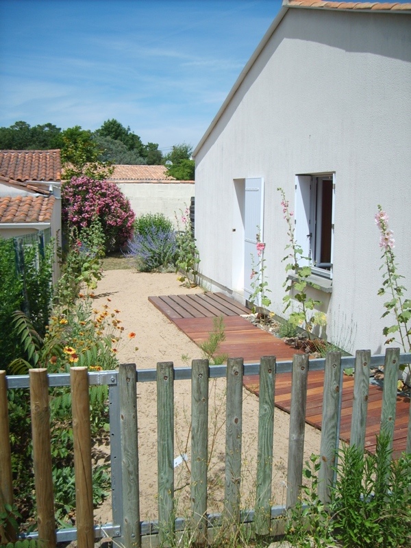Extérieur : terrasse avec salon de jardin et barbecue . jardin clos . Parking privatif sur terrain individuel.