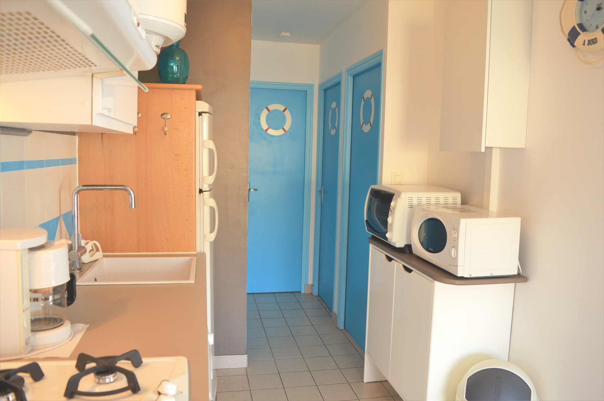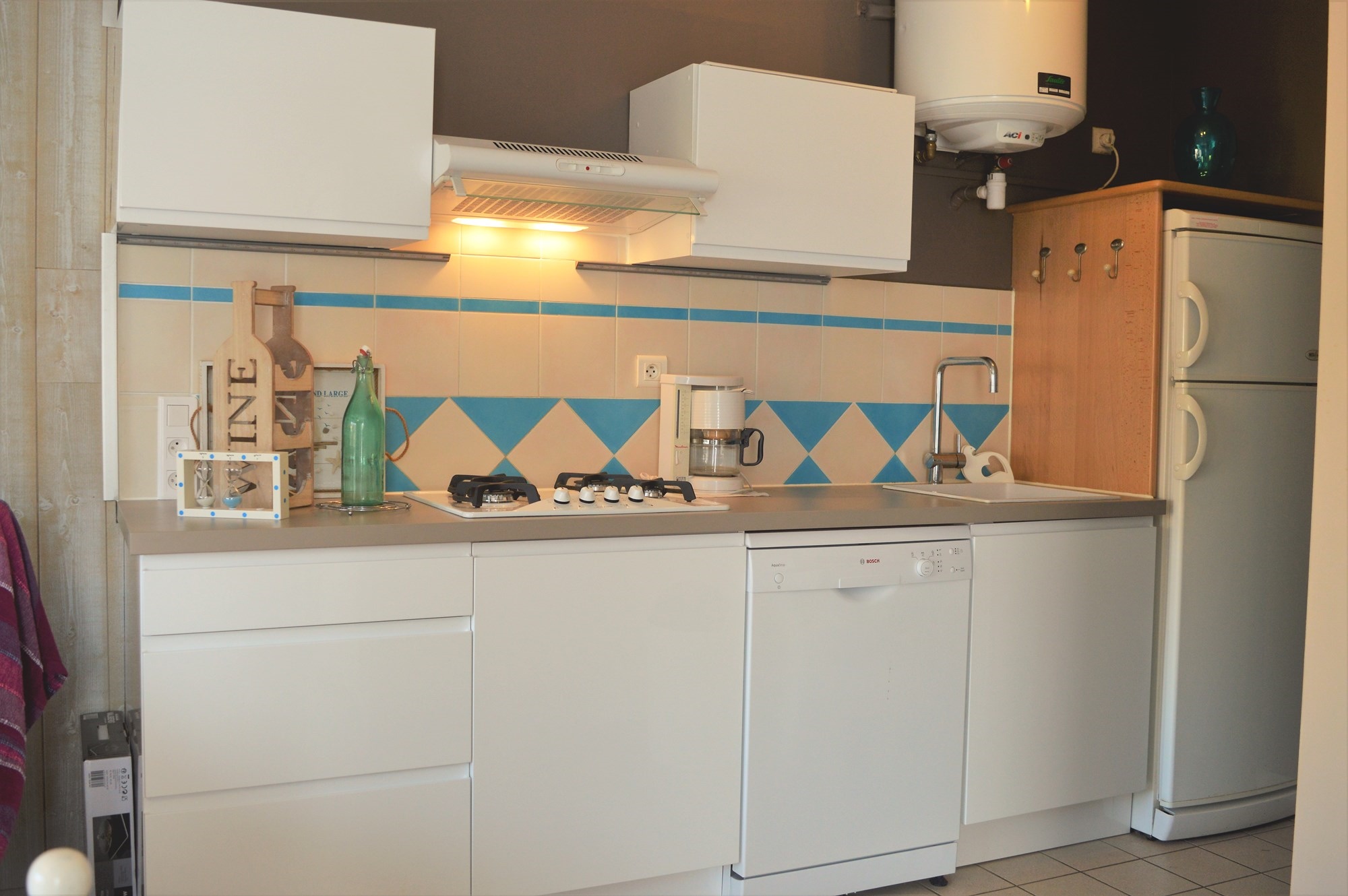 -> un coin cuisine équipée avec plan de travail (gazinière à 4 feux, hotte, four, micro-ondes, lave-vaisselle et réfrigérateur 2 portes avec compartiment congélateur),