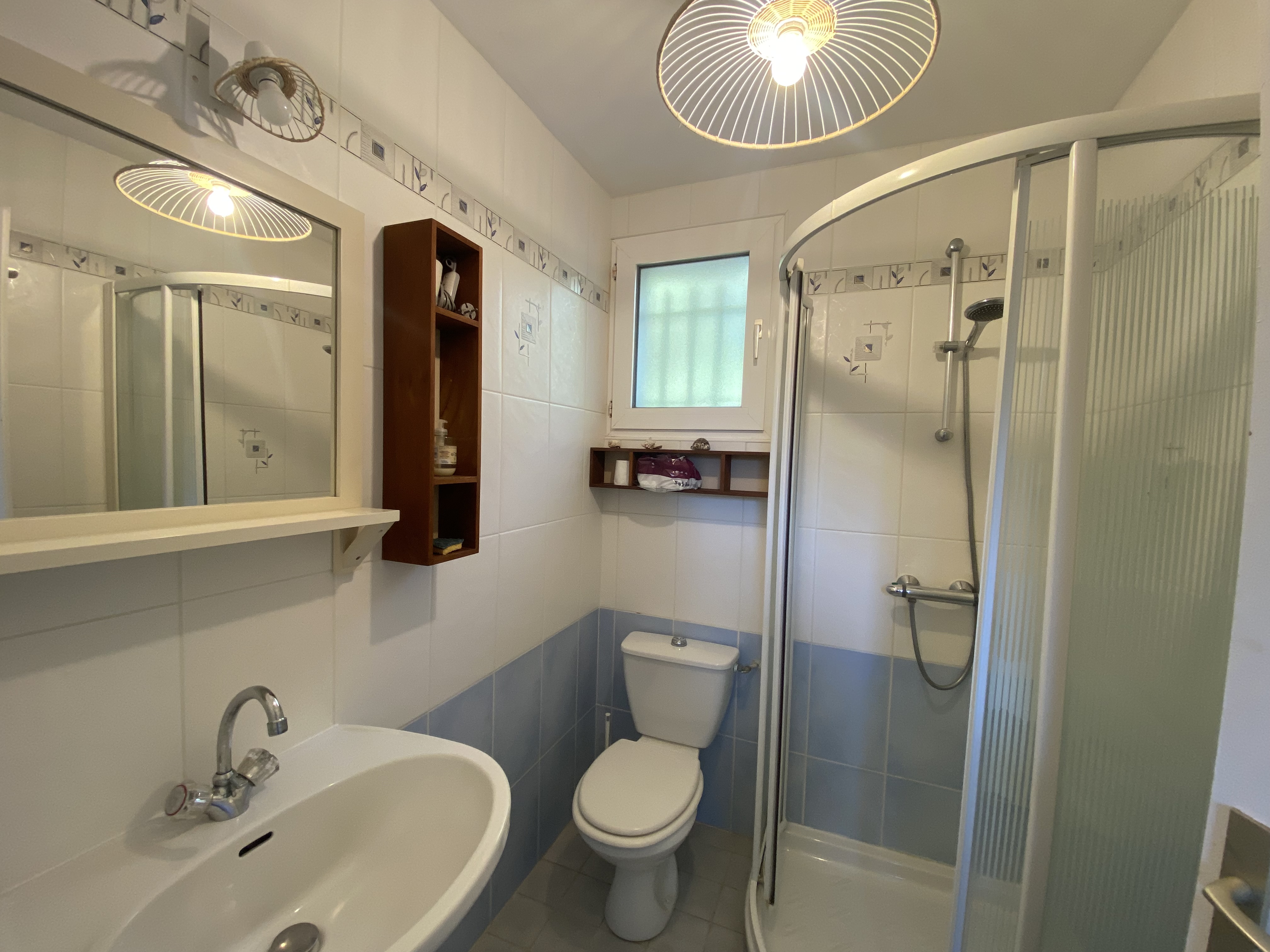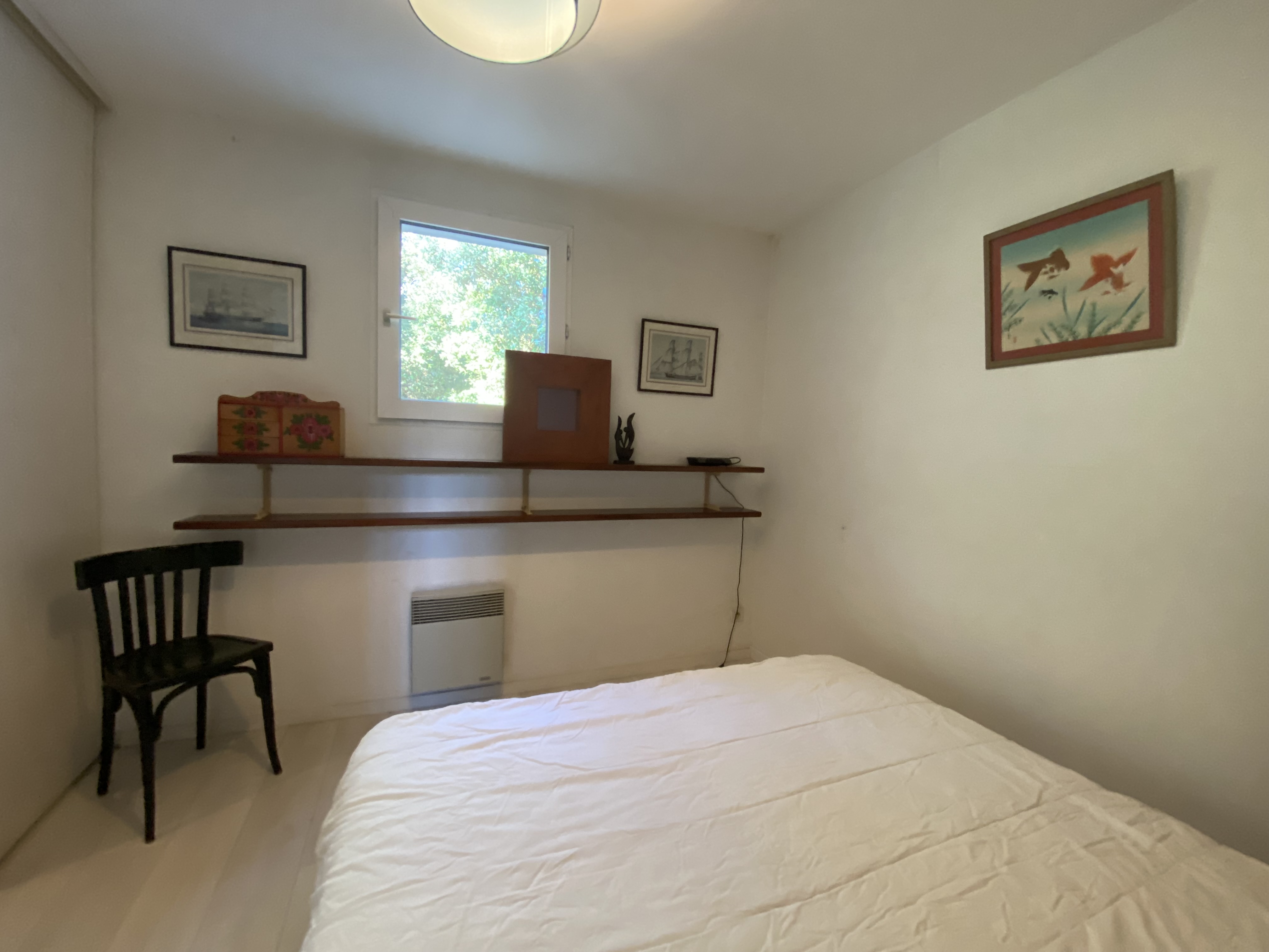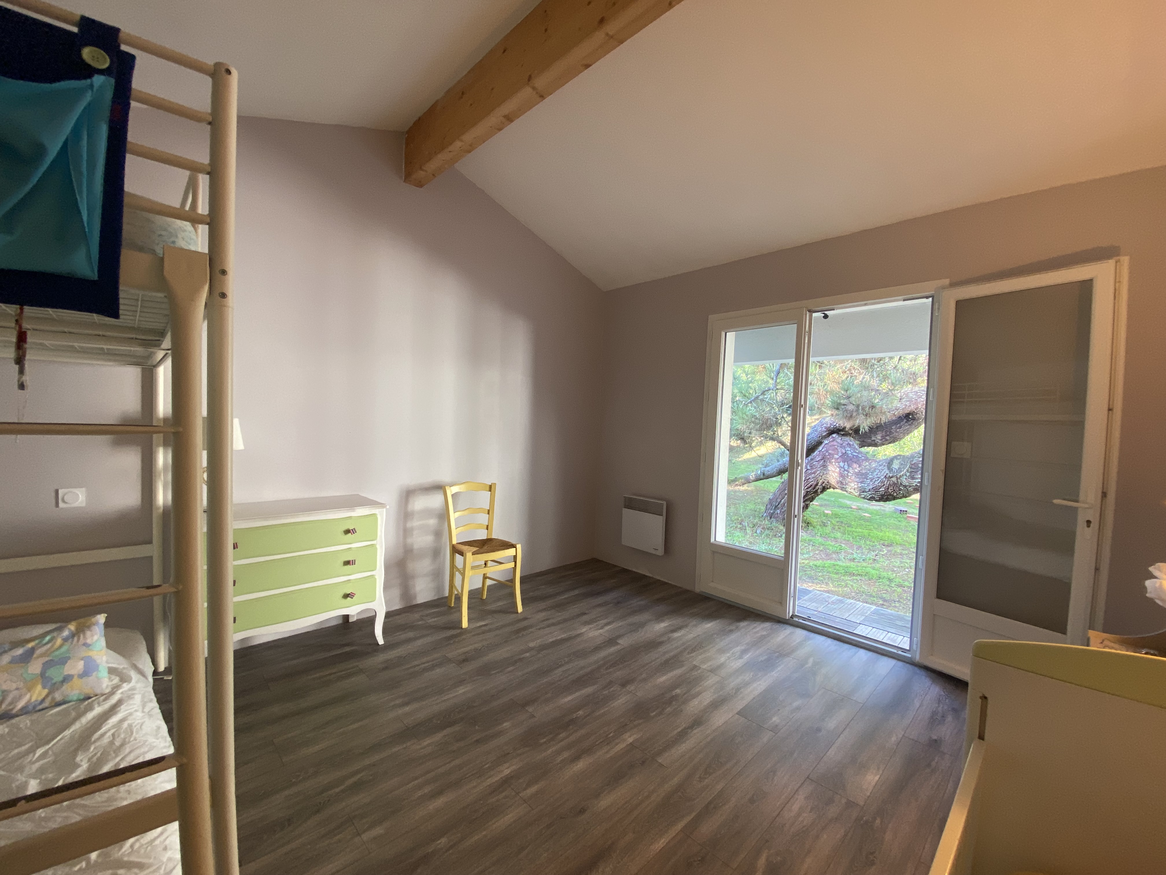 Rez de chaussée : séjour - coin cuisine lumineux exposition plein sud, des grandes baies vitrées ouvrantes sur terrasse ombragée avec mobilier d'extérieur. 2 chambres communicantes chacune avec un accès sur la terrasse : 1 chambre avec 1 lit superposé 140 en hauteur, 1 chambre avec 1 lit 140, 1 salle de bains avec 1 baignoire, 1 lavabo. 1 wc. séparé.