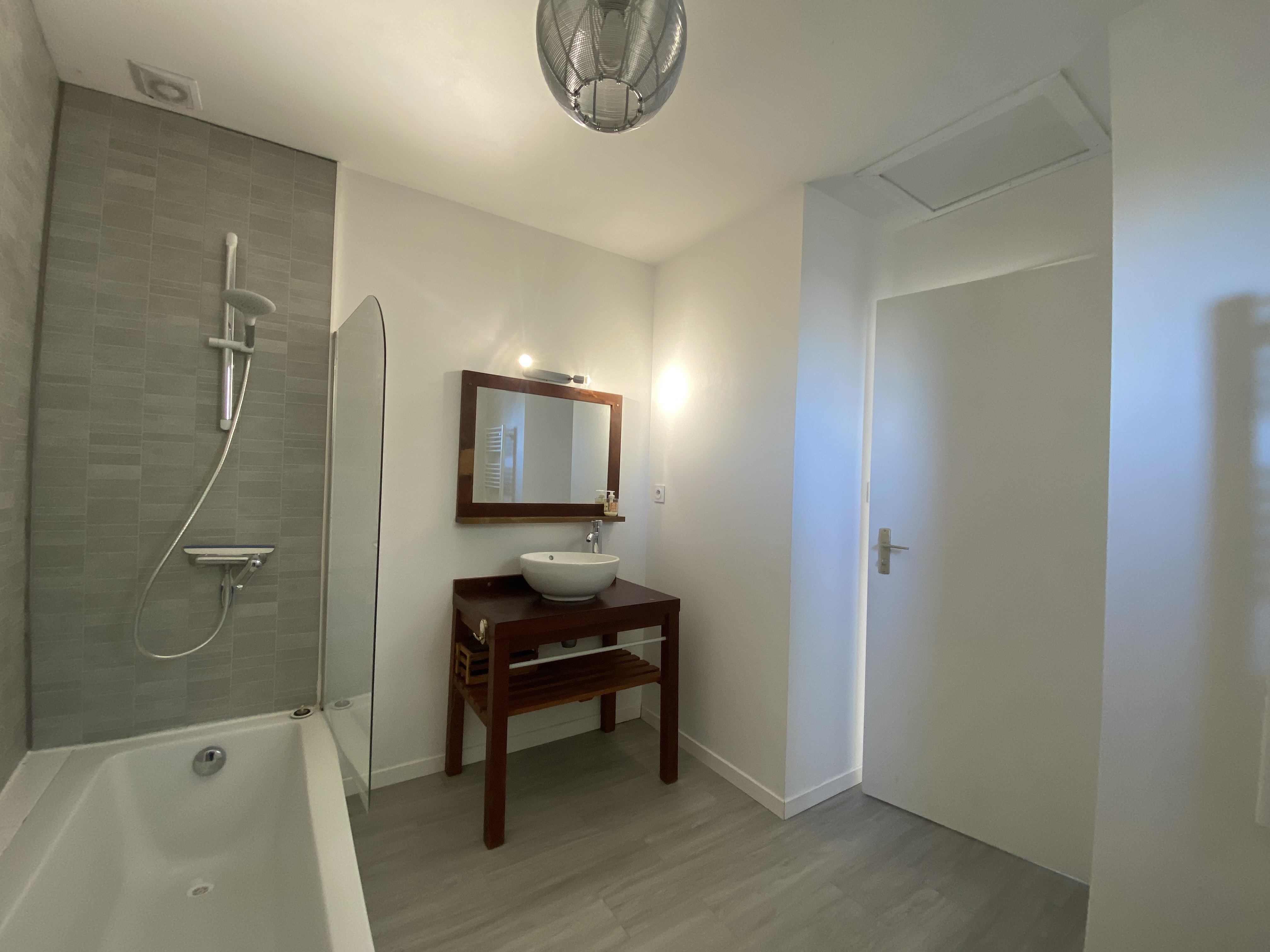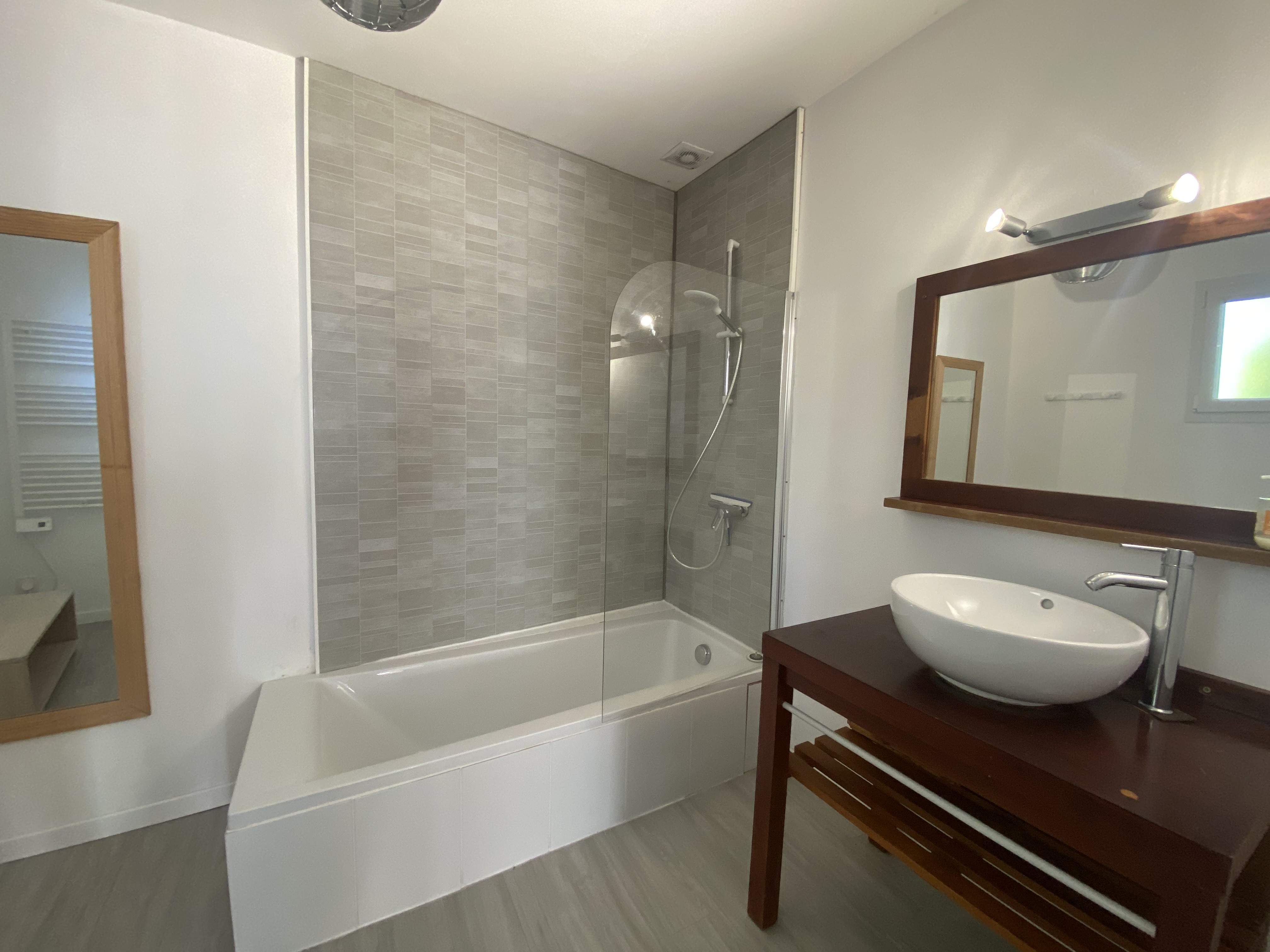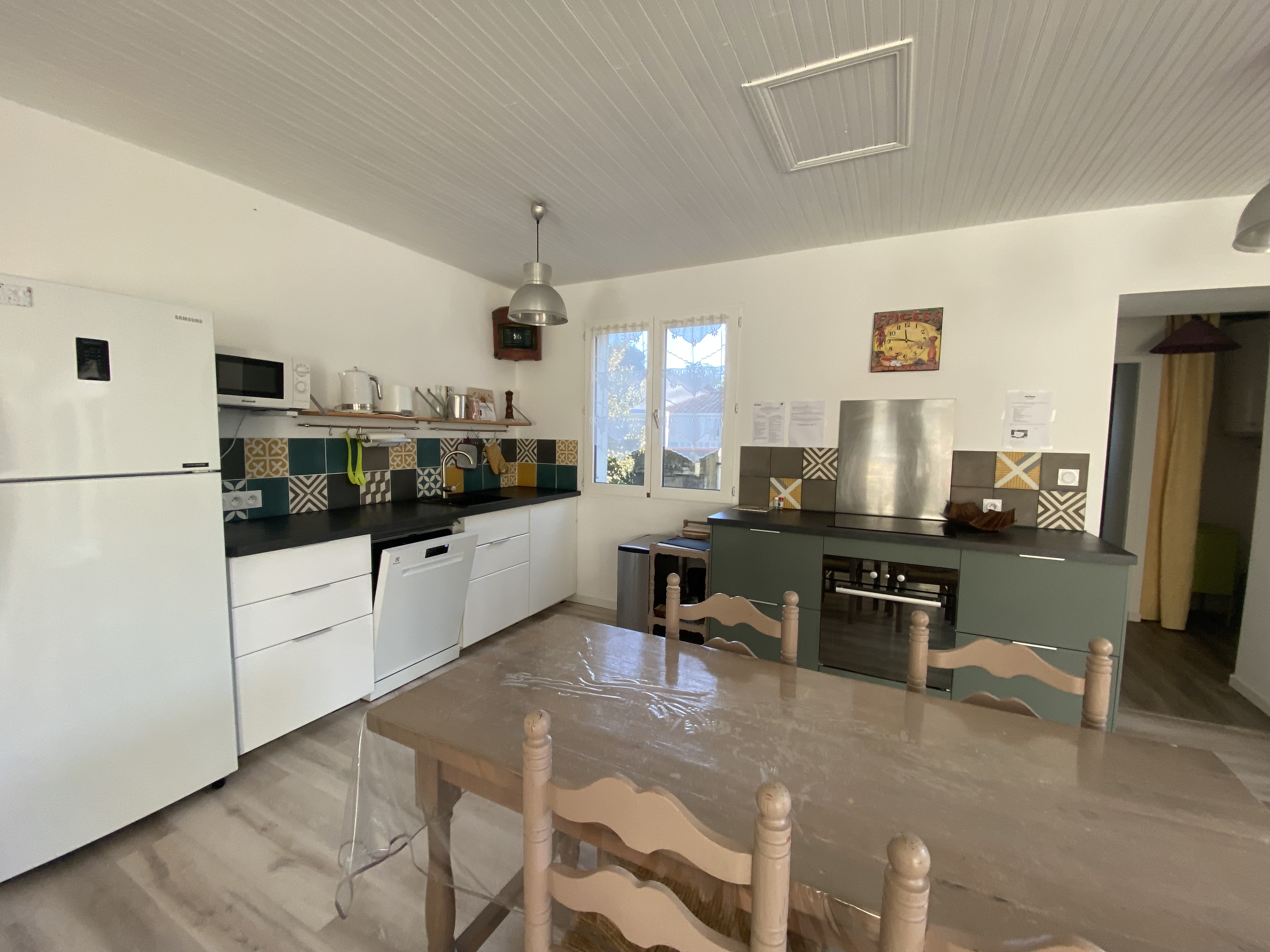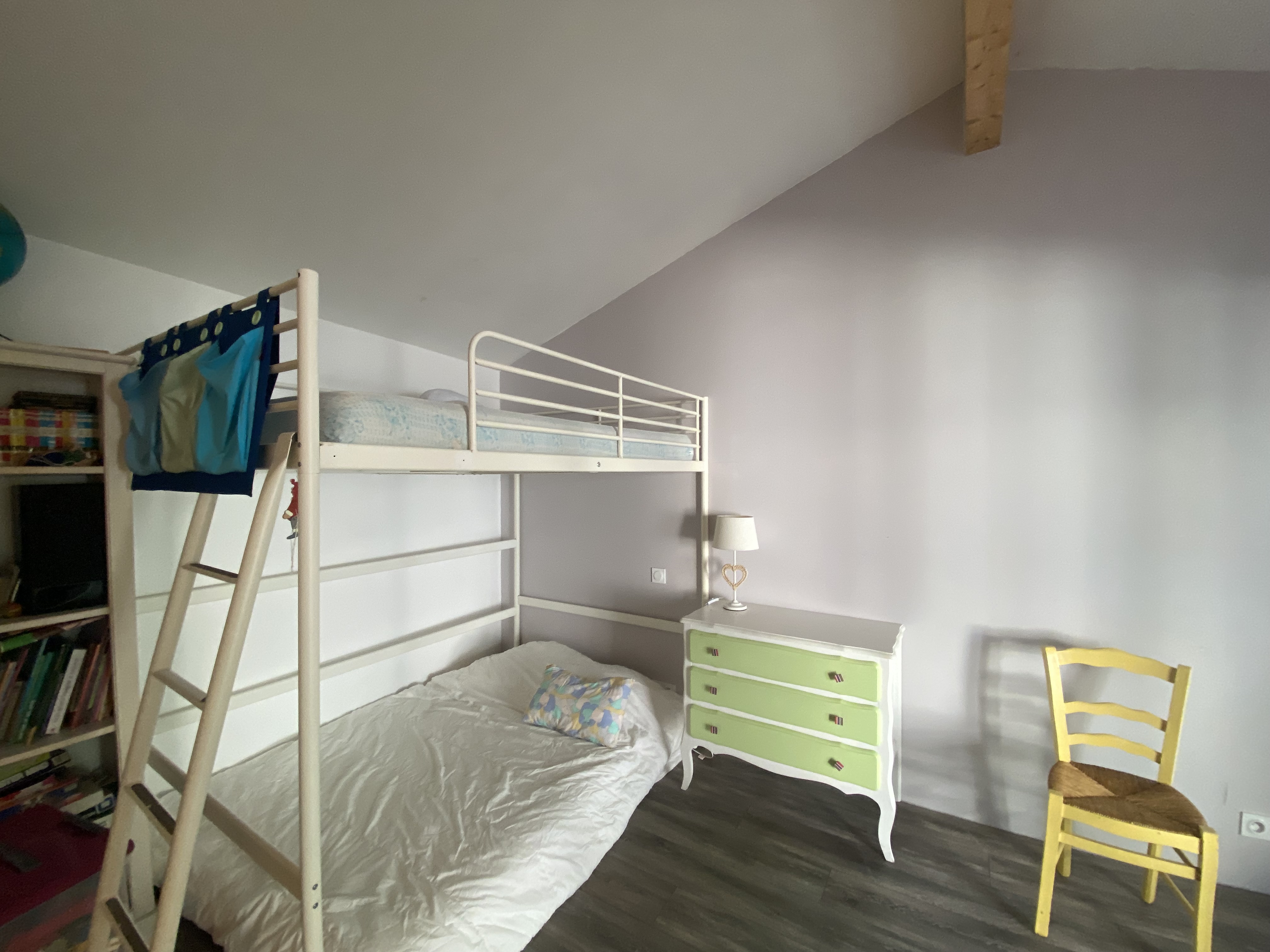 Rez de chaussée : séjour - coin cuisine lumineux exposition plein sud, des grandes baies vitrées ouvrantes sur terrasse ombragée avec mobilier d'extérieur. 2 chambres communicantes chacune avec un accès sur la terrasse : 1 chambre avec 1 lit superposé 140 en hauteur, 1 chambre avec 1 lit 140, 1 salle de bains avec 1 baignoire, 1 lavabo. 1 wc. séparé.