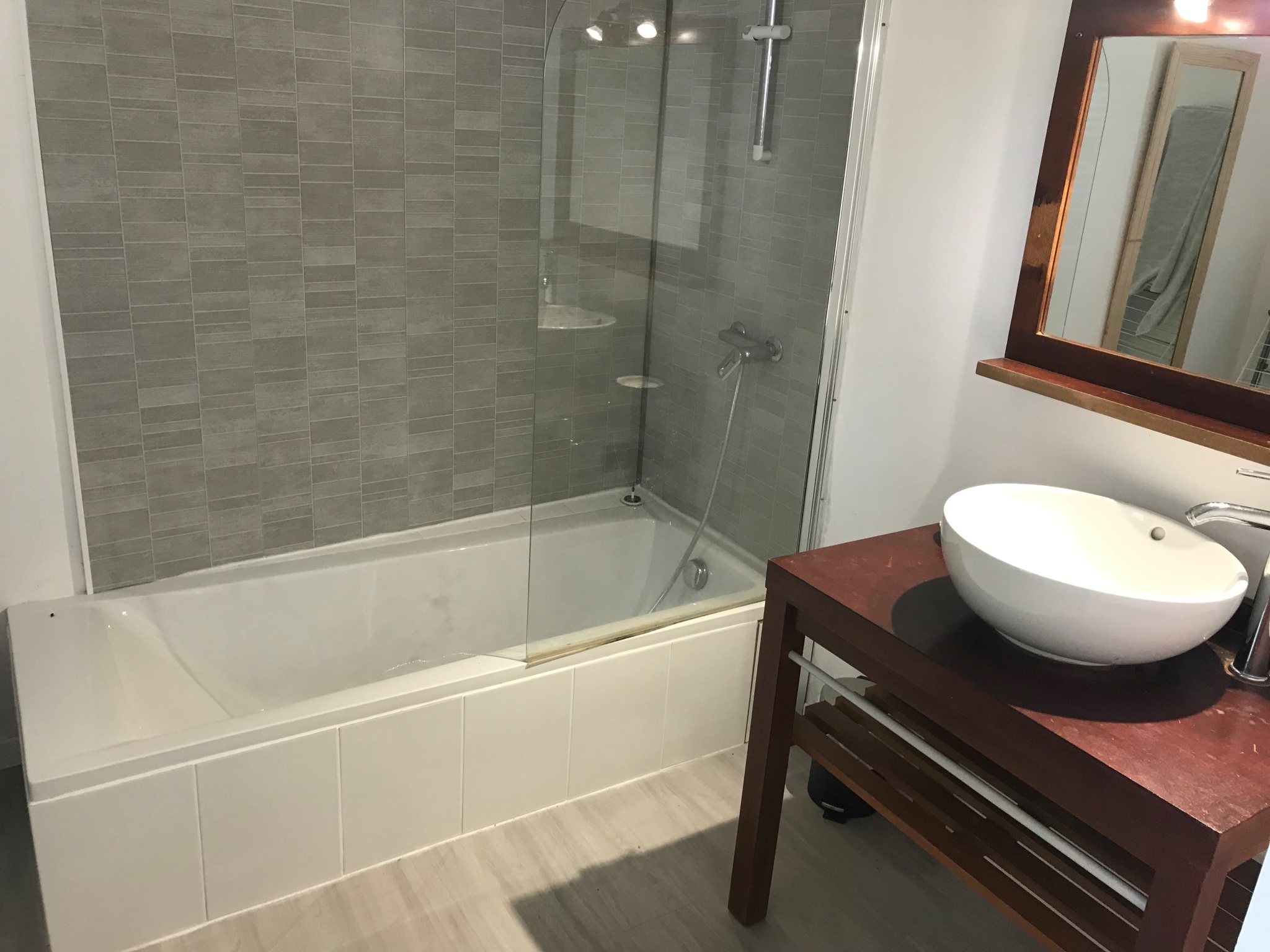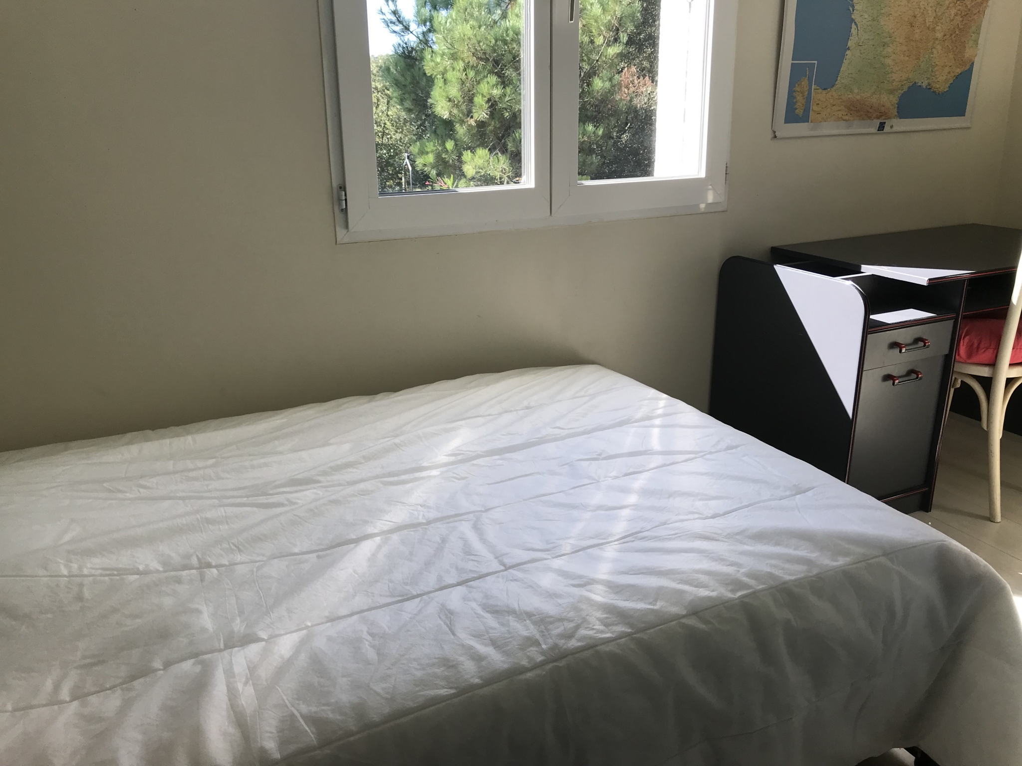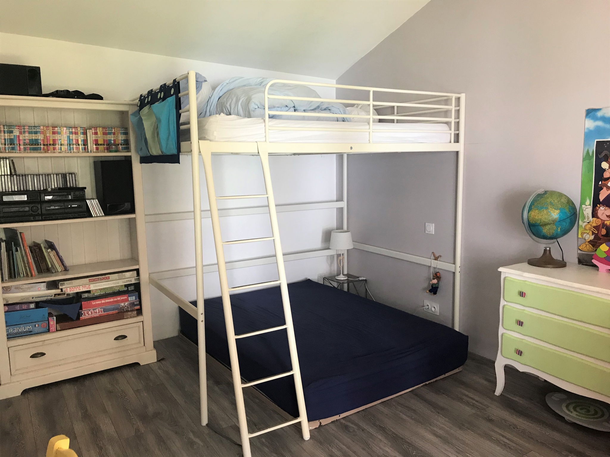 1 séjour - coin cuisine donnant sur terrasse avec salon de jardin, 1 couloir desservant 2 chambres en enfilade, 1 chambre avec 1 lit superposé 140 en hauteur, 1 chambre avec 1 lit 140, 1 salle de bains avec 1 baignoire, 1 lavabo. 1 wc. separé.