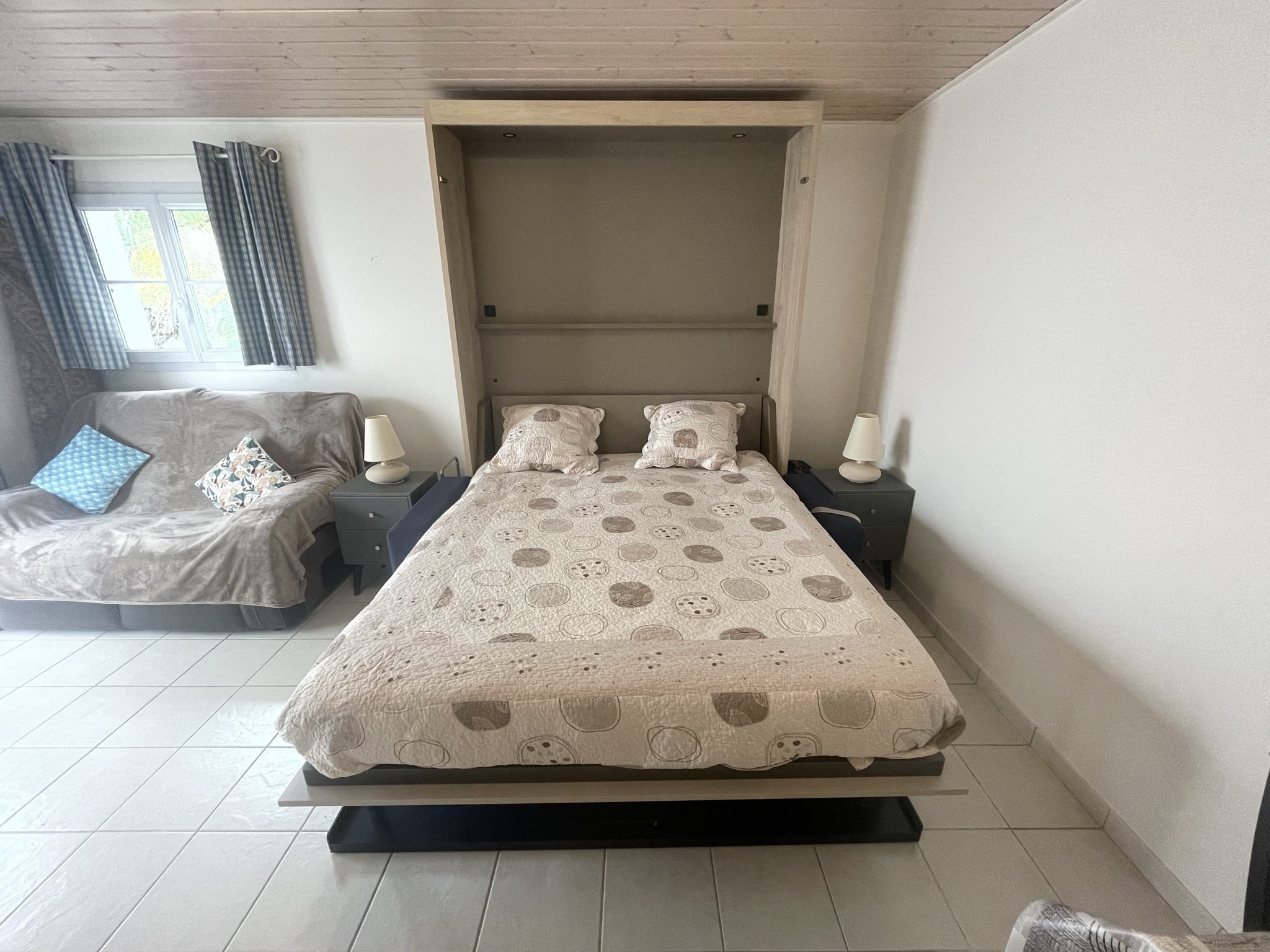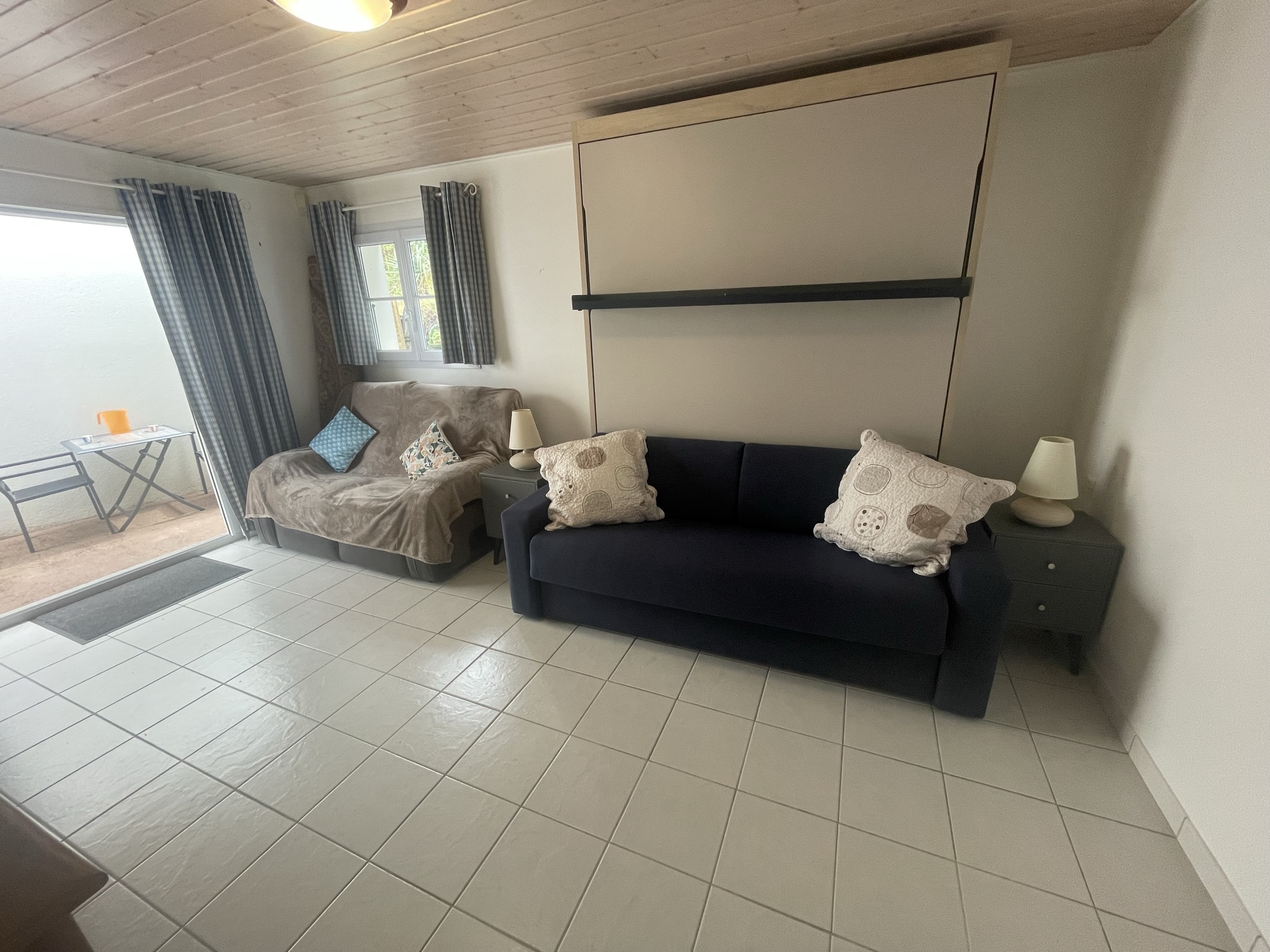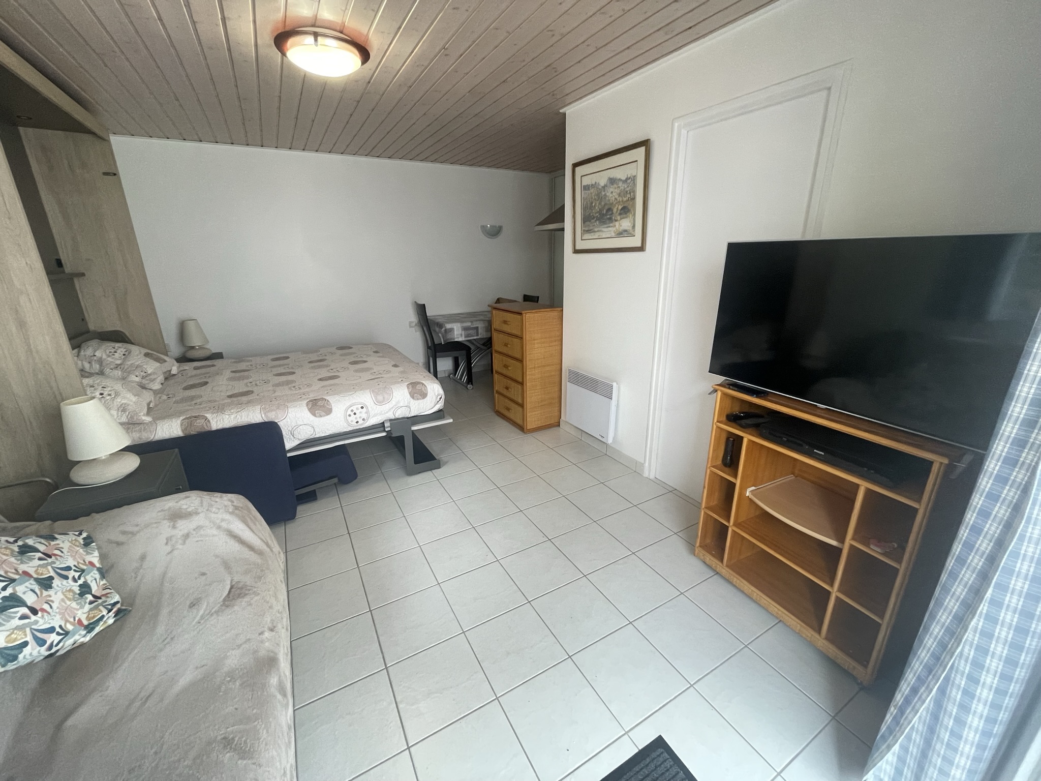 A La Tranche sur Mer, secteur le Phare, studio de plein pied comprenant une pièce à vivre avec coin salon avec télévision, lit escamotable de 160cm et kitchenette comprenant réfrigérateur, évier, plaque induction, cafetière, micro-ondes. Salle de bain avec baignoire, lavabo et wc. Cour fermée à l'extérieur avec salon de jardin. Stationnement non privatif dans l'impasse.