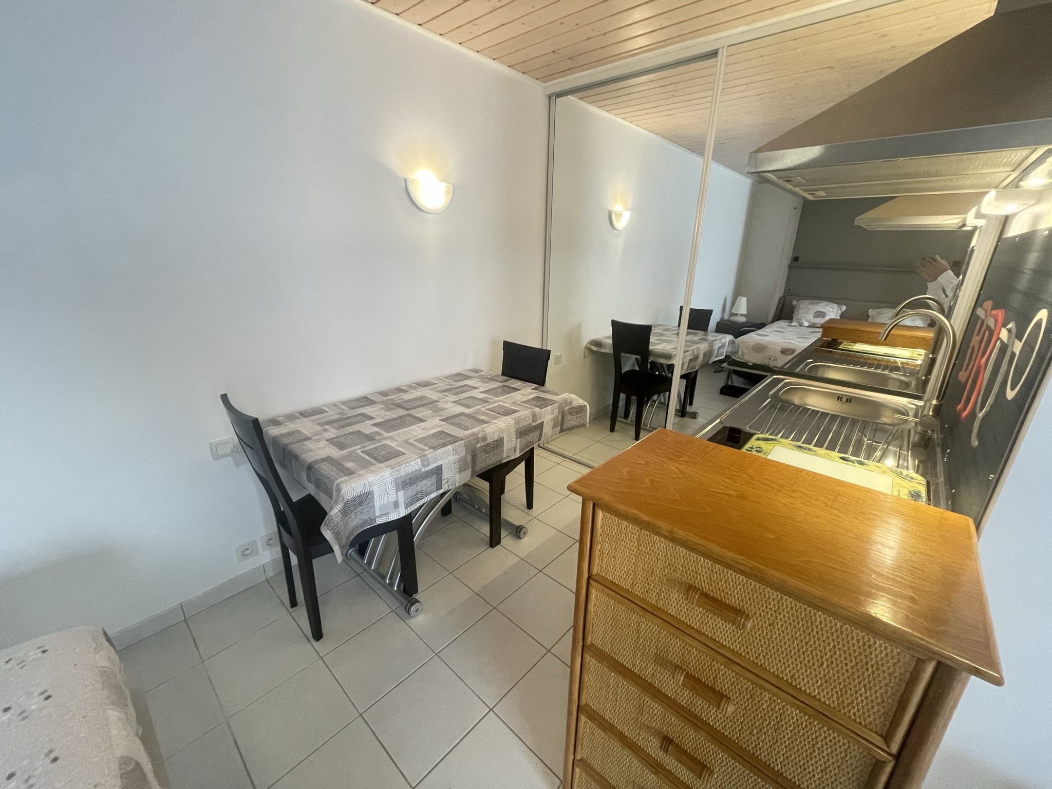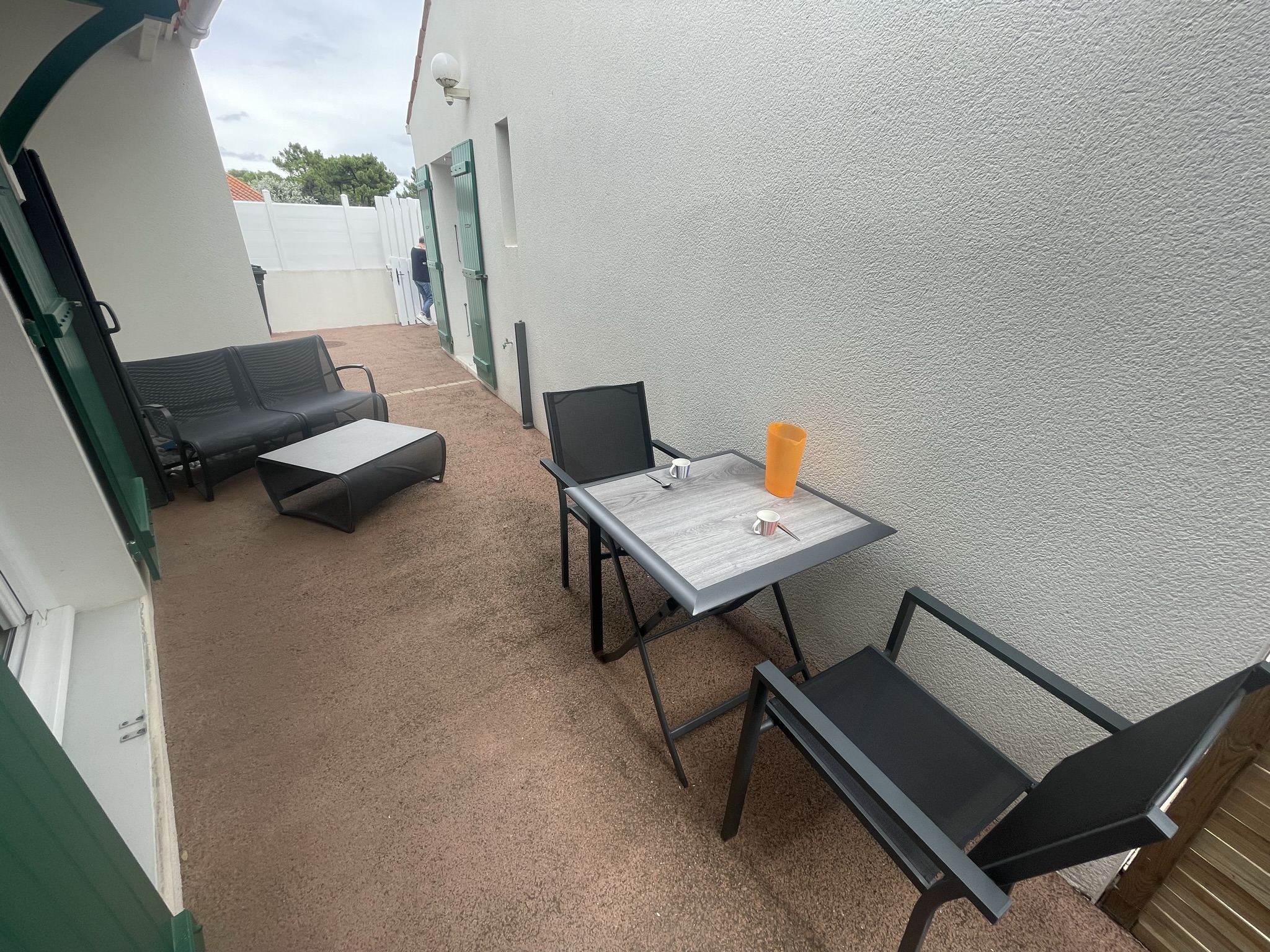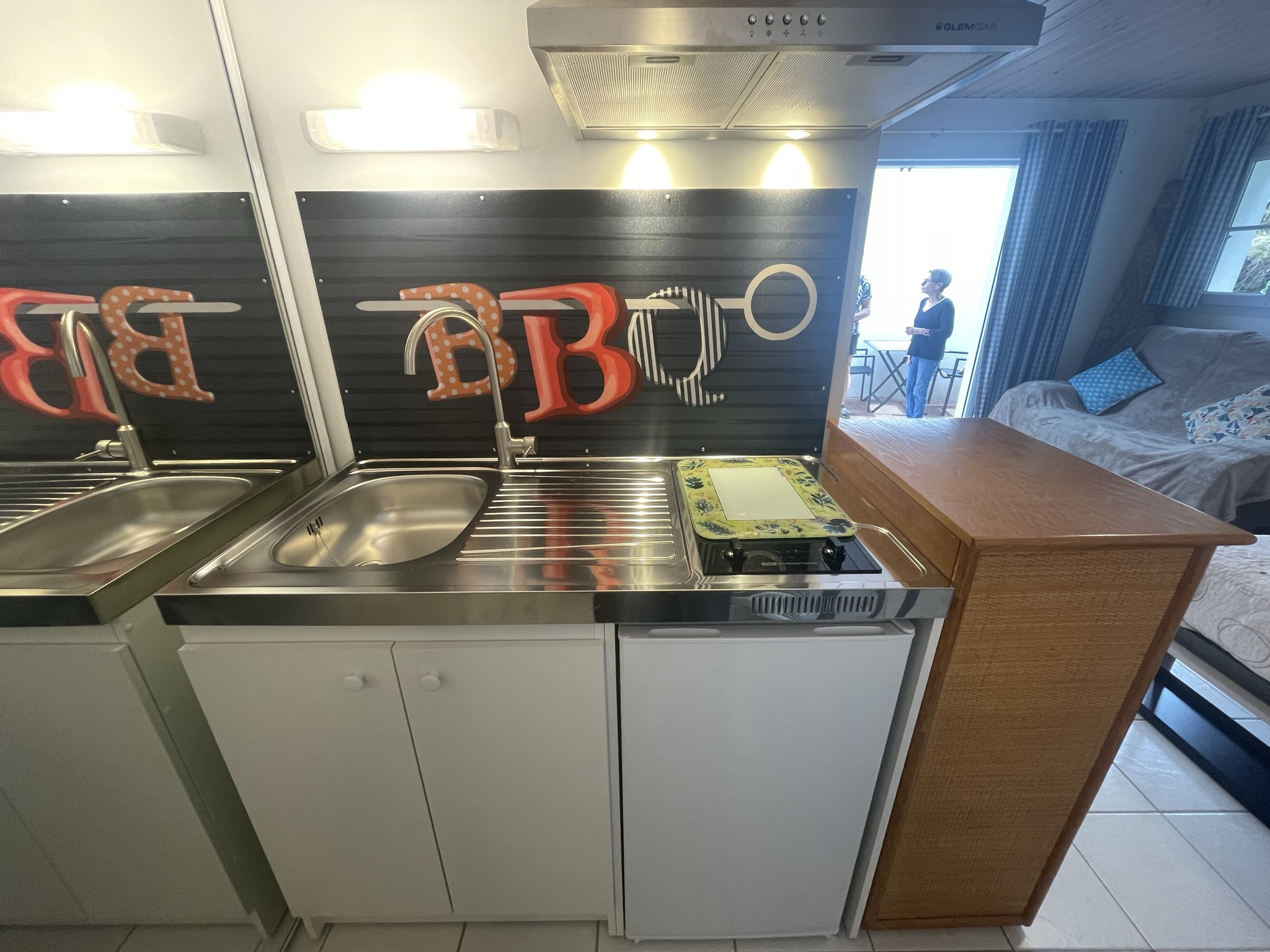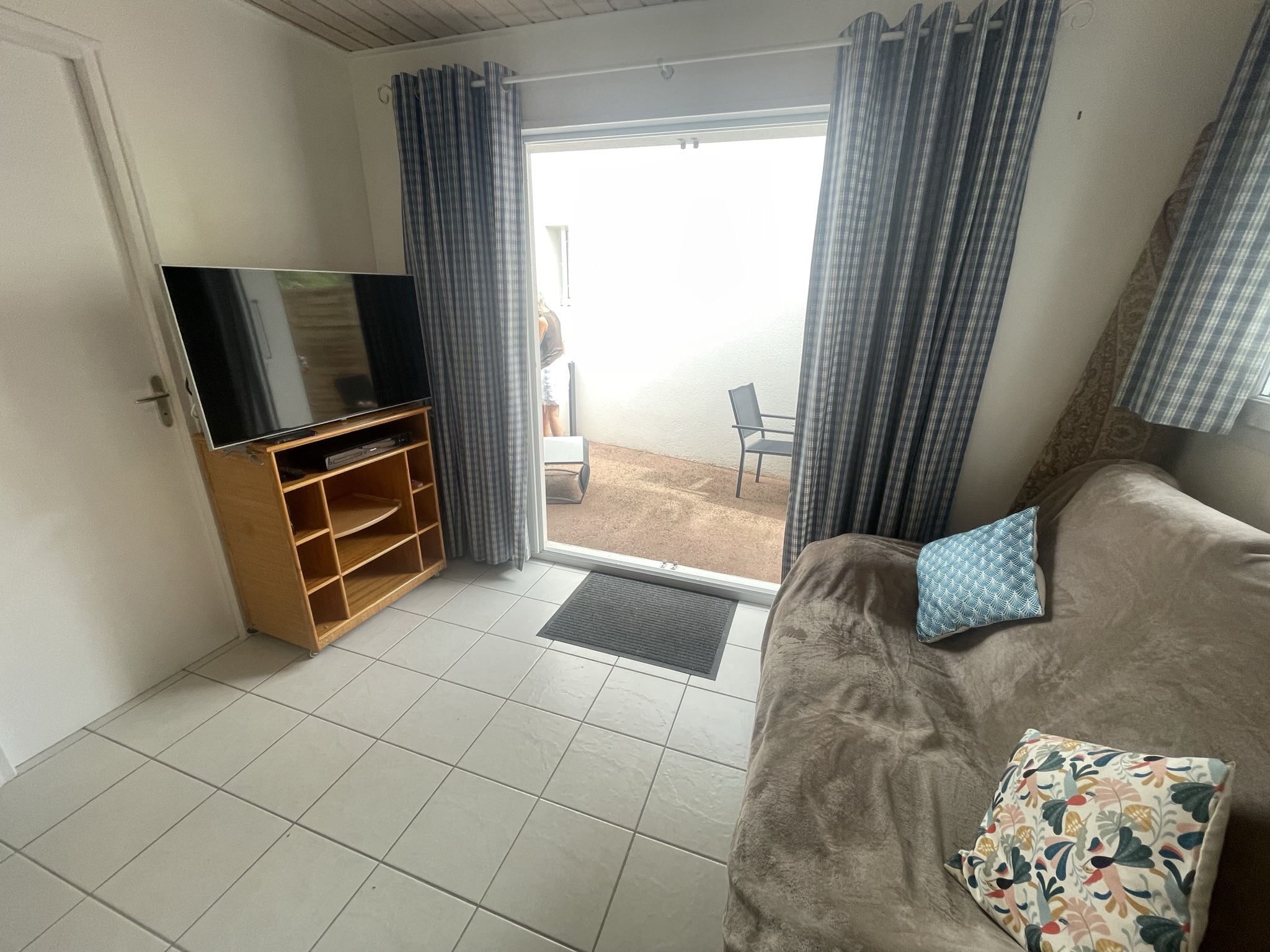 A La Tranche sur Mer, secteur le Phare, studio de plein pied comprenant une pièce à vivre avec coin salon avec télévision, lit escamotable de 160cm et kitchenette comprenant réfrigérateur, évier, plaque induction, cafetière, micro-ondes. Salle de bain avec baignoire, lavabo et wc. Cour fermée à l'extérieur avec salon de jardin. Stationnement non privatif dans l'impasse.