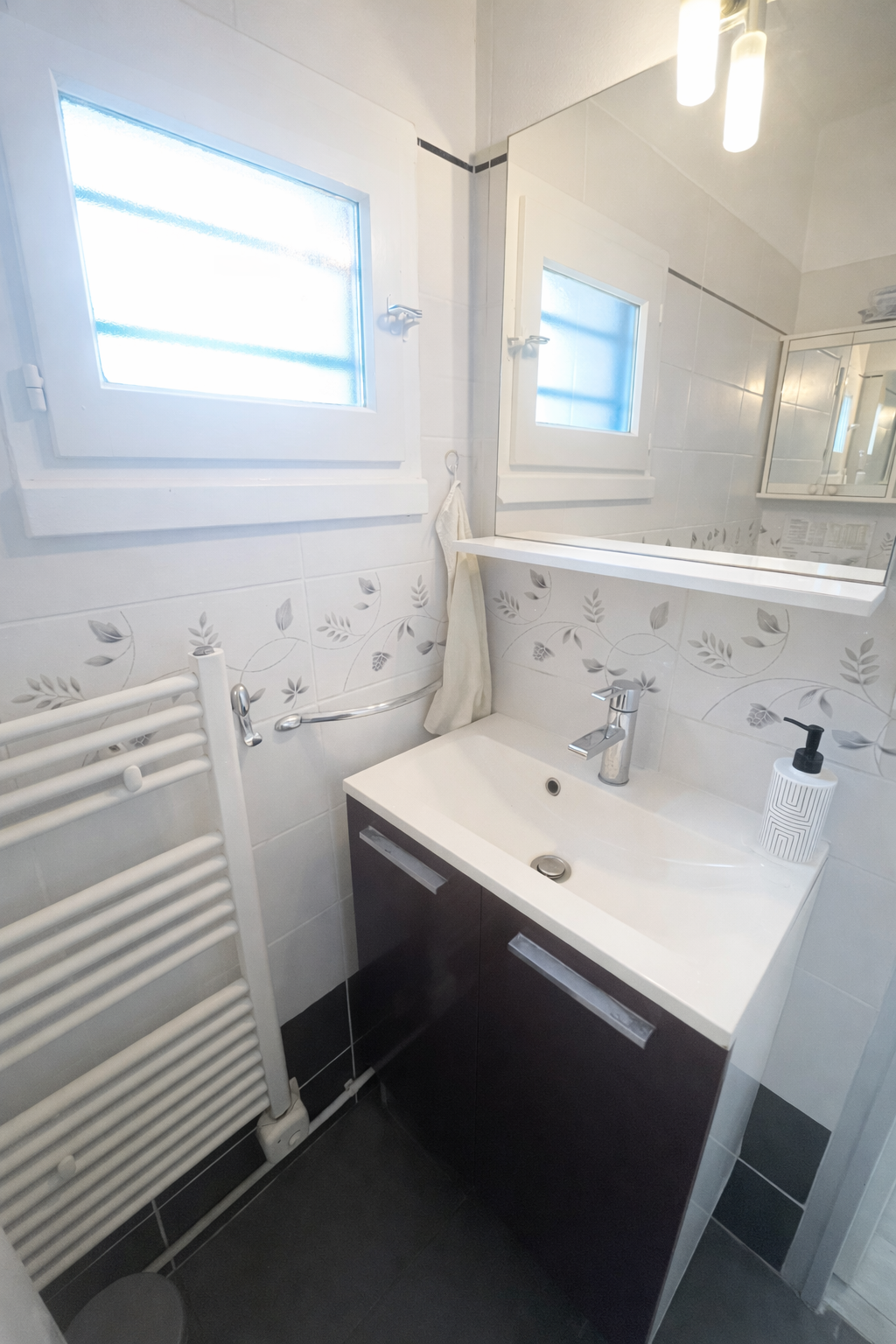 Agencement sanitaire : une salle d’eau (douche, lavabo) lave linge et wc séparé.