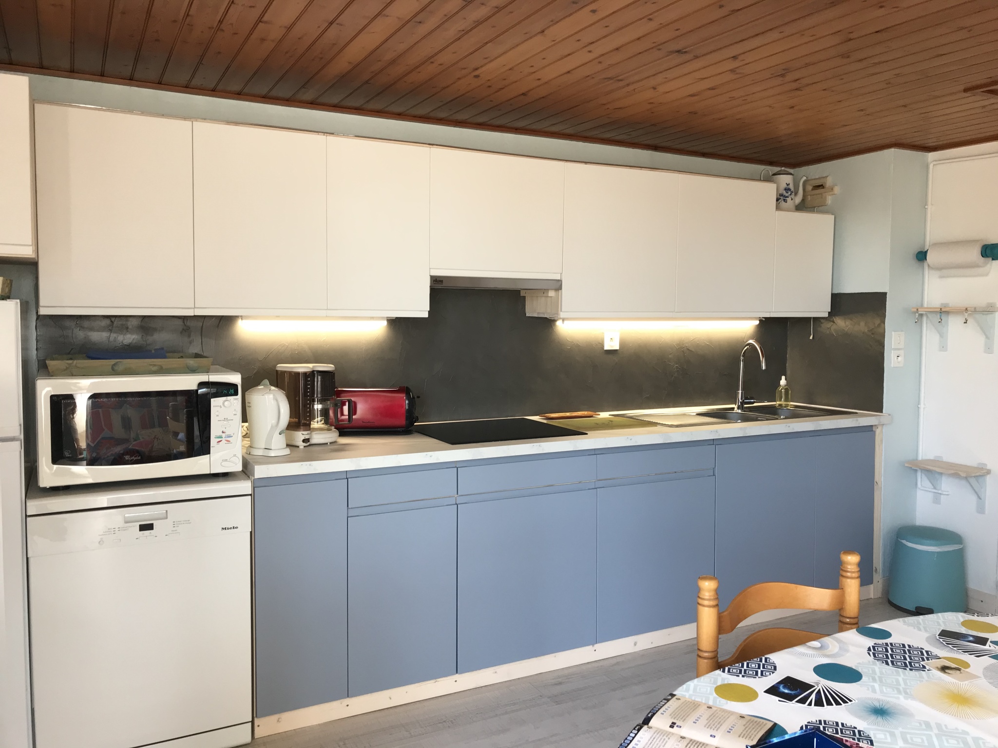 comprenant : plaque vitro, réfrigérateur - congélateur, lave vaisselle, four combi, télévision, lave linge, aspirateur, fer et planche à repasser, grille pain, cafetière, bouilloire. Le ménage de fin de séjour doit être effectué par le locataire. draps et linge de maison non fournis, option payante sur réservation.