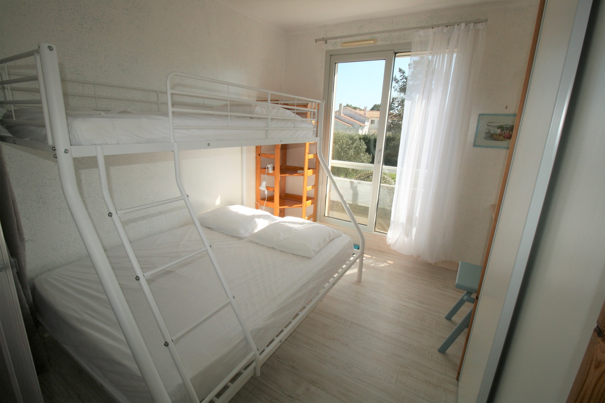 LA TRANCHE SUR MER, centre ville, appartement lumineux dans un immeuble de petite taille, se situant très proche de la plage centrale et à proximité de tous commerces. l' appartement au 1er étage avec son entrée desservant 1 pièce de vie avec coin cuisine s'ouvrant sur un balcon, 1 chambre avec séparation légère, 2 lits superposés 140 + 0,80. 1 canapé ouvrable dans le séjour. 1 salle d'eau, 1 wc. 1 emplacement voiture n°9 dans le sous sol, hauteur 1.90m. largeur 2,40 m, longueur 5,10m.