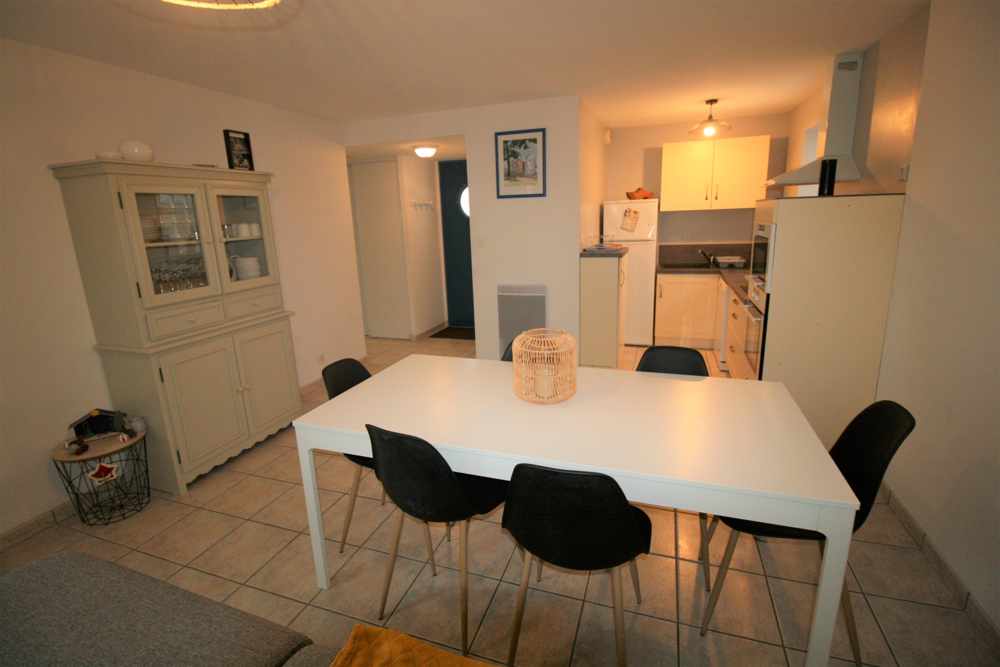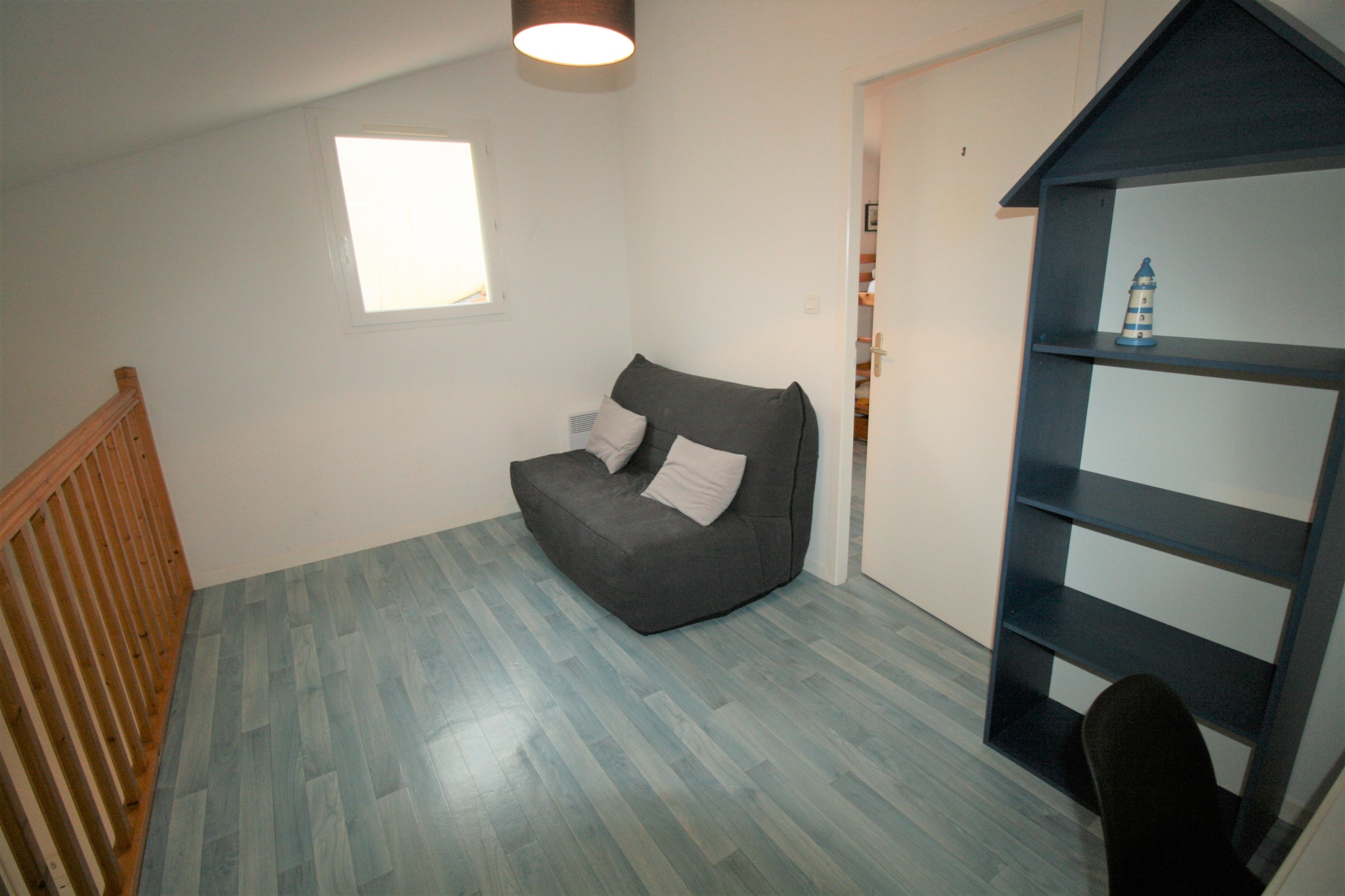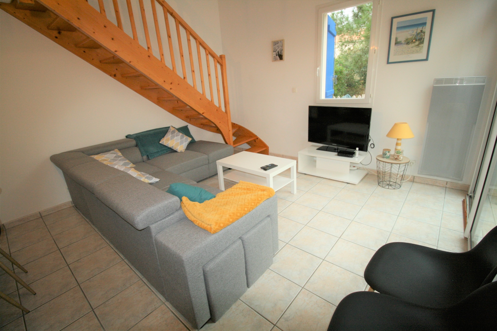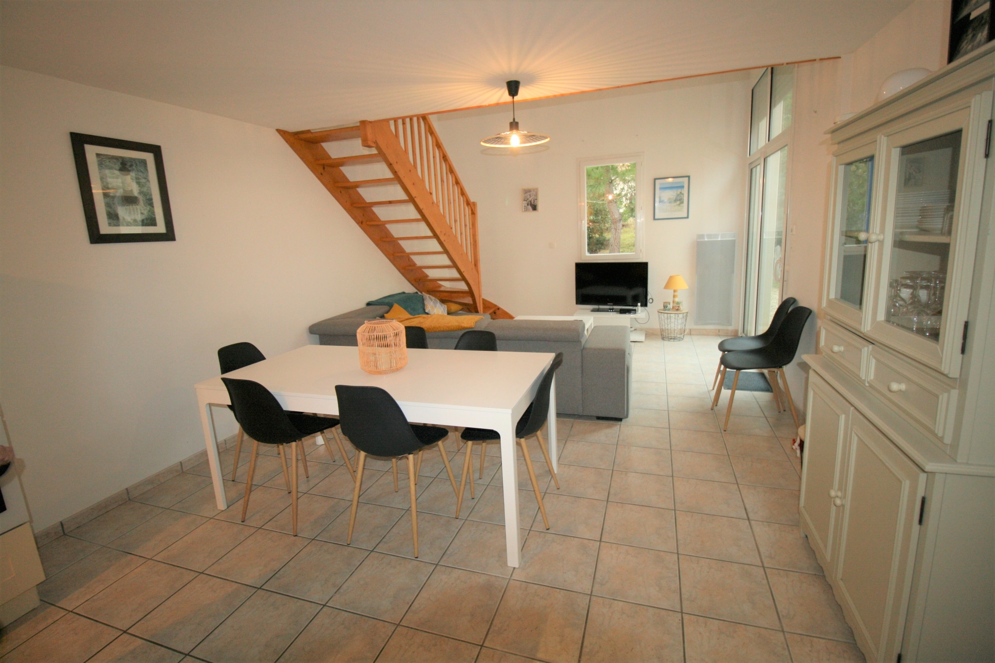 Longeville sur Mer, secteur Les Conches. Maisonnette en résidence avec 2 places de parking et local pour vélos. L'intérieur se compose au rez de chaussée d'une cuisine équipée et aménagée : réfrigérateur avec partie congélateur, plaques vitrocéramique, four, micro-ondes, lave vaisselle, évier, cafetière , bouilloire, grille pain. wifi.Un salon-séjour avec télévision donnant sur la terrasse privative, une chambre avec 1 lit de 140cm et placard, une salle de bain avec vasque et baignoire, wc séparé, placard avec lave linge. A l'étage une mezzanine avec placard, une deuxième chambre avec un lit superposé.(2x0.80) et un placard. A l'extérieur, jardinet avec terrasse individuelle et son salon de jardin. . A environ 700m de la plage et 4km de Longeville sur mer.