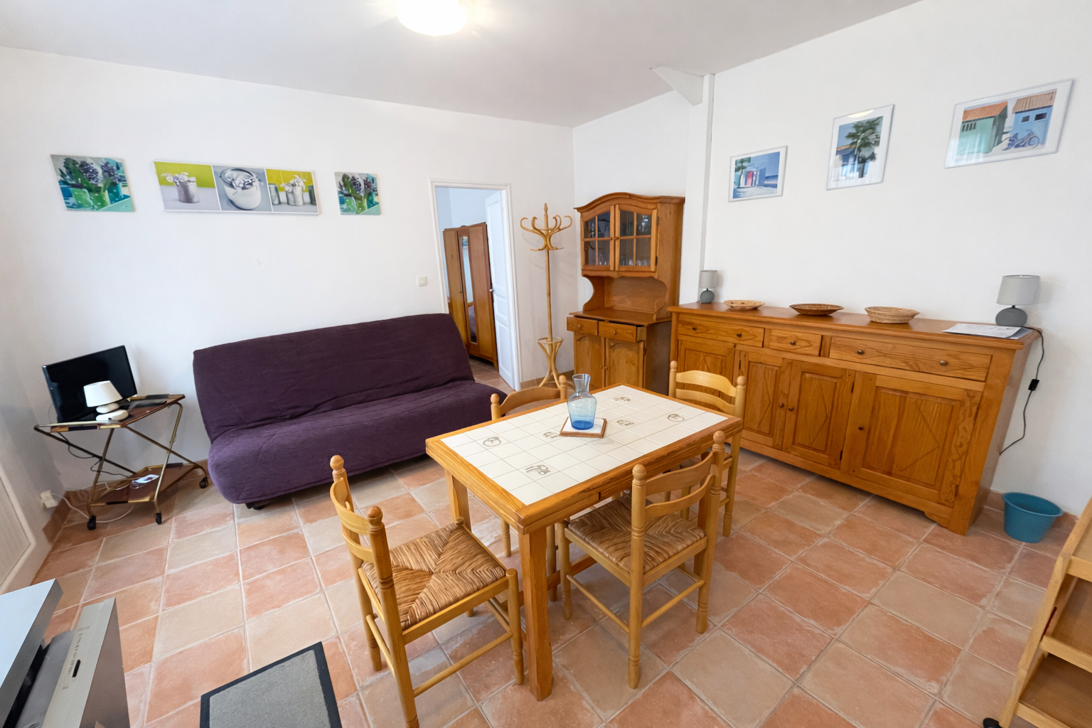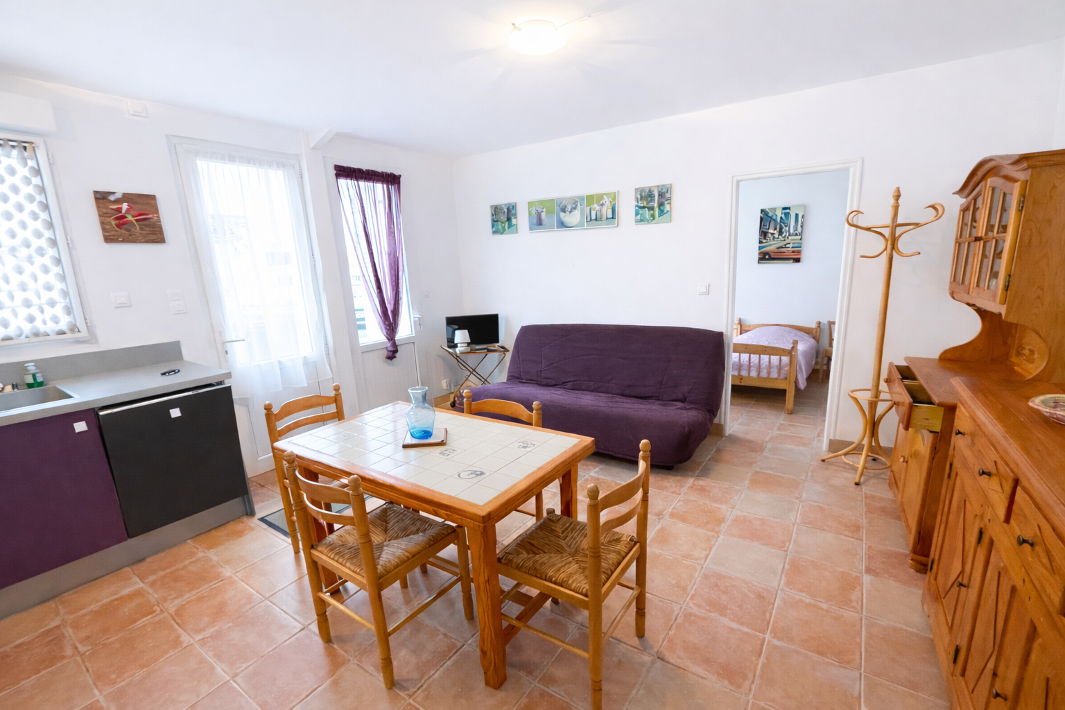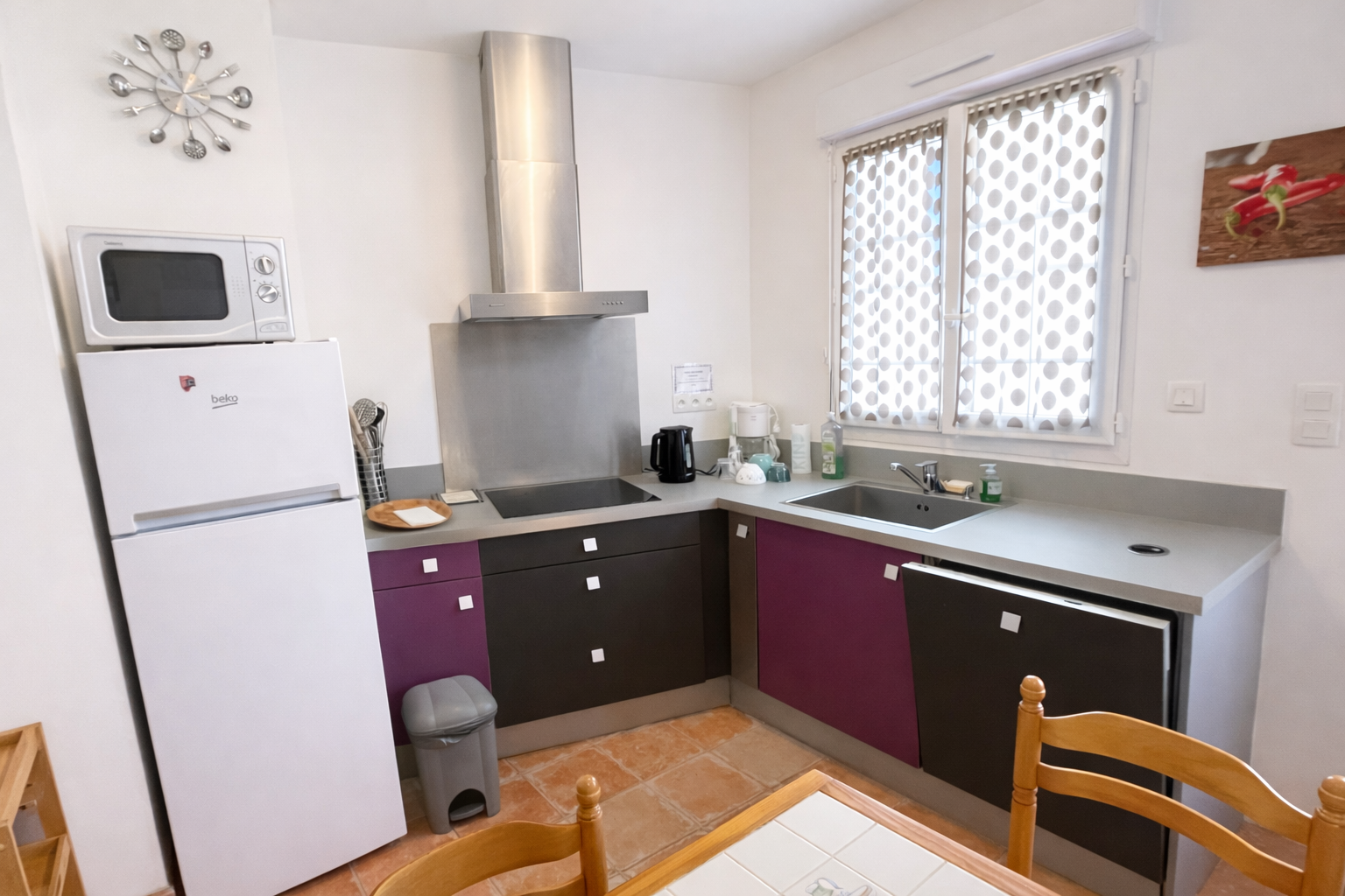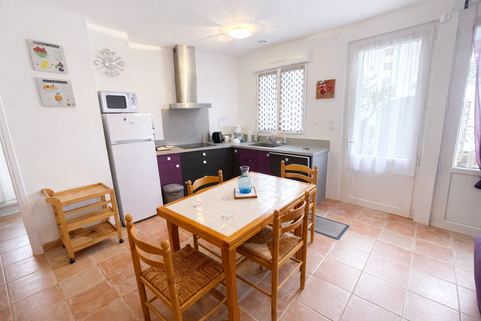 Equipements : réfrigérateur-congélateur, 1 caf. électrique, bouilloire, micro ondes, lave vaisselle, aspirateur, télévision, plaque vitrocéramique...1 lave linge dans le cellier en commun.