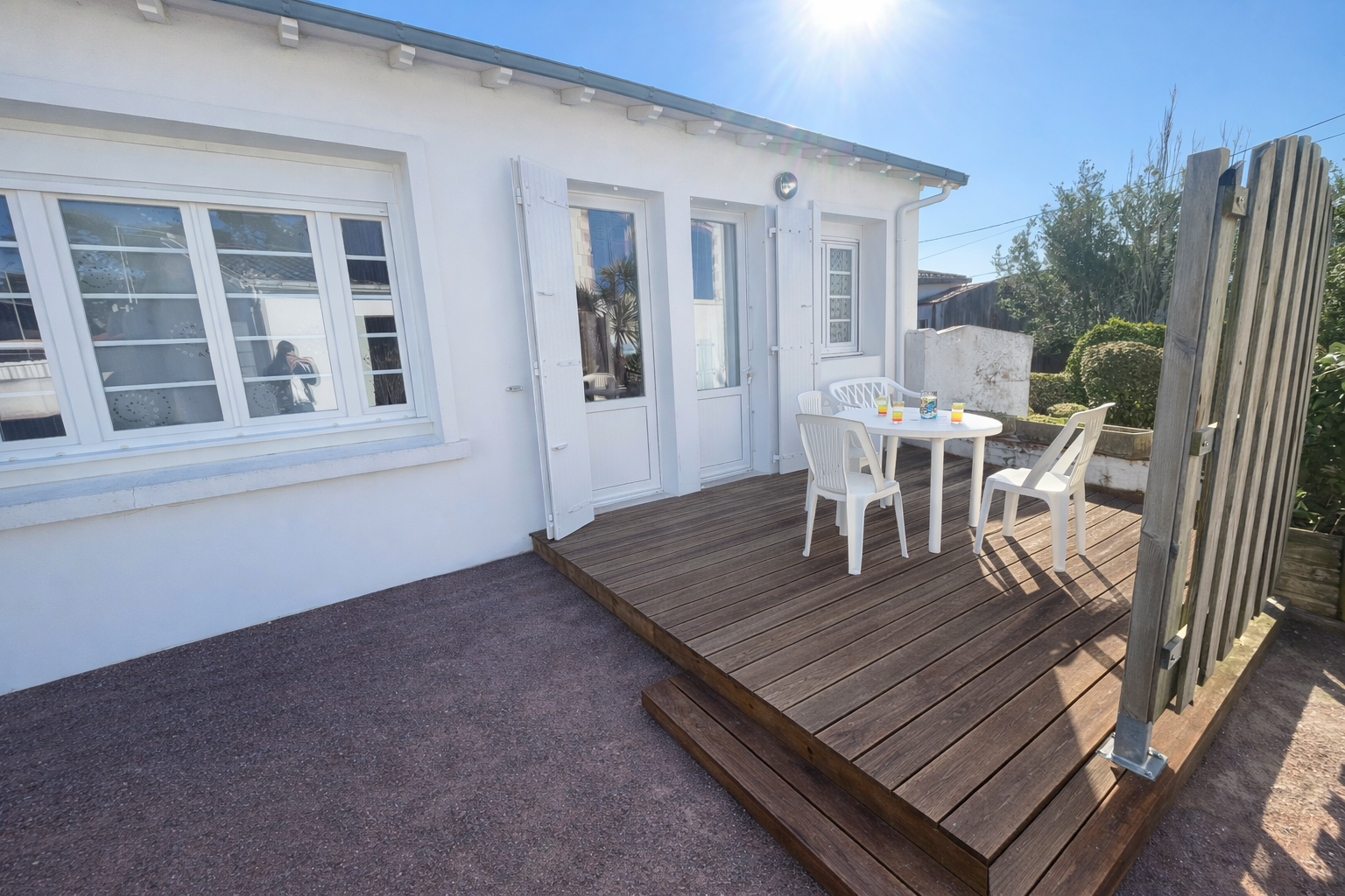 LA TRANCHE SUR MER, centre, maisonnette plain-pied, dans un petit ensemble de 3 logements , à quelques minutes du centre ville pour tous commerces. Emplacement voiture privatif dans la cour en commun. terrasse privative avec salon de jardin. 1 séjour cuisine avec 1 canapé convertible, 1 chambre avec 2 lits d'une personne, 1 salle d'eau (douche à l'italienne et lavabo, 1 wc séparé.