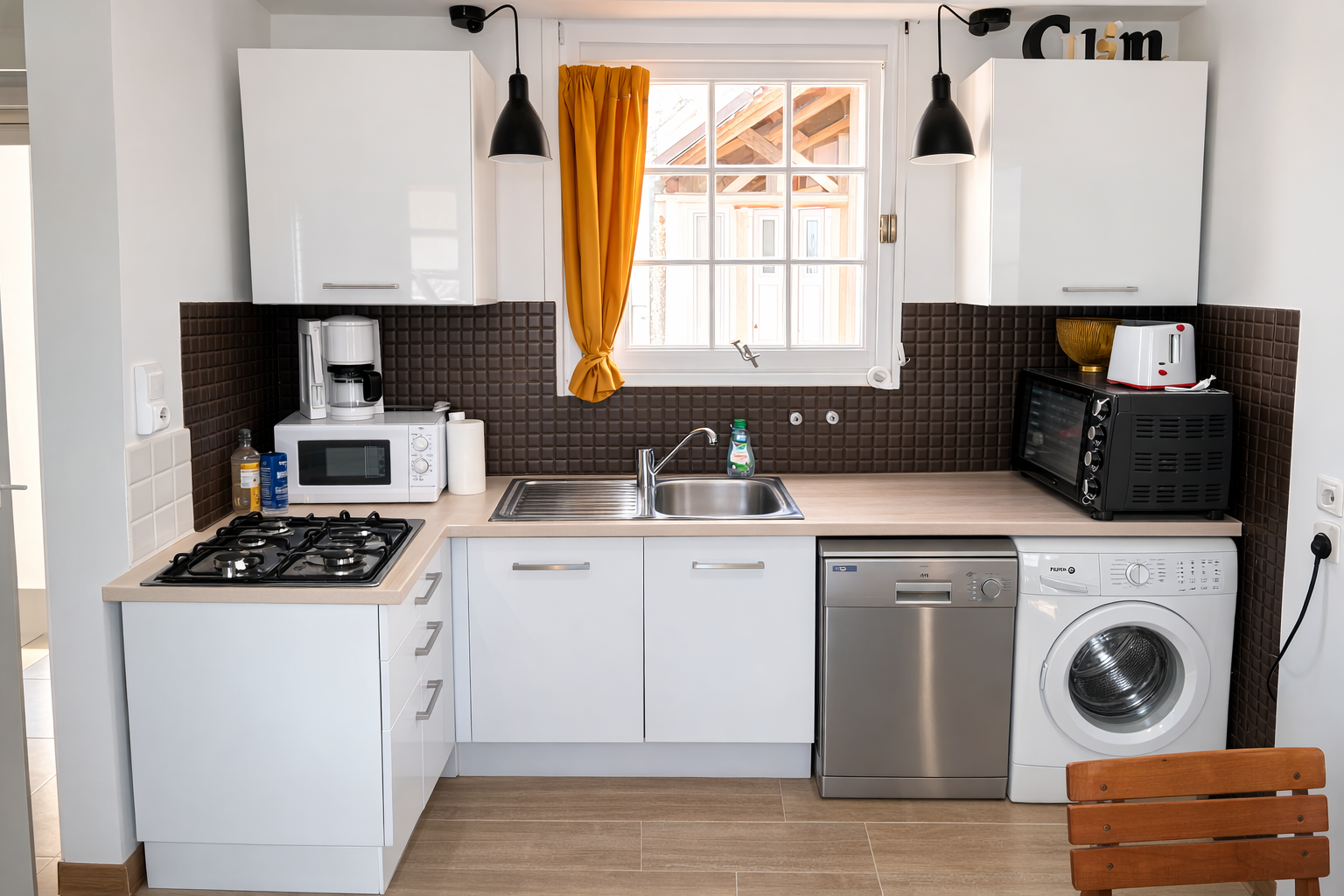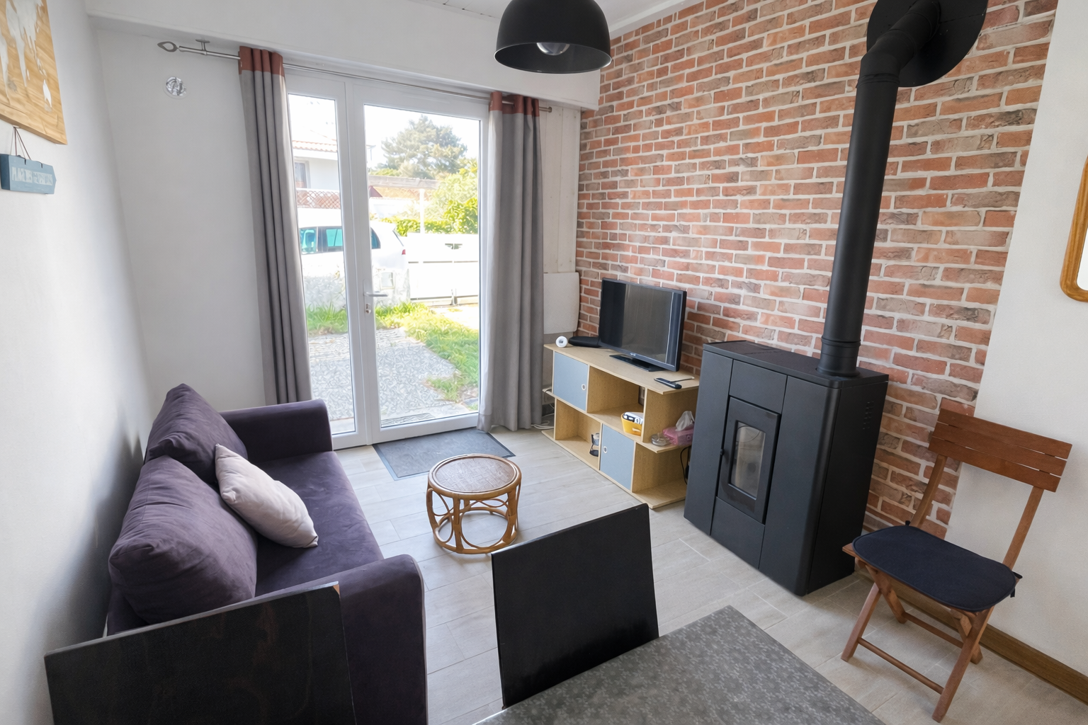 Equipements : lave linge, lave vaisselle, 1 four ordinaire, 1 micro ondes, caf. électrique, 1 bouilloire, grille pains, 1 réfrigérateur-congélateur, 1 aspirateur, 4 feux gaz, télévision, 1 lit parapluie pour bébé. 1 siège bébé qui s'adapte sur la chaise. 1 poele décoratif.