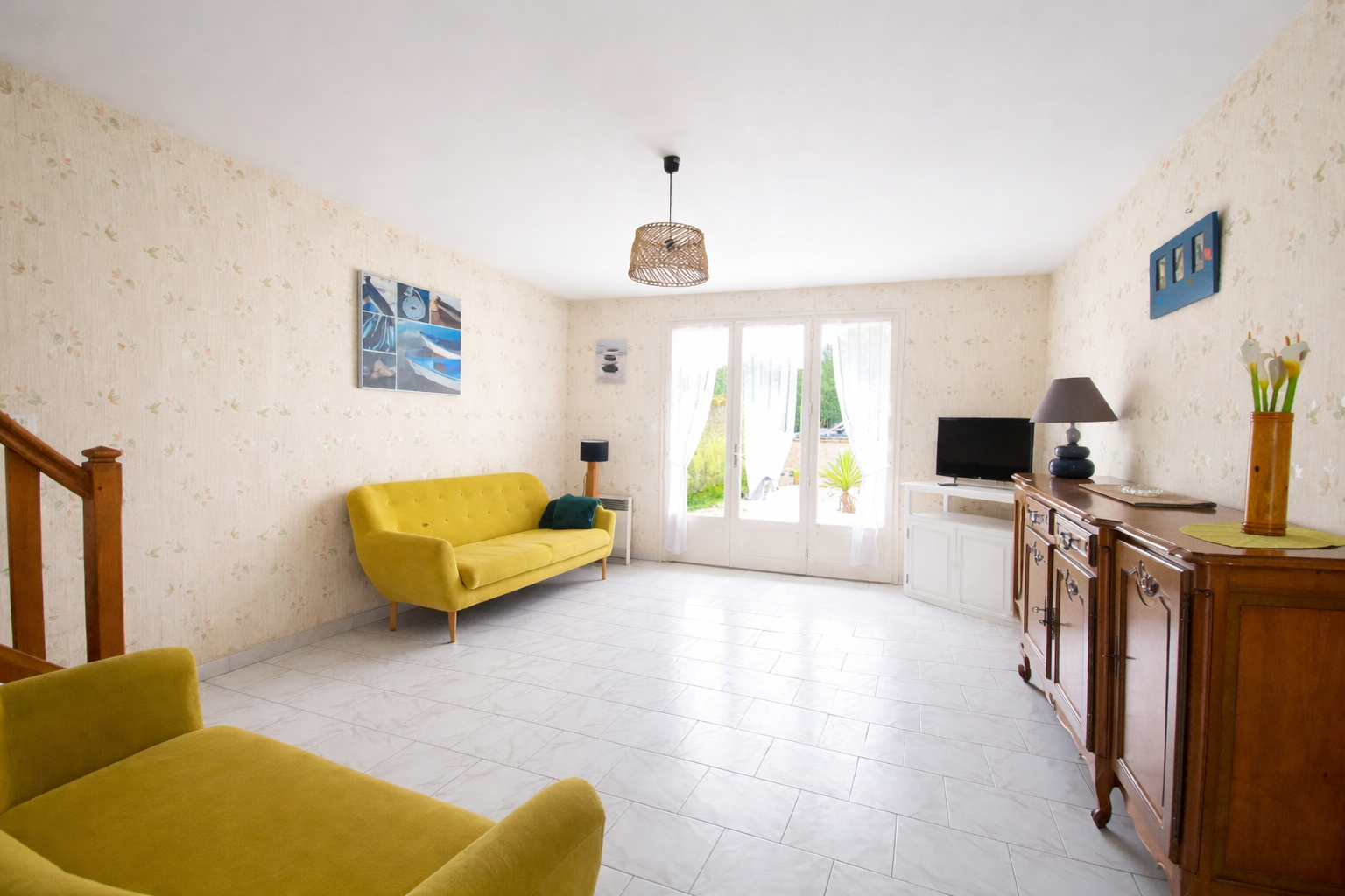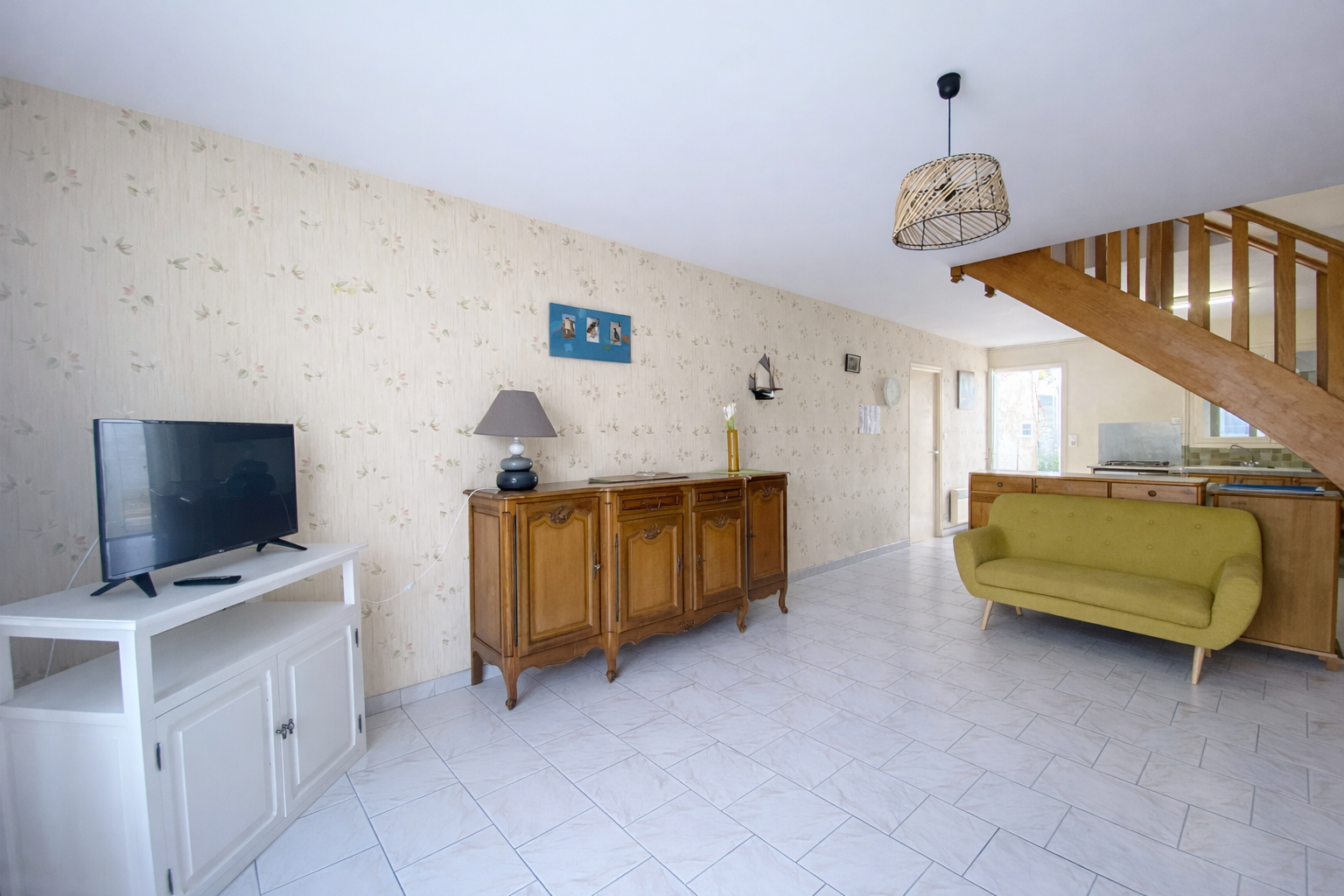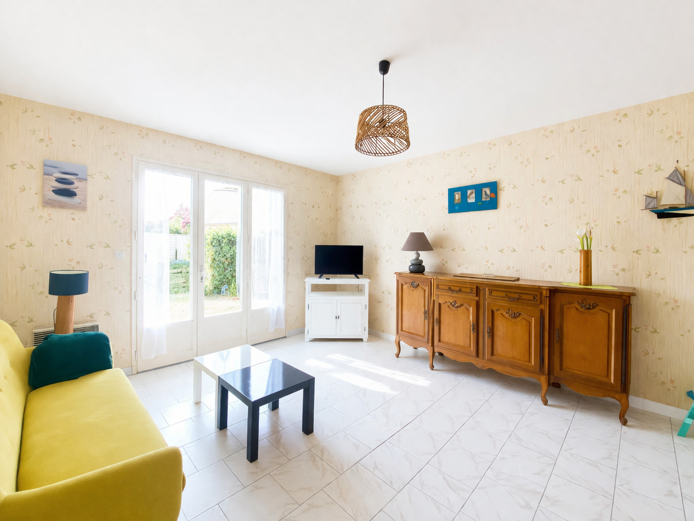 -> et un salon avec TV, ouvrant sur terrasse et jardinet (à l'avant de la maison),