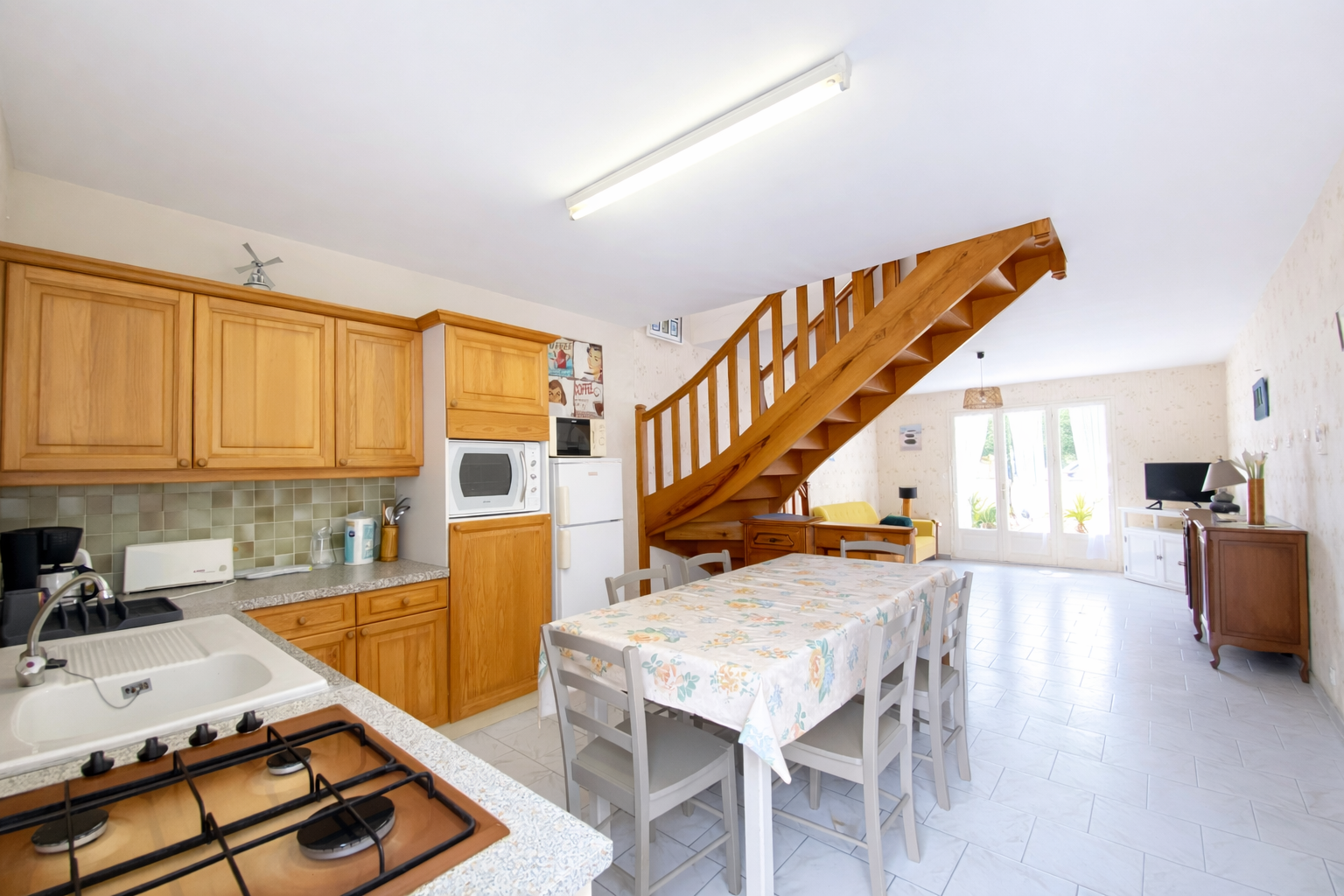 - au RDC : -> vaste pièce de vie (environ 40 m²) divisée en un coin cuisine équipée (réfrigérateur-congélateur, four, micro-ondes, gazinière à 4 feux, lave-vaisselle) donnant accès sur le jardin clos, à l'arrière,