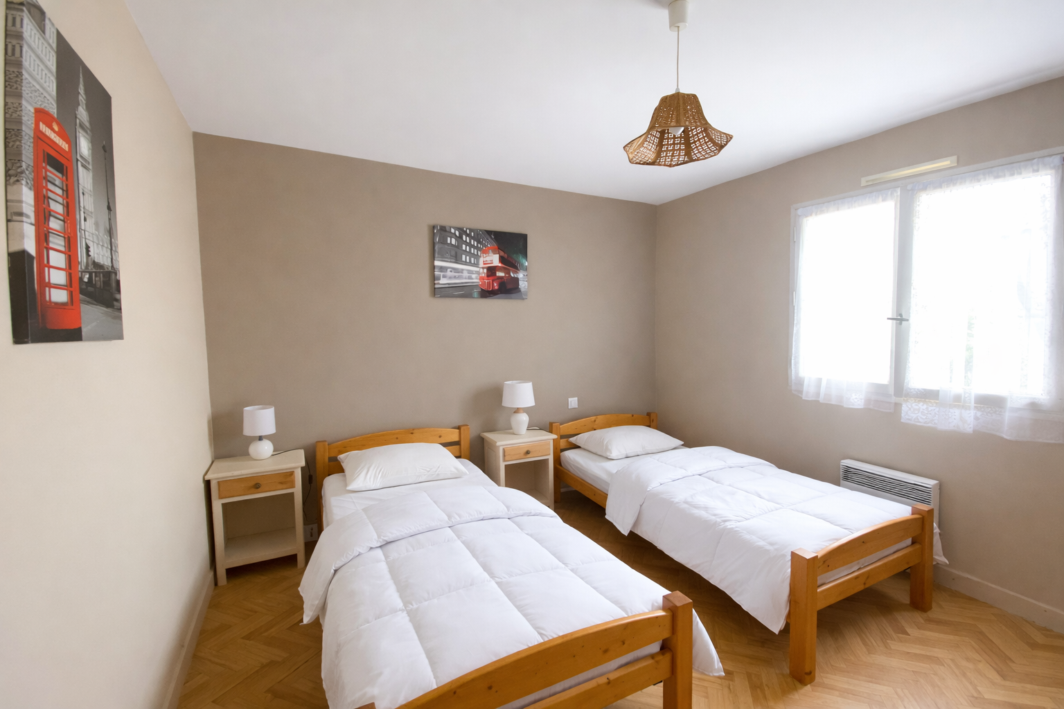 -> 3 chambres dont 2 avec un lit 2 pers. (placard-penderie) et 1 chambre avec 2 lits 1 pers. (armoire),