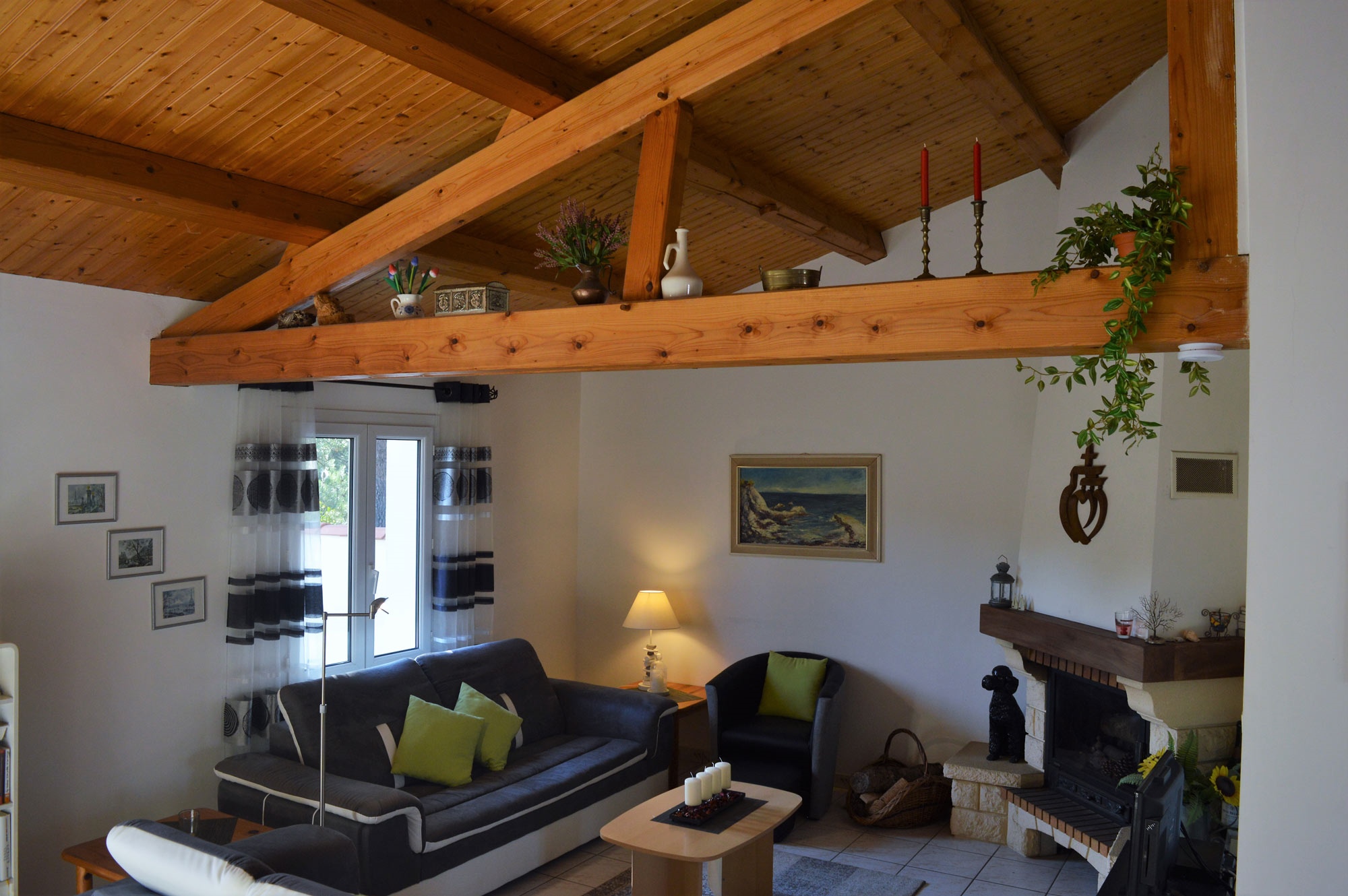 -> 1 coin salon avec 2 canapés, 1 fauteuil, 1 TV (écran plat/satellite), 1 micro-chaîne hifi 1 cheminée (uniquement décorative), qui ouvre sur terrasse et jardin,