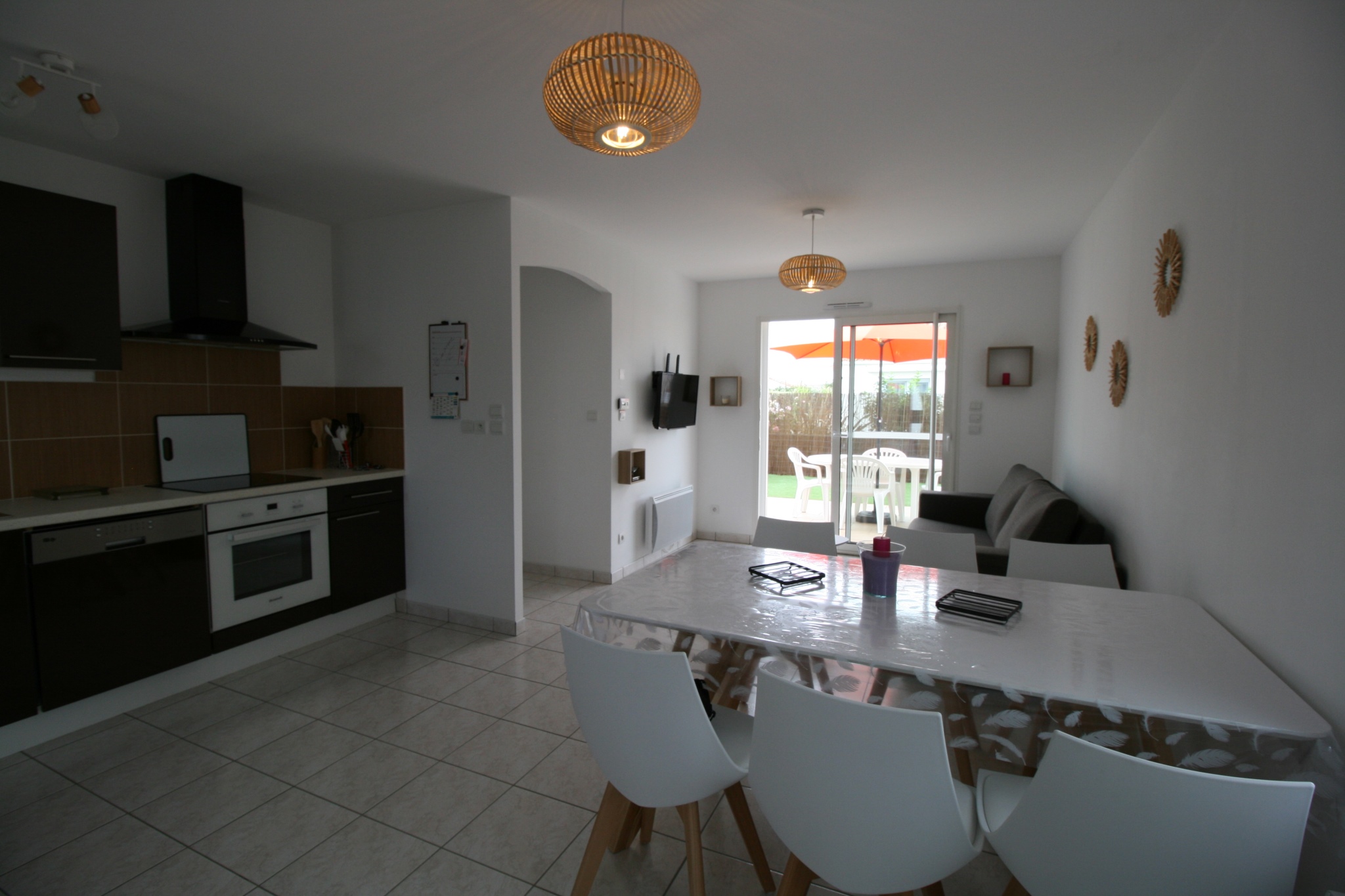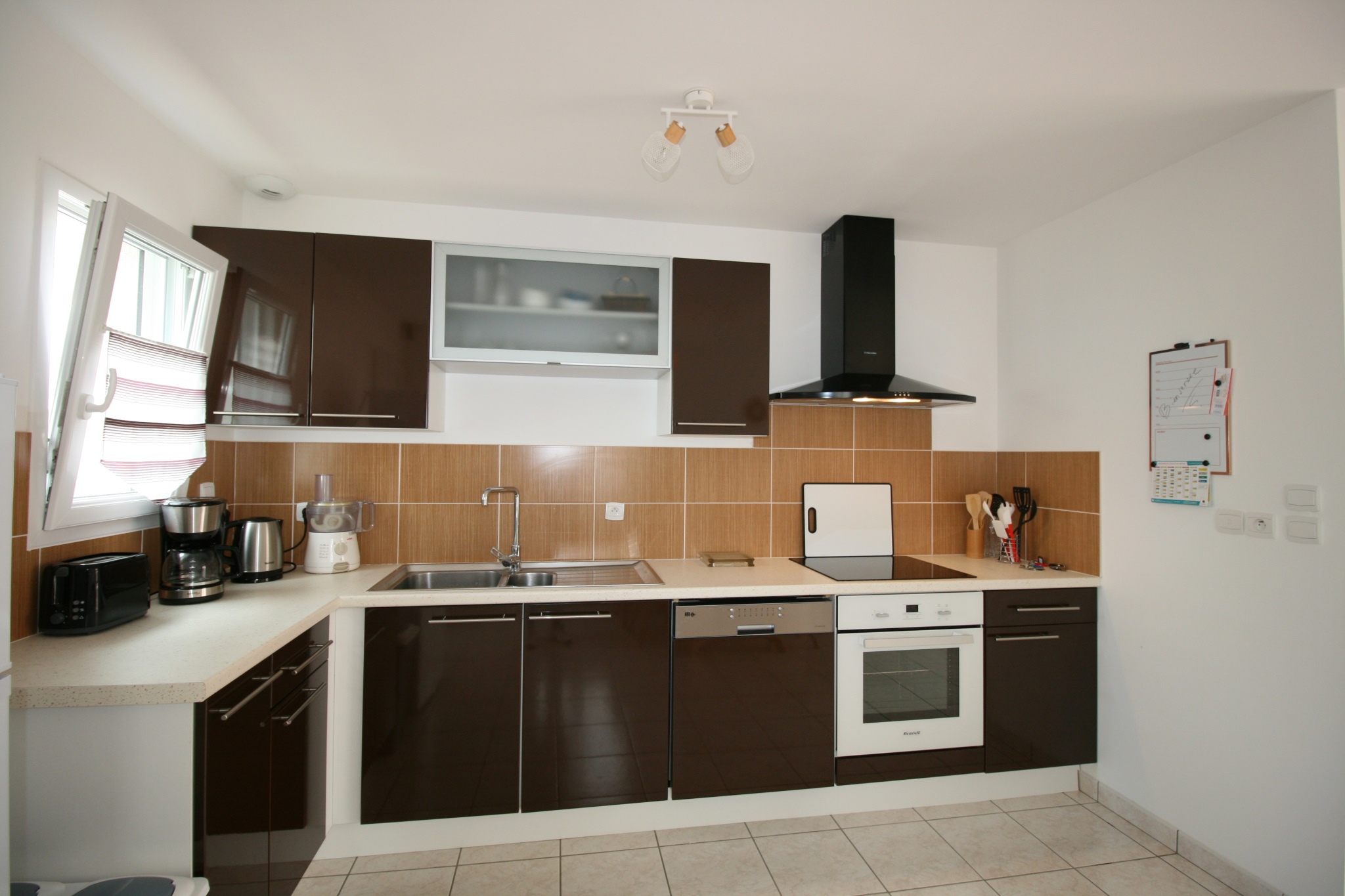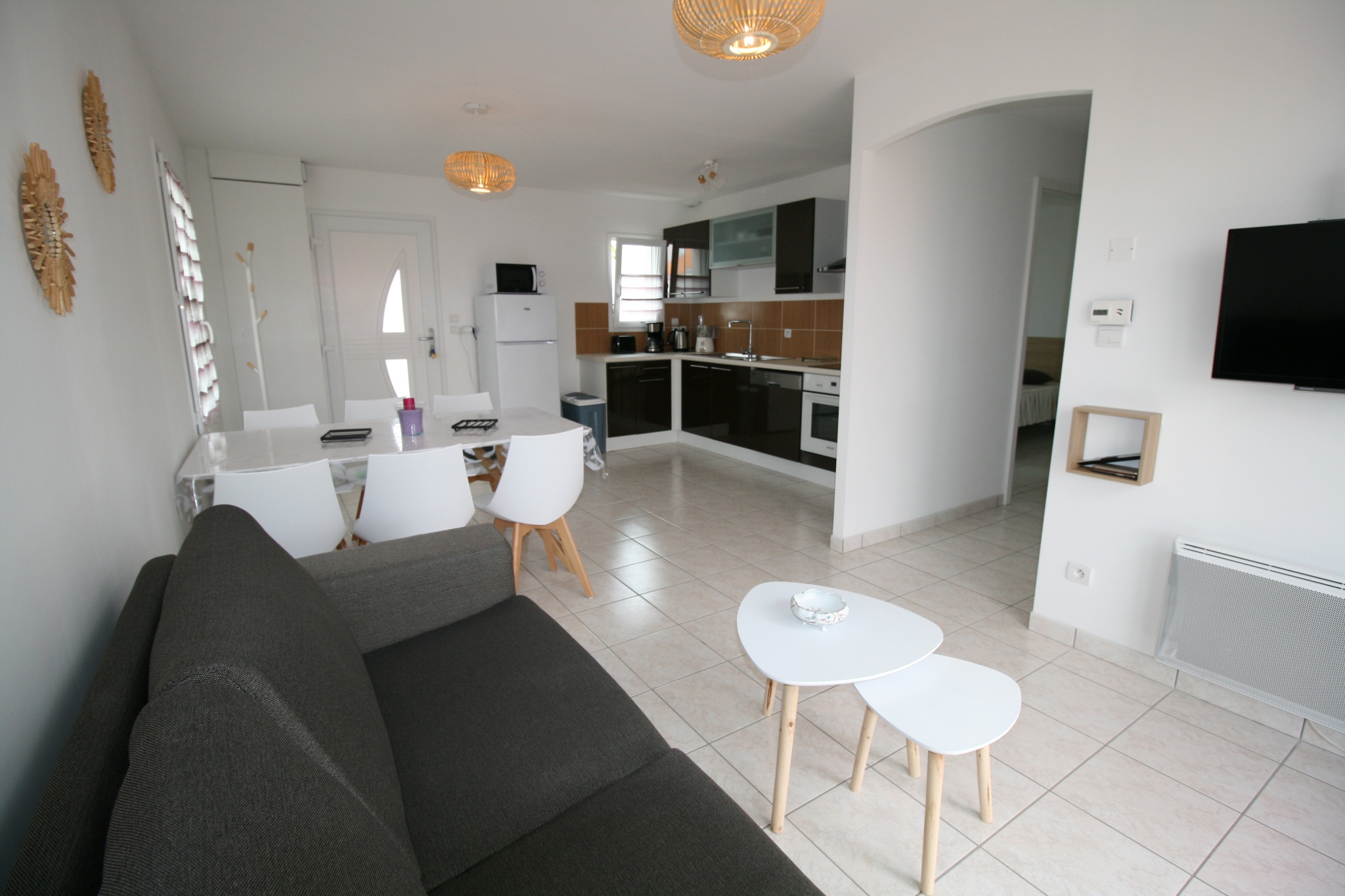 Equipements : 1 réfrigérateur - congélateur, 1 plaque vitro 3 feux, 1 grille pains, 1 bouilloire, 1 aspirateur, 1 fer et une table à repasser, hotte, 1 four électrique, 1 four micro ondes, 1 télévision, 1 lave linge, 1 lave vaisselle, vaisselle et couverts, wifi gratuit.