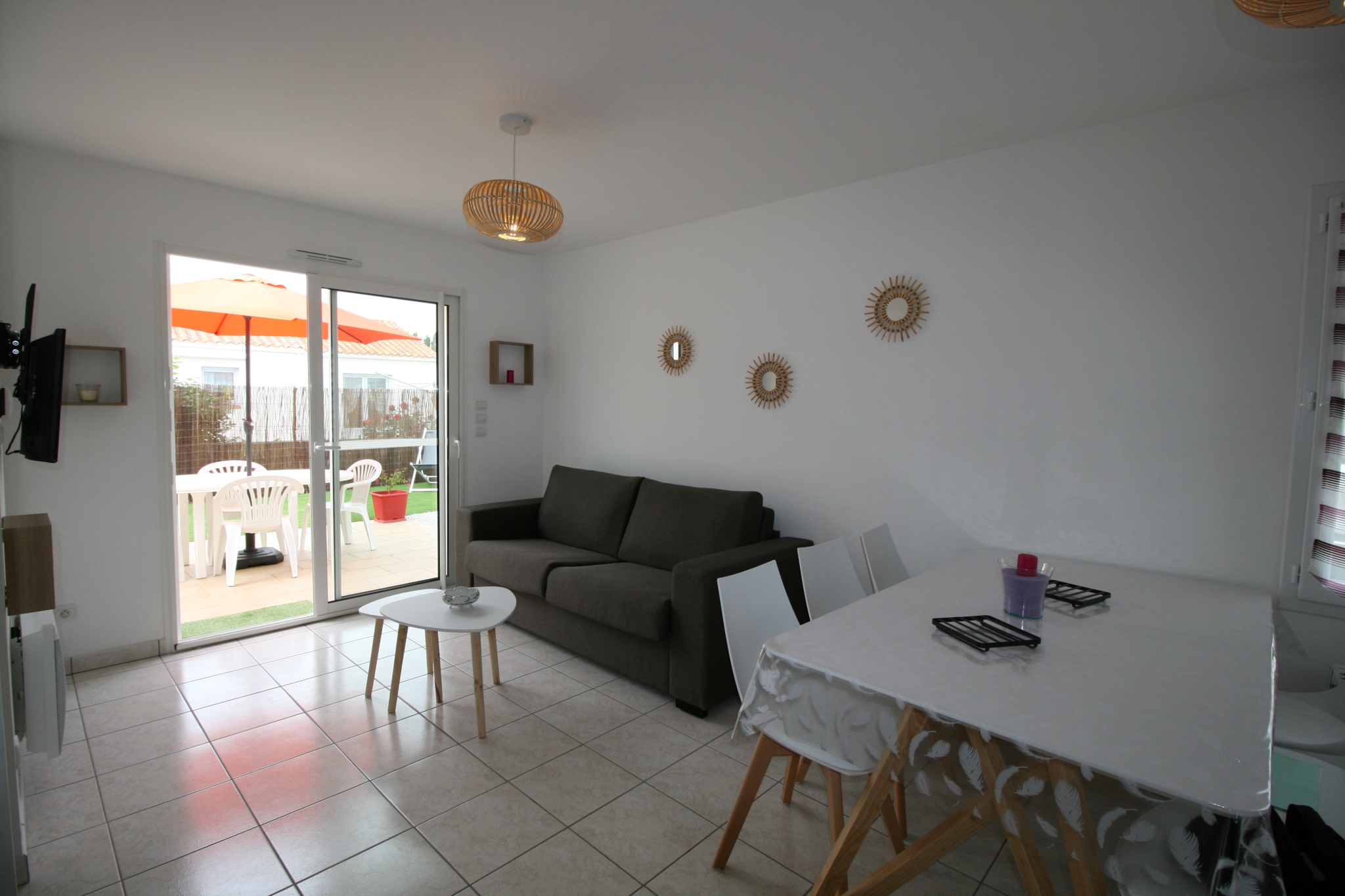LA TRANCHE SUR MER, exceptionnellement bien située plage - commerces, maison avec sa terrasse privative, son salon de jardin et barbecue. Intérieur très soigné comprenant 1 pièce à vivre avec coin cuisine équipée - salon avec canapé, 1 chambre avec 1 lit 160 , 1 chambre avec lits superposés (140 + 0,90), 1 salle d'eau (douche lavabo) 1 wc séparé. 1 emplacement voiture. wifi gratuit.