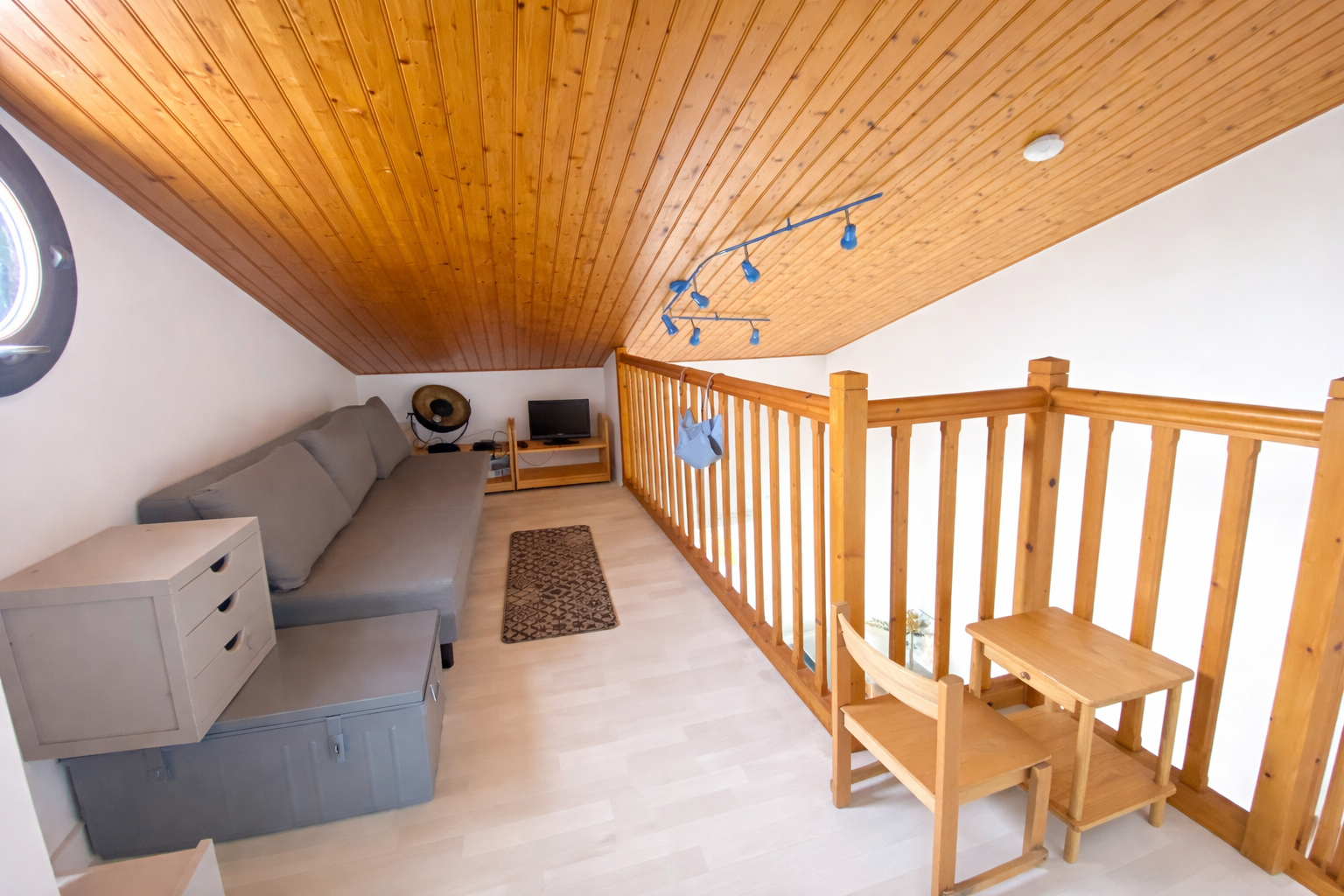 RDC : 1séjour-cuisine, 1 chambre avec 1 lit 140, 1 salle d'eau, wc. 1 cellier, Etage arrivant sur un pallier (hauteur inf. 1.80 m.) avec coin détente, 1 chambre avec lit superposé, 2 lits 0.80 rapprochés.