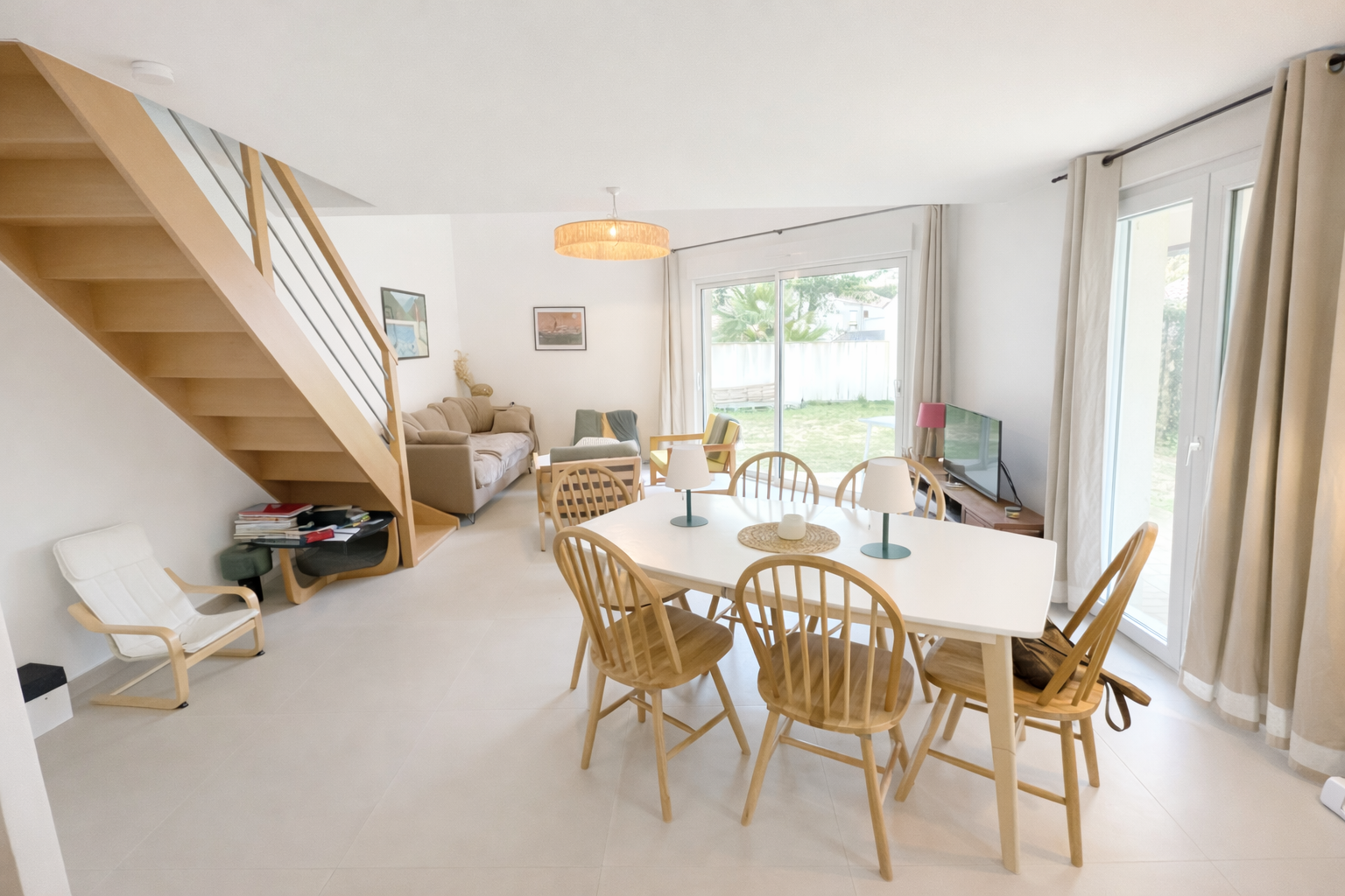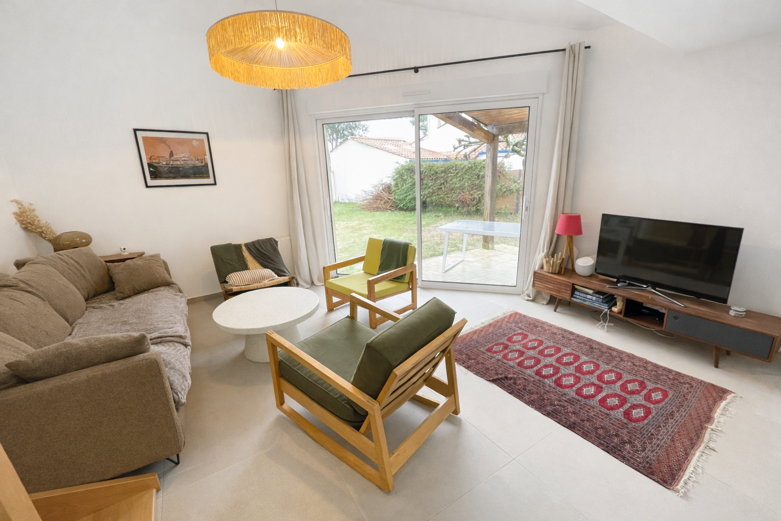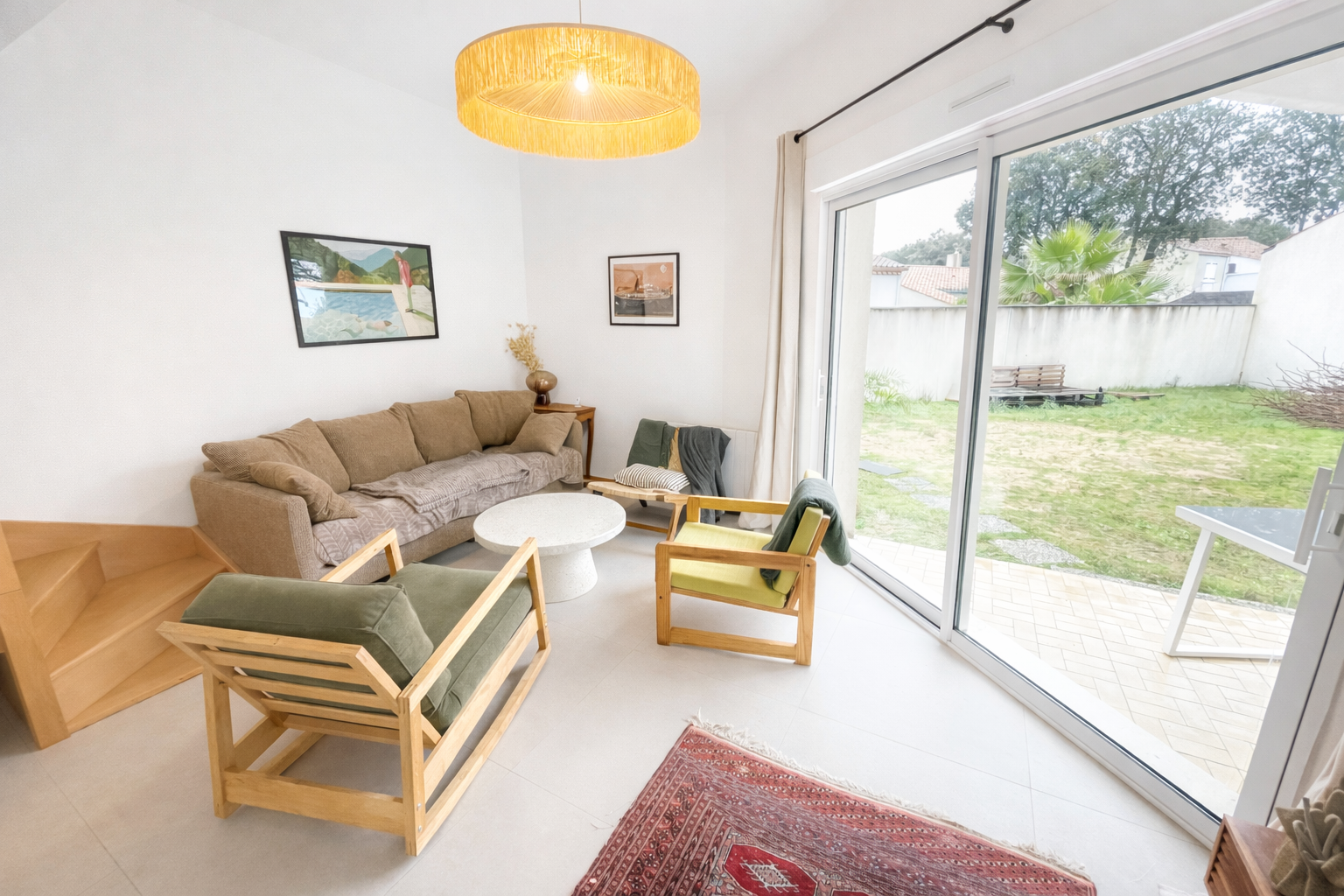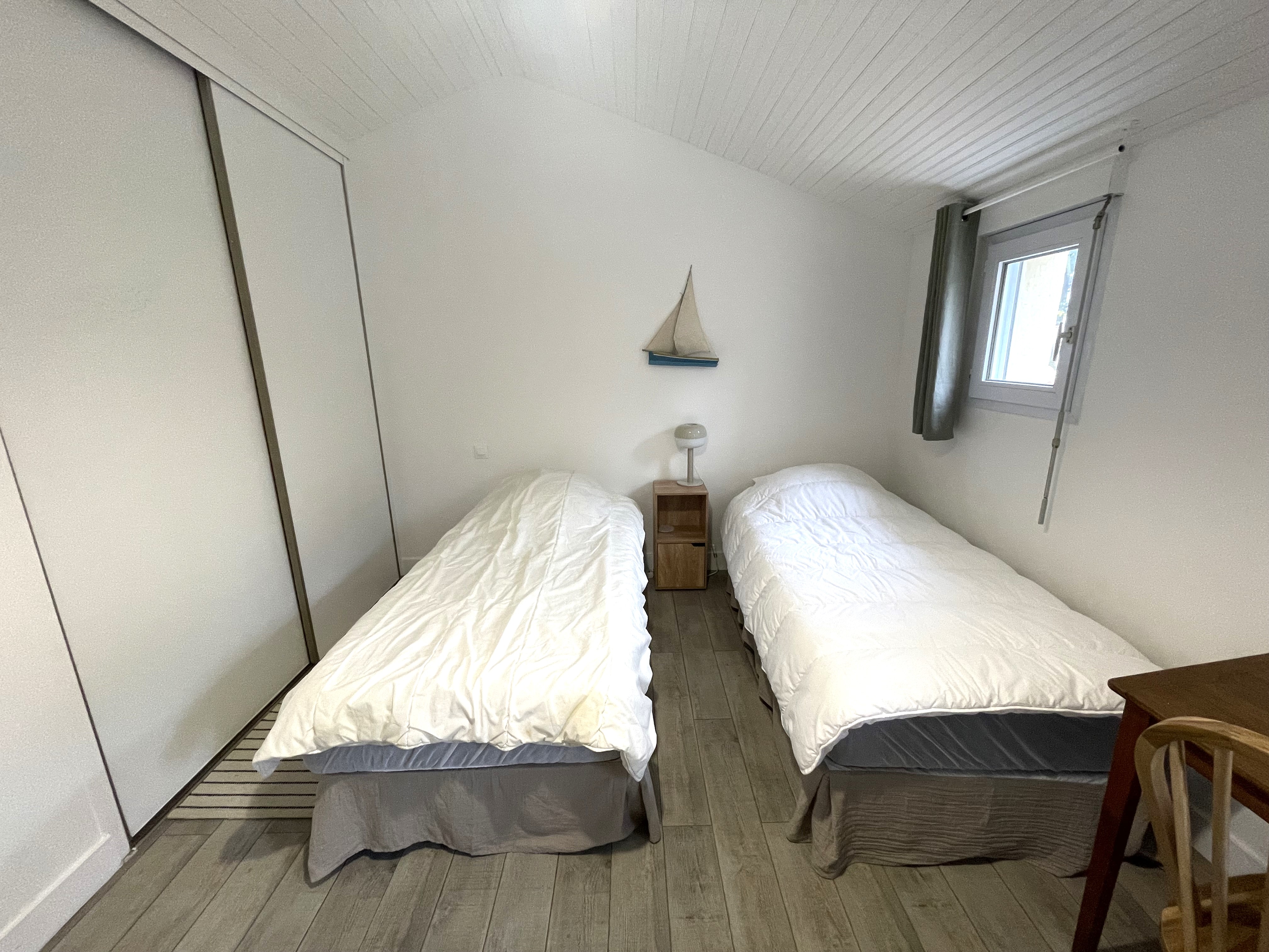 LA TRANCHE SUR MER, le Phare, villa dans un quartier agréable, boisé, profitant d'un bel espace extérieur avec salon de jardin. Emplacement voiture. La villa dispose d'une cuisine équipée - séjour - salon, 1 chambre avec 2 lits de 0.90, 1 chambre avec 1 lit 160 cm, 1 wc, 1 salle d'eau (douche, lavabo) . Etage avec 1 chambre 3 lits 0.80 cm. 1 salle d'eau avec douche, lavabo, wc.