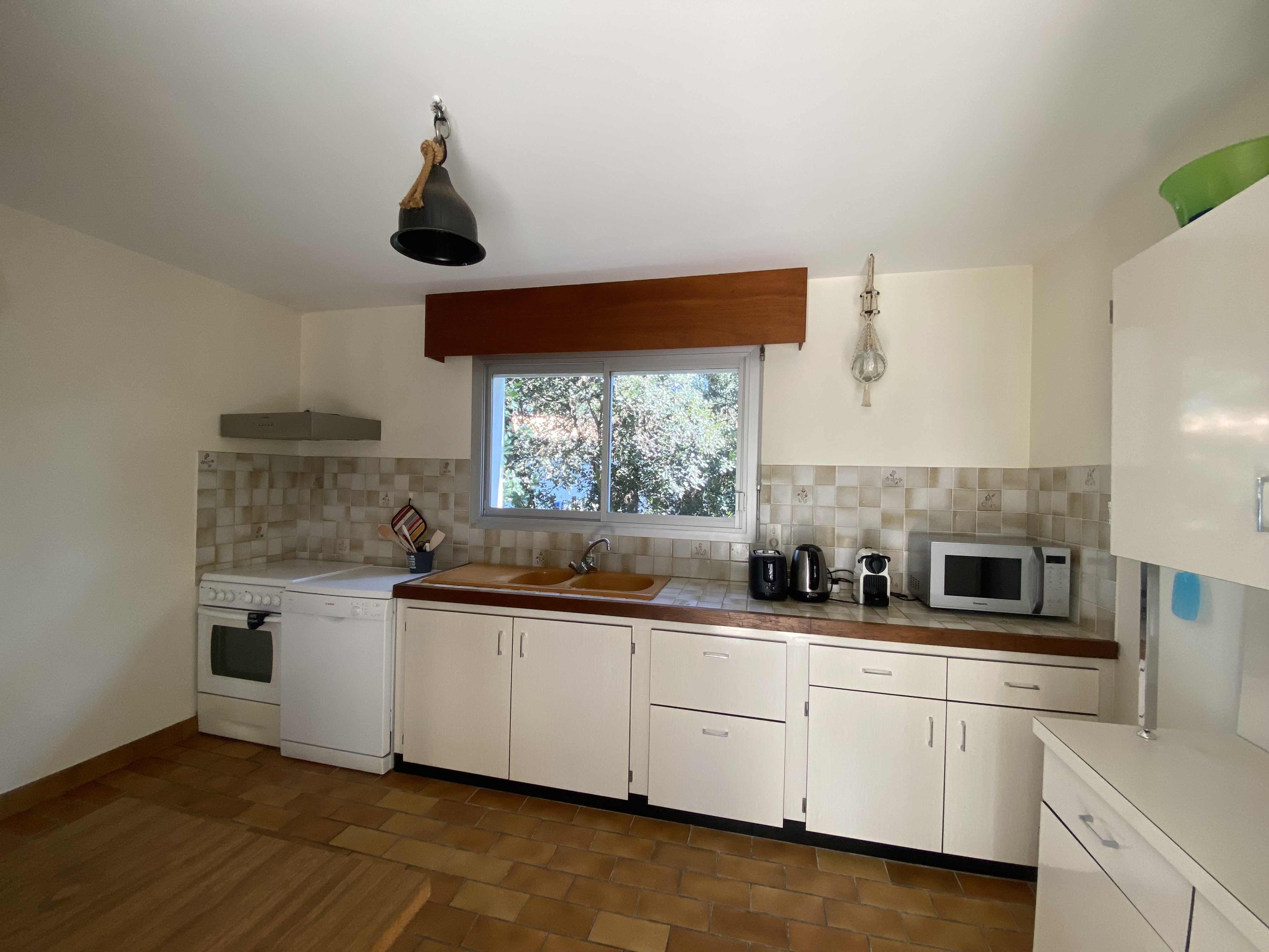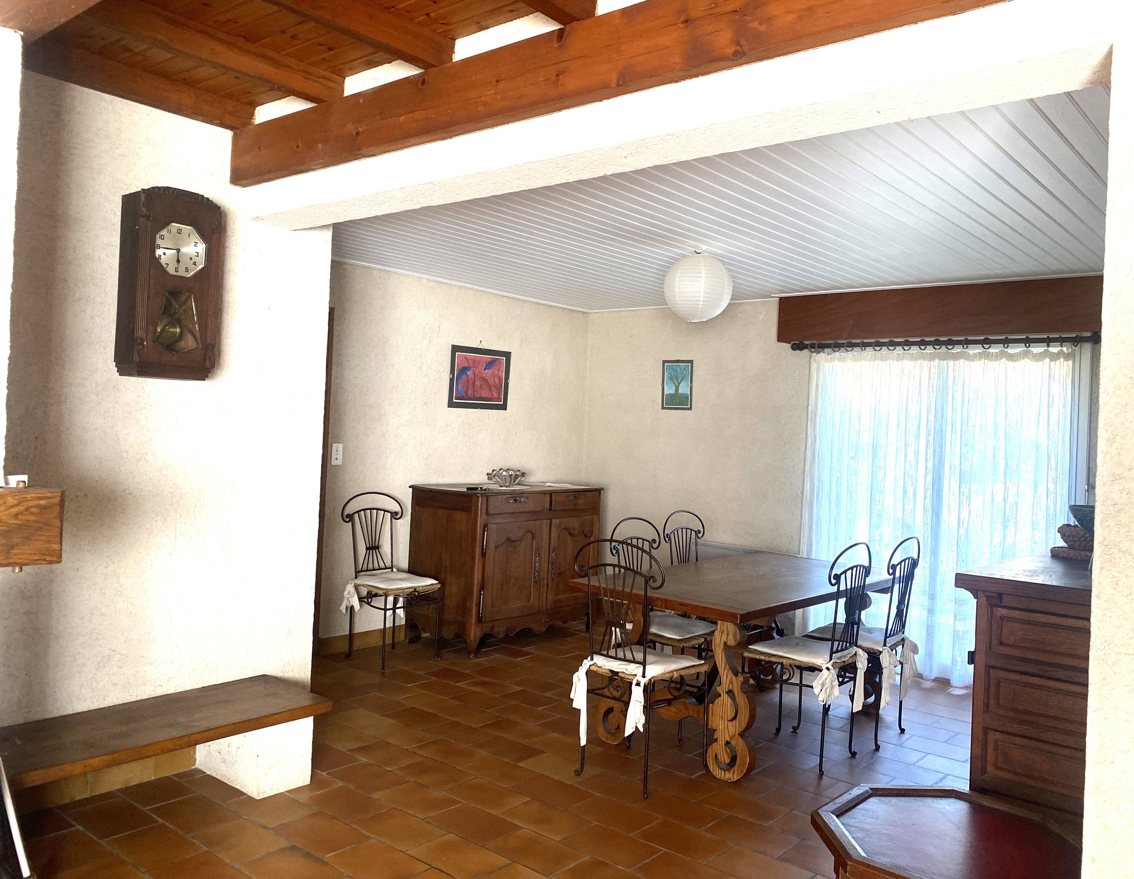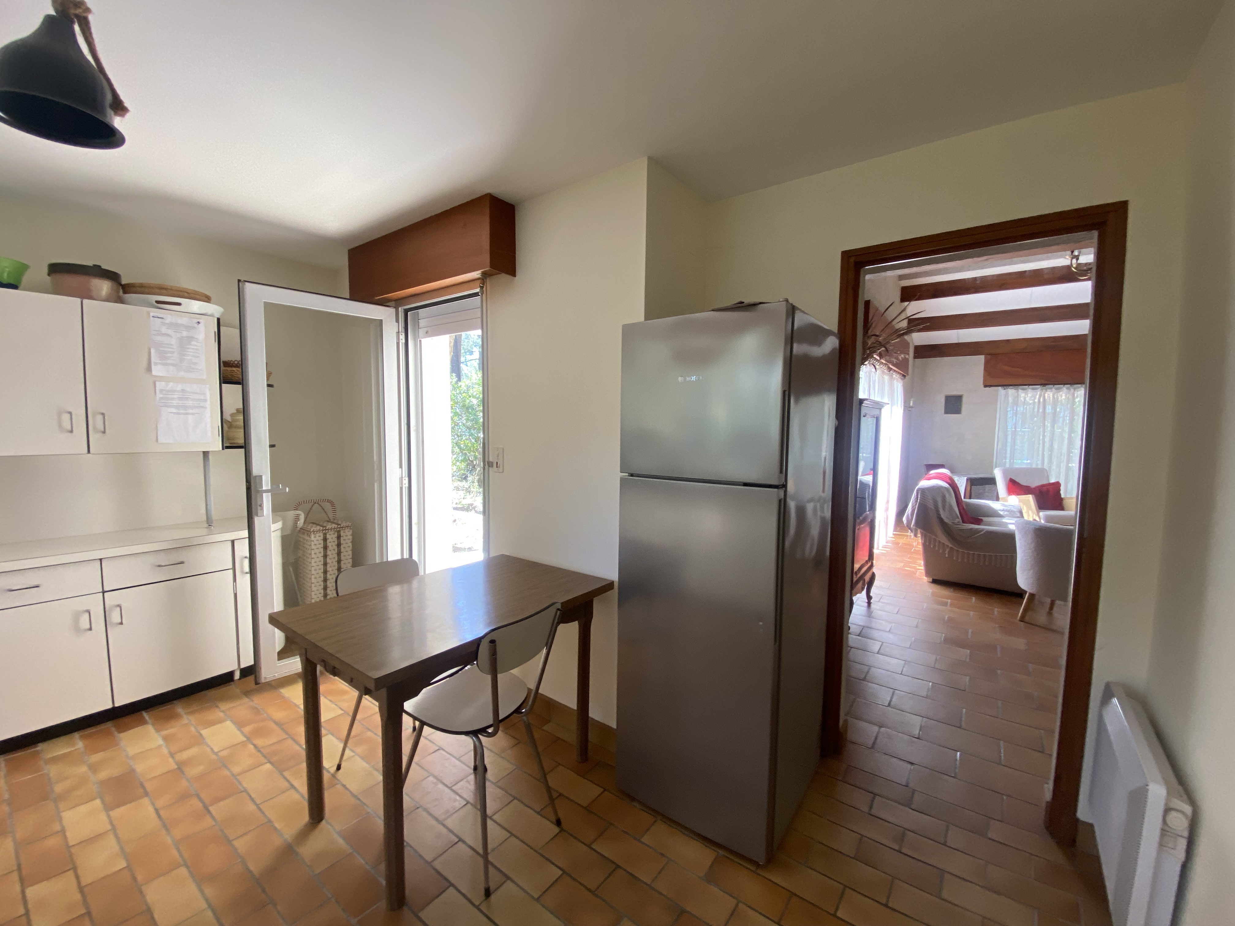 rez de chaussée : 1 salle à manger - salon, 1 cuisine donnant sur terrasse pour les repas sous préau et store banne. 1 salle d'eau (douche, lavabo) 1 wc séparé.
