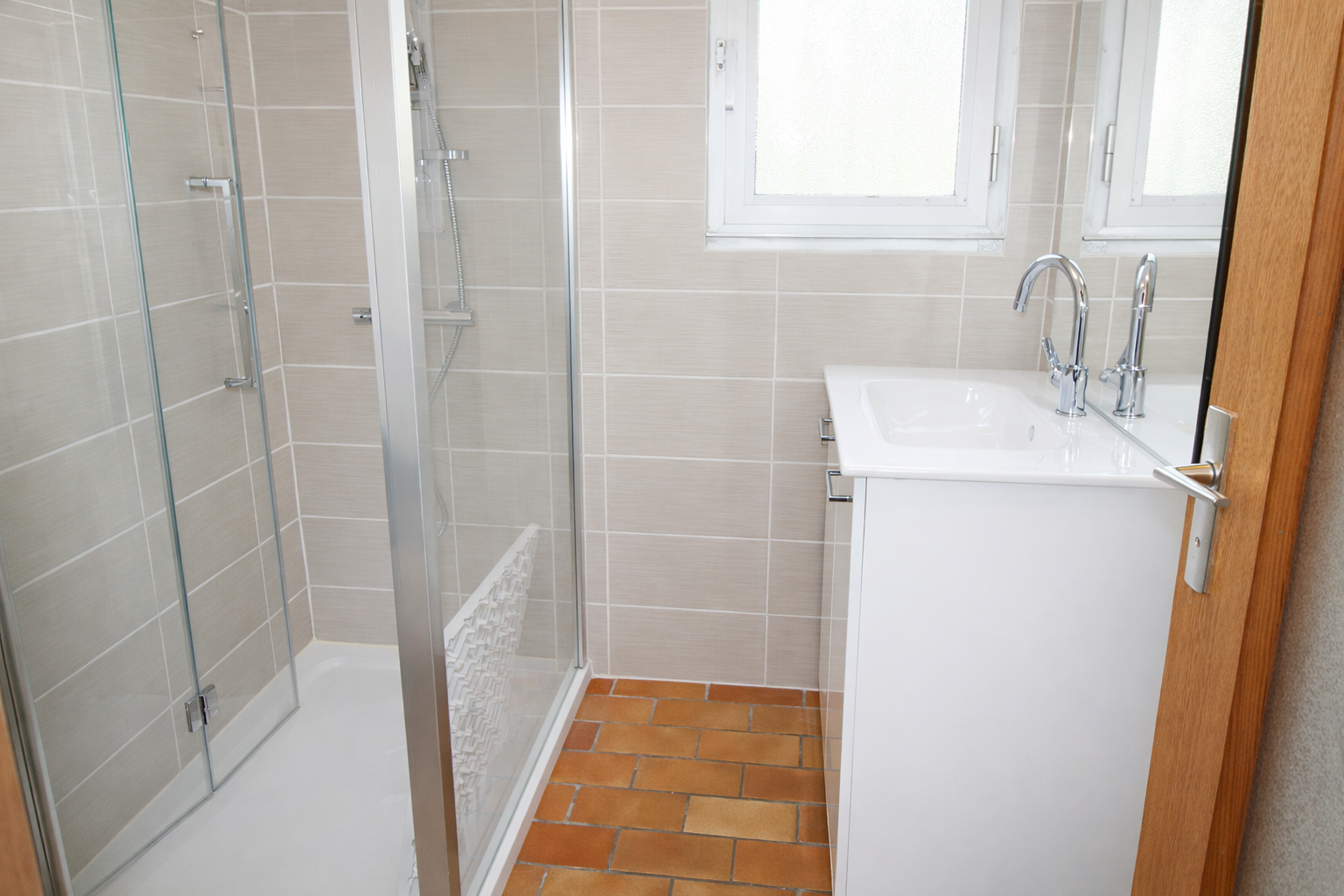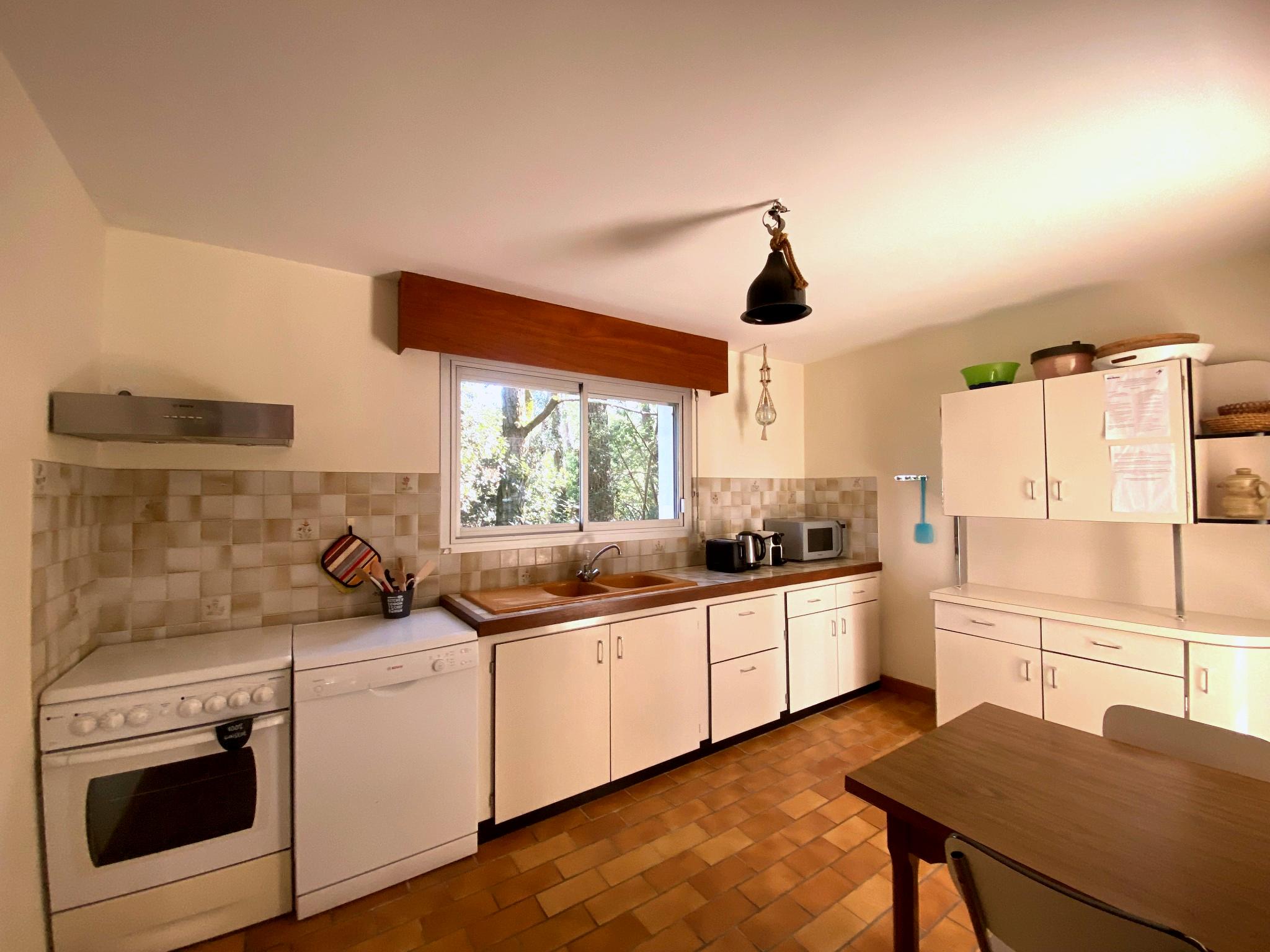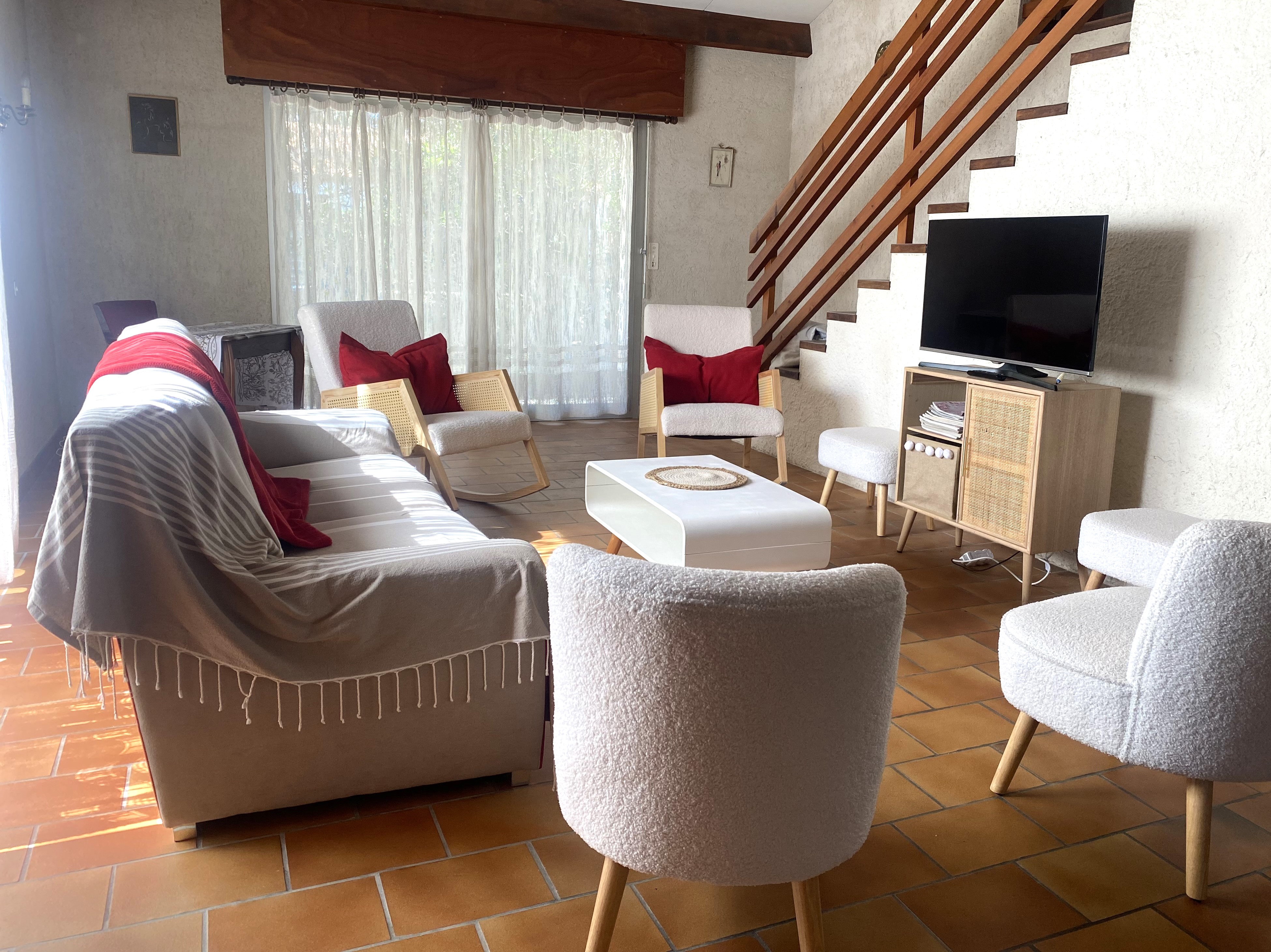 rez de chaussée : 1 salle à manger - salon, 1 cuisine donnant sur terrasse pour les repas sous préau et store banne. 1 salle d'eau (douche, lavabo) 1 wc séparé.