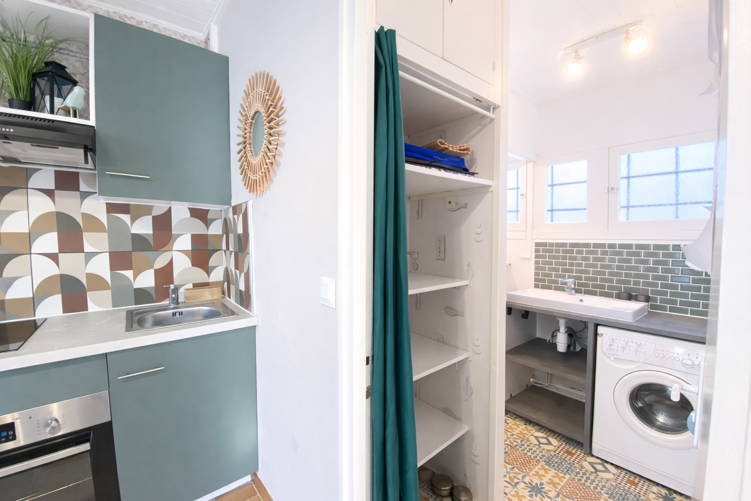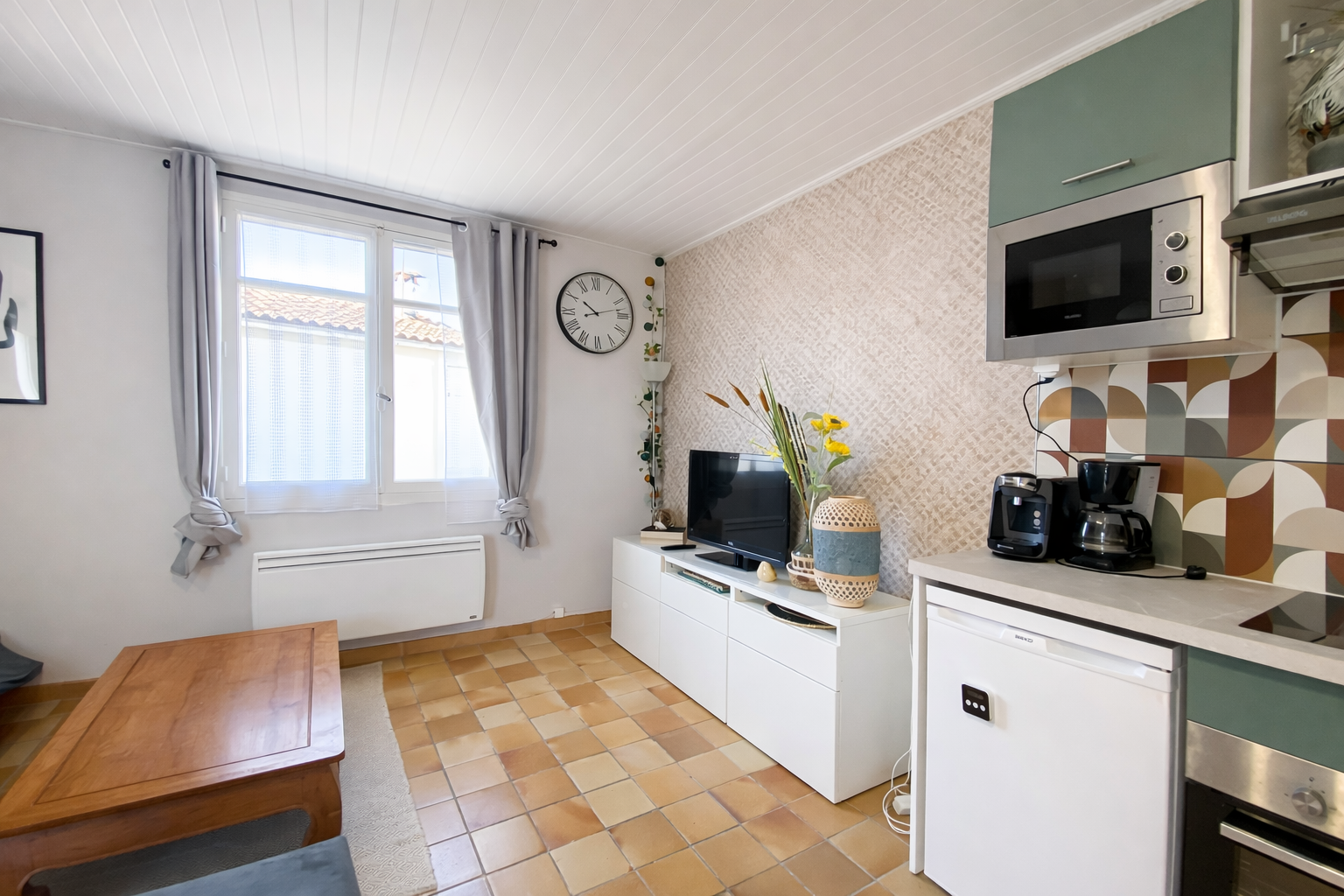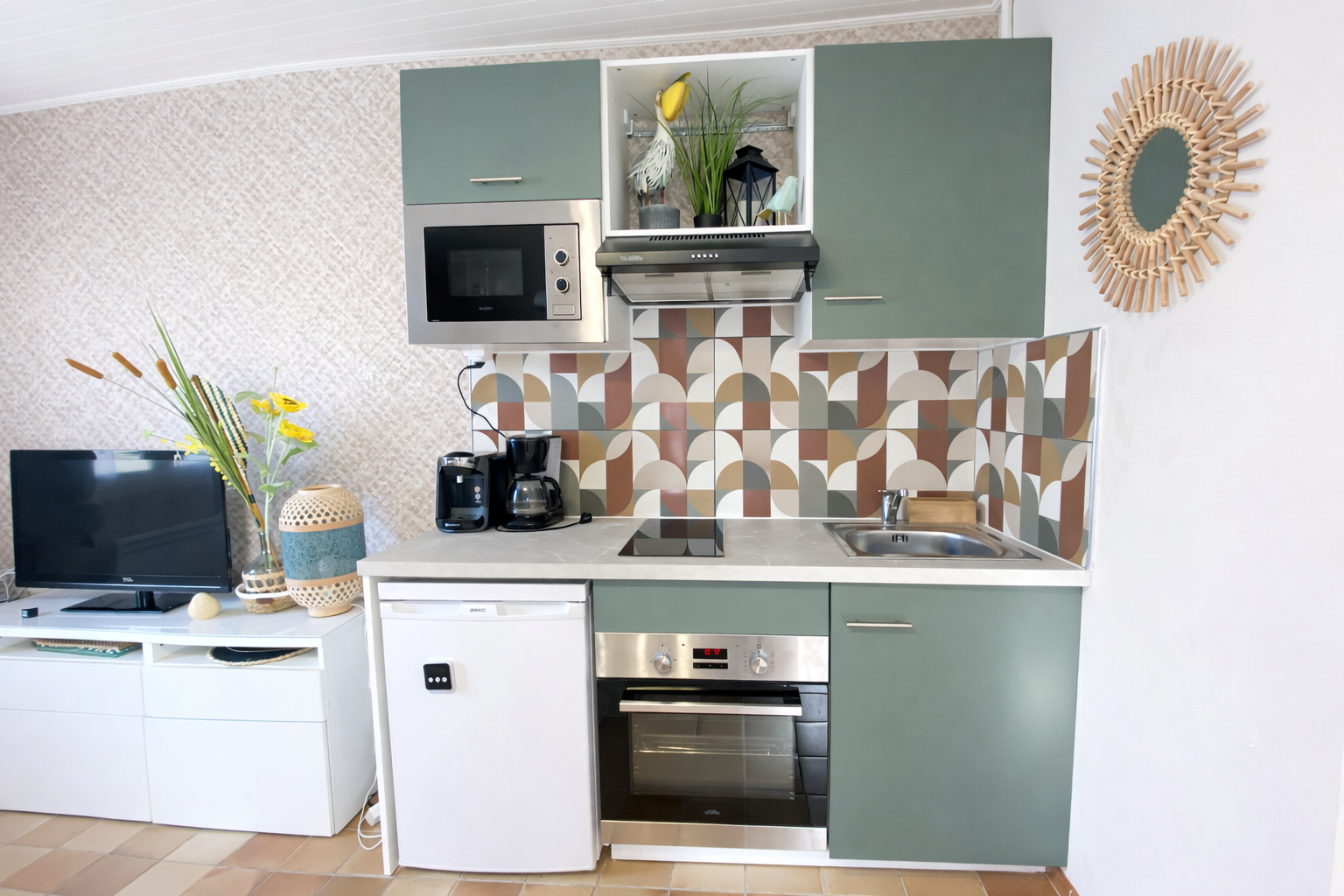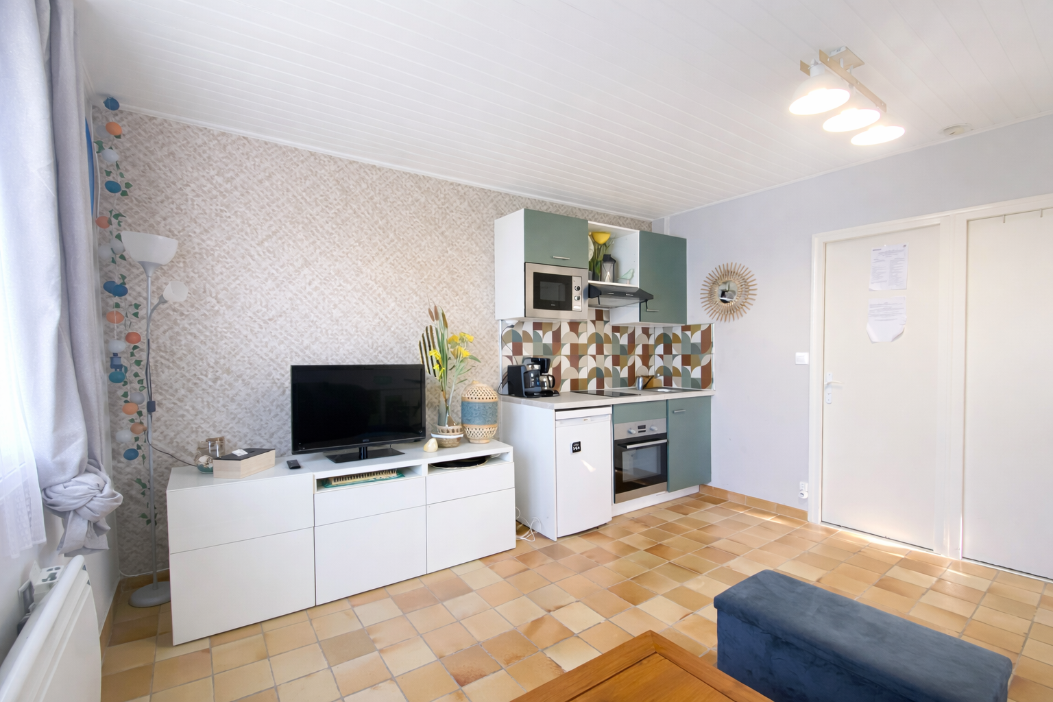 Composition . 1 canapé lit 2 personnes, 1 lave linge, 1 micro ondes, 1 four électrique, 1 plaque induction, 1 réfrigérateur, caf. électrique, vaisselle et couverts, télévision,