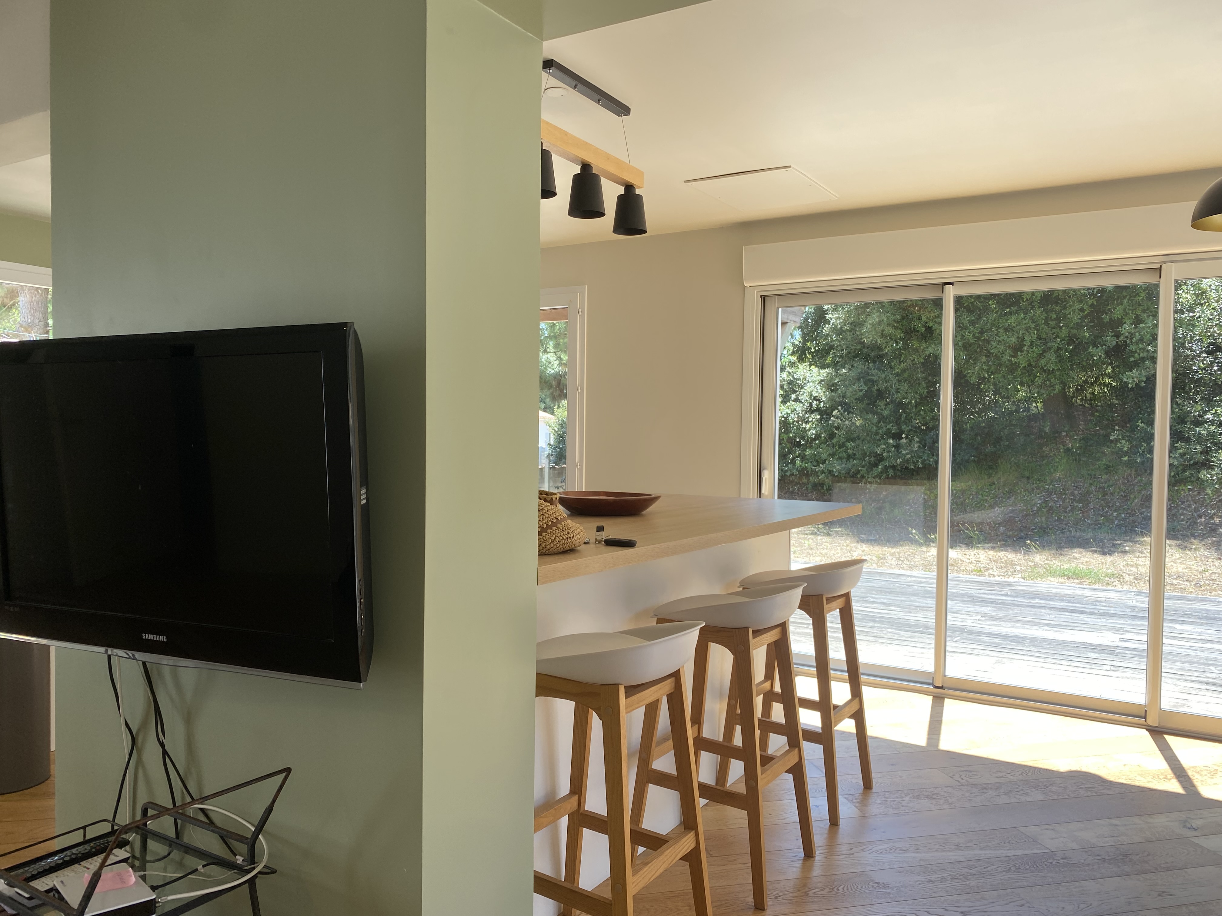 LA TRANCHE SUR MER, Le Phare, villa profitant d'une situation exceptionnelle dans les pins pour 6 personnes, dans un environnement naturel préservé, terrain en sable avec pins partiellement non clôturé. Une partie du terrain sur la dune avec des endroits en dénivelés : attention pour les enfants en bas âge. le rez de chaussée distribue une chambre avec 1 lit de 160 cm. salle d'eau (douche, lavabo), 1 wc. 1 grande pièce séjour-cuisine s'ouvrant sur la terrasse en bois, pouvant être glissante par temps de pluie, avec salon de jardin, l'étage avec 1chambre 2 lits de 0.80 et 1 chambre avec 2 lits de 0.80 . salle d'eau avec wc. Equipements : Réfrigérateur-congélateur, 1 micro ondes, four électrique, 4 plaques gaz, 1 lave vaisselle, canapé, télévision. lave linge. parking facile pour les voitures sur le terrain privé. Poêle décoratif.
